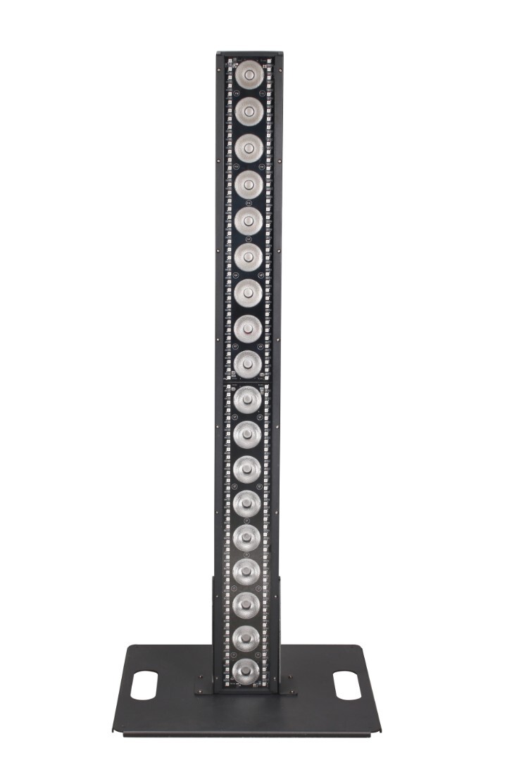 Источник света 18 светодиодов по 30 Вт RGBWAUV и 160 по 0.5W RGB LED. Угол раскрытия луча 20° опционально на выбор 6°/10°/12°/15°/25°/40°. Управление DMX512: 9/228/66/37/20/86 каналов (независимое управление каждым диодом), встроенные программы, RDM. Конвекционное охлаждение. Влагозащищенный корпус и разъёмы IP65. Потребление 400Вт. Крепление на 2 лиры. Возможность соединения в линию и вертикаль. Габариты 1000 х 85 х 100мм. Вес 8,55 кг. Опционально: рассеивающий фильтр, крепление для вертикальной установки.