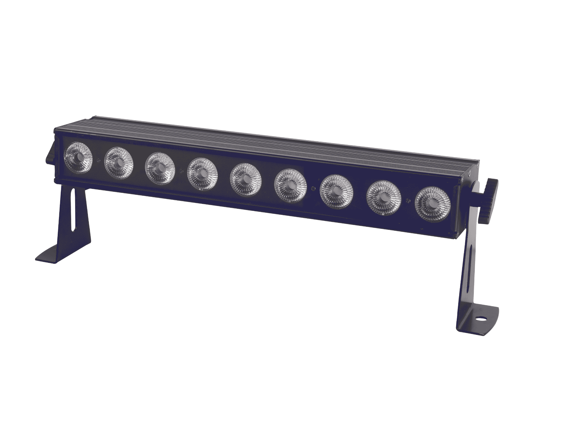 Прожектор, 9 светодиодов 6 в 1 RGBWAUV по 15 Вт. Электронный диммер 0-100%. Строб. Угол луча 15°. Управление: DMX512 6/10, звуковая активация, автоматический режим, master/slave. Питание: AC110-250В 50-60 Гц. Габариты: 575х85х195 мм, вес: 3.8 кг.
