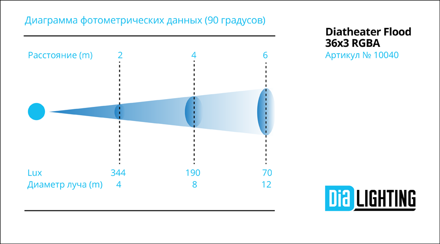 Театральный прибор с асимметричным отражателем. Источник света: 36x3W LED (R9, G9, В9, A9). Питание: AC90-250В 50-60 Гц, потребляемая мощность 100Вт. Срок службы LED: 60000 часов, Угол раскрытия луча: 90°. Вес 4.9 кг. Размеры 295x245x180 мм.