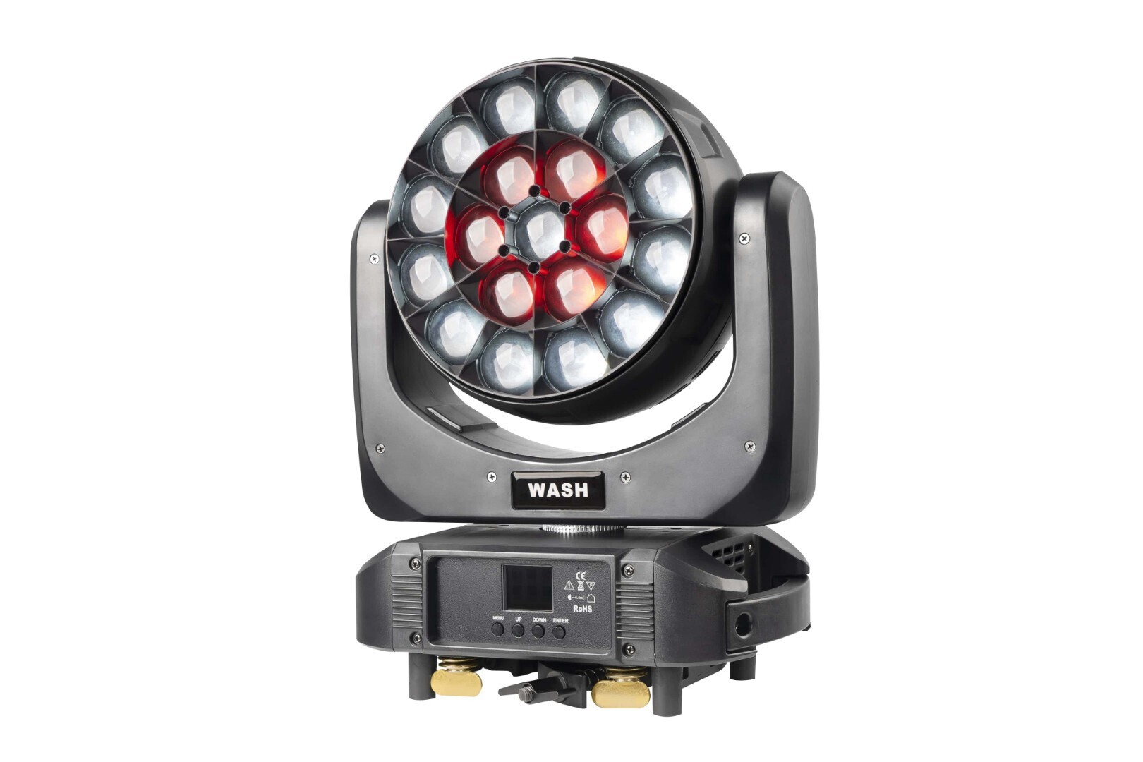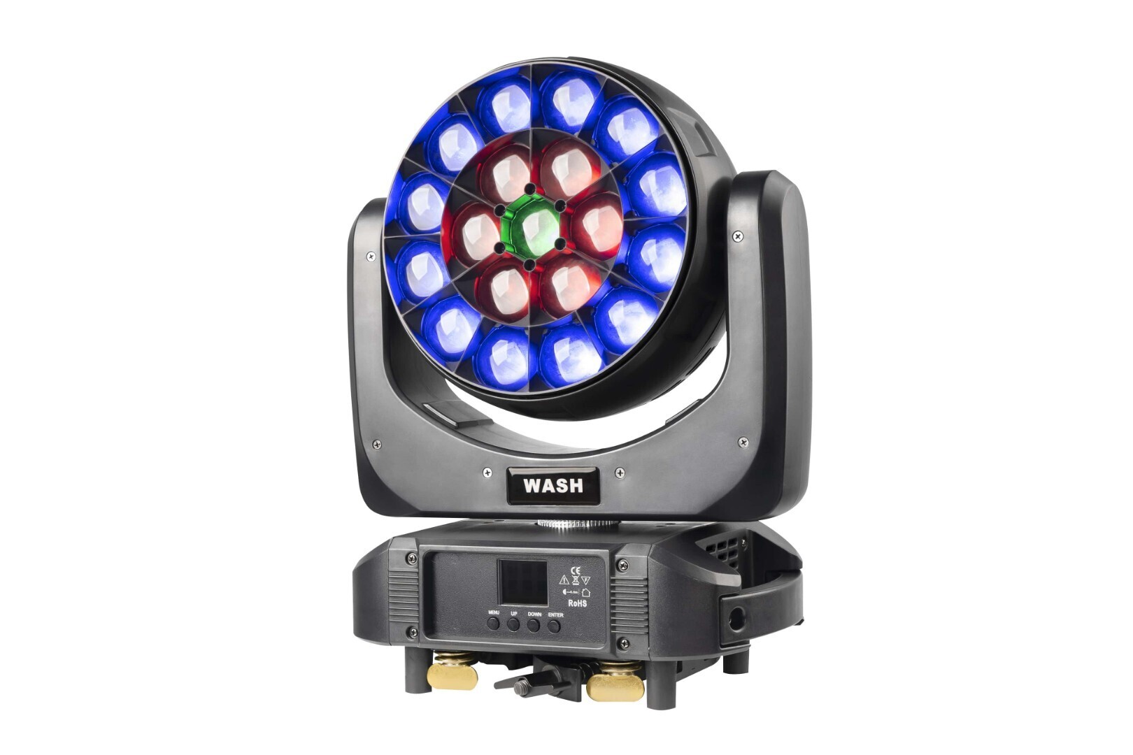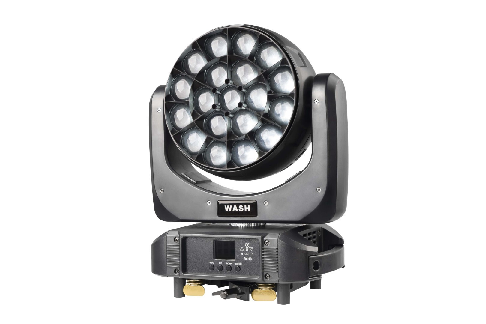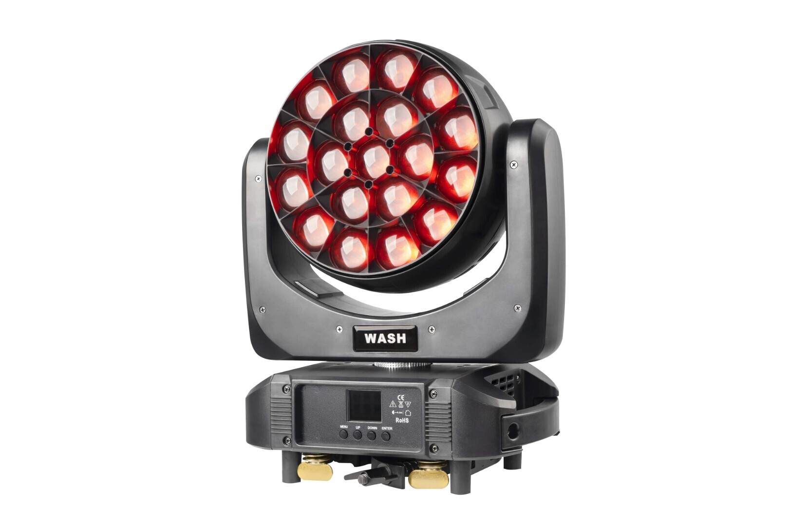 Вращающаяся голова Wash. Источник света 19 по 20 Вт светодиодов RGBW. Zoom: линейный от 5,8° до 55°. Вращение Раn : 540°; Tilt 270°. Электронный диммер 0-100%. Управление: DMX 19/27 каналов, звуковая активация, автоматический режим, master/slave. Питание: 100-240В 50/60Гц. Потребление: 350 Вт. Габариты: 338 х 254 х 375 мм. Вес: 8,5 кг.