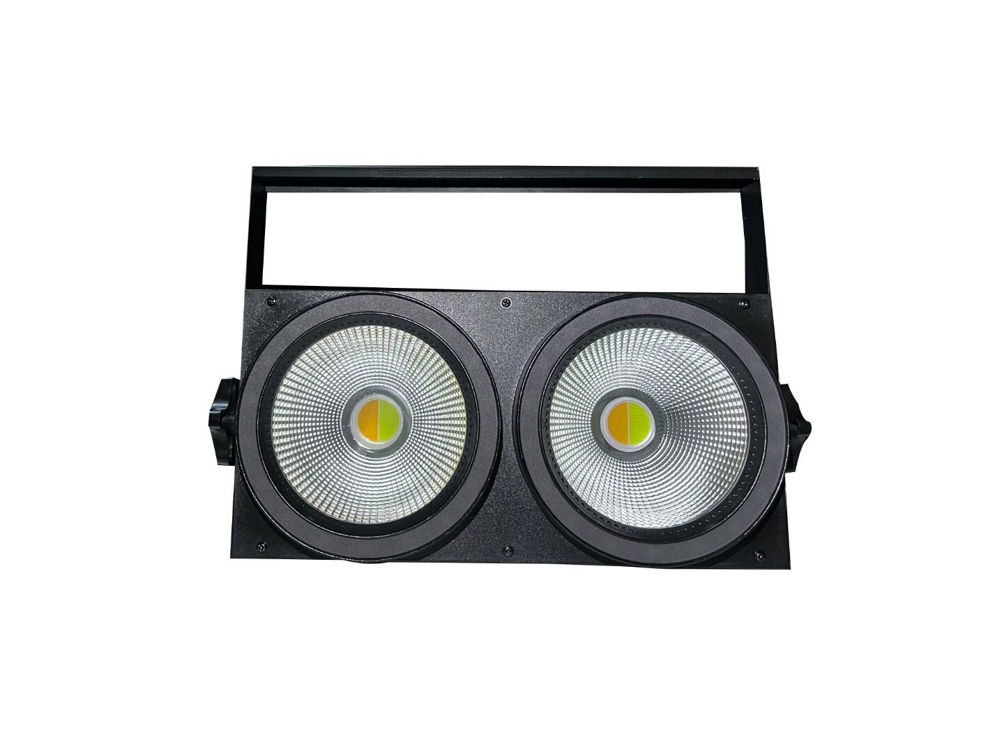 Профессиональный блайндер. Два мощных белых COB светодиода по100 Вт каждый (CC\WW) + 72 по 0.2 Вт RGB. Управление DMX512: 10/26. Раздельное управление основными диодами по 100Вт, подсветкой отражателей и кольцевой подсветкой. Угол раскрытия 60 градусов. Питание 100-240В, 50/60Гц. Габариты 430*230*240 мм, вес 5 кг.