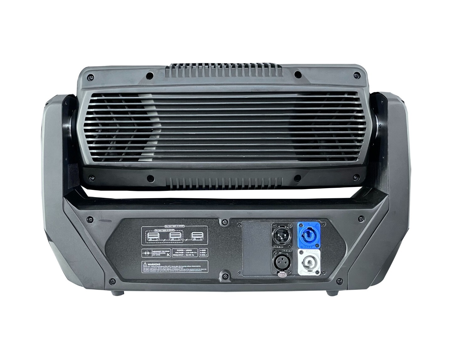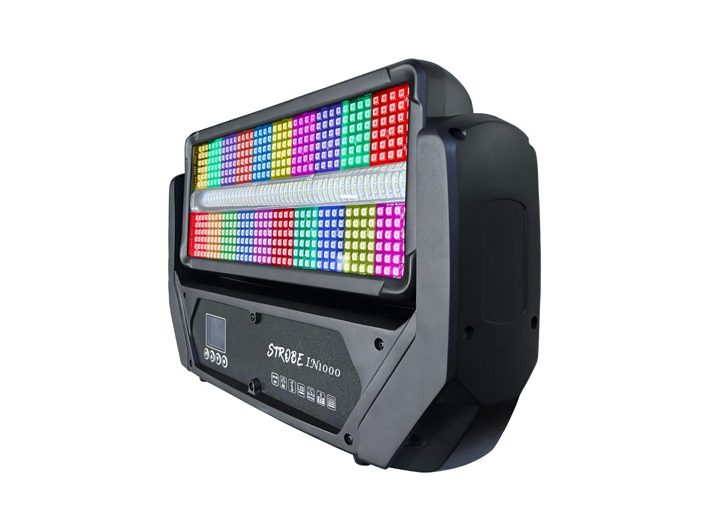 Светодиодный стробоскоп. Источник света: 144шт белых 5Вт Cold White + Amber светодиодов и 480шт по 1.5 Вт RGB светодиодов. Управление по DMX (10 / 20 / 77) каналов, автопрограммы. Угол раскрытия луча 120°. Разъёмы управления вход\выход: XLR 3-Pin или 5-Pin (опционально). Разъёмы питания вход \ выход: PowerCON. Большое количество предустановленных программ. Максимальное потребление 1000 Вт. Движение по TILT 185°.Габариты 448 х 122 х 292мм. Вес 8.5 кг.