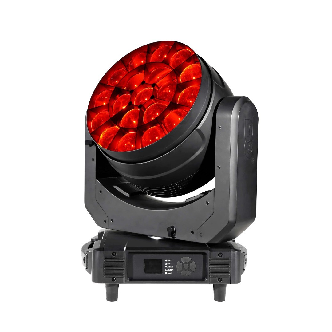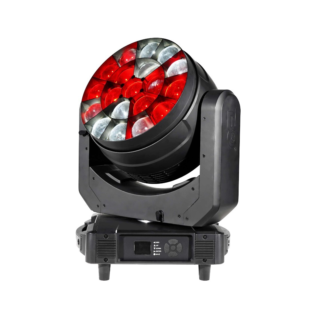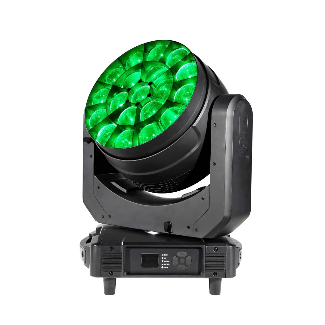 Вращающаяся голова Wash с попиксельным управлением и эффектом B-EYE. Zoom: от 4,5° до 43°, 19 светодиодов RGBW по 60 Вт каждый. Димер 0-100%. Строб 0-25 вспышек в секунду. Управление: DMX512 (21/ 23/ 35/ 78/ 92/ 97/ 99), звуковая активация, автоматический режим, master/slave. Передняя линза имеет непрерывное вращение - эффект b-eye. Вращение Раn : 540°; Tilt 270°. Разъёмы питания Powercon, управления XLR 3 pin, Art-net (RJ45) опционально. Потребление: 1150Вт. Габариты: 421 х 315 х 448. Вес: 21.2 кг.