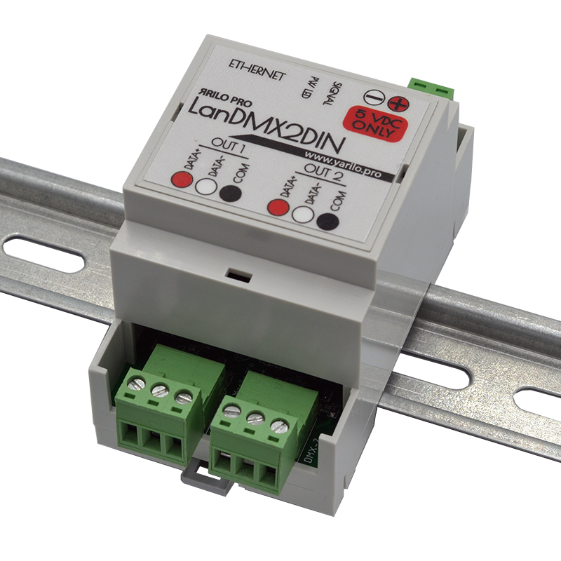 ЯRILO LANdmx2DIN - Art-Net DMX конвертер компании ЯRILO Pro на два выхода DMX. LANdmx2 принимает 2 потока DMX по локальной сети и выводит на 2 изолированных выхода DMX-512. Создан специально для стационарных инсталляций и архитектурной подсветки для установки на DIN-рейку на 2 вселенные DMX (до 1024 каналов).