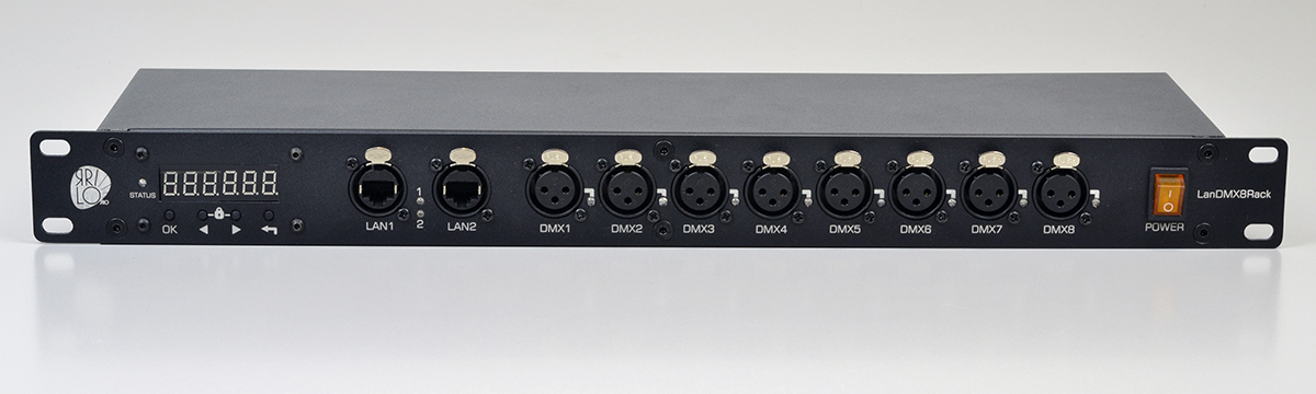 LanDMX8Rack предназначен для установки в стойку 19 дюймов и занимает 1U (высота 44,45 мм). Питание прибора осуществляется от сети переменного тока 230В через разъем стандарта PowerCON. На задней панели, рядом с разъемом питания расположен транзитный выход питания стандарта PowerCON. Прибор имеет восемь выходных XLR-3 разъемов (возможно поставка с XLR-5). Встроенный Ethernet-коммутатор на два порта облегчает подключение приборов в локальной сети. На передней панели LanDMX8Rack расположен сегментный светодиодный экран, четыре кнопки управления и светодиодный индикатор режима работы (светодиод STATUS). Около каждого XLR разъема находится светодиод активности выходного порта.