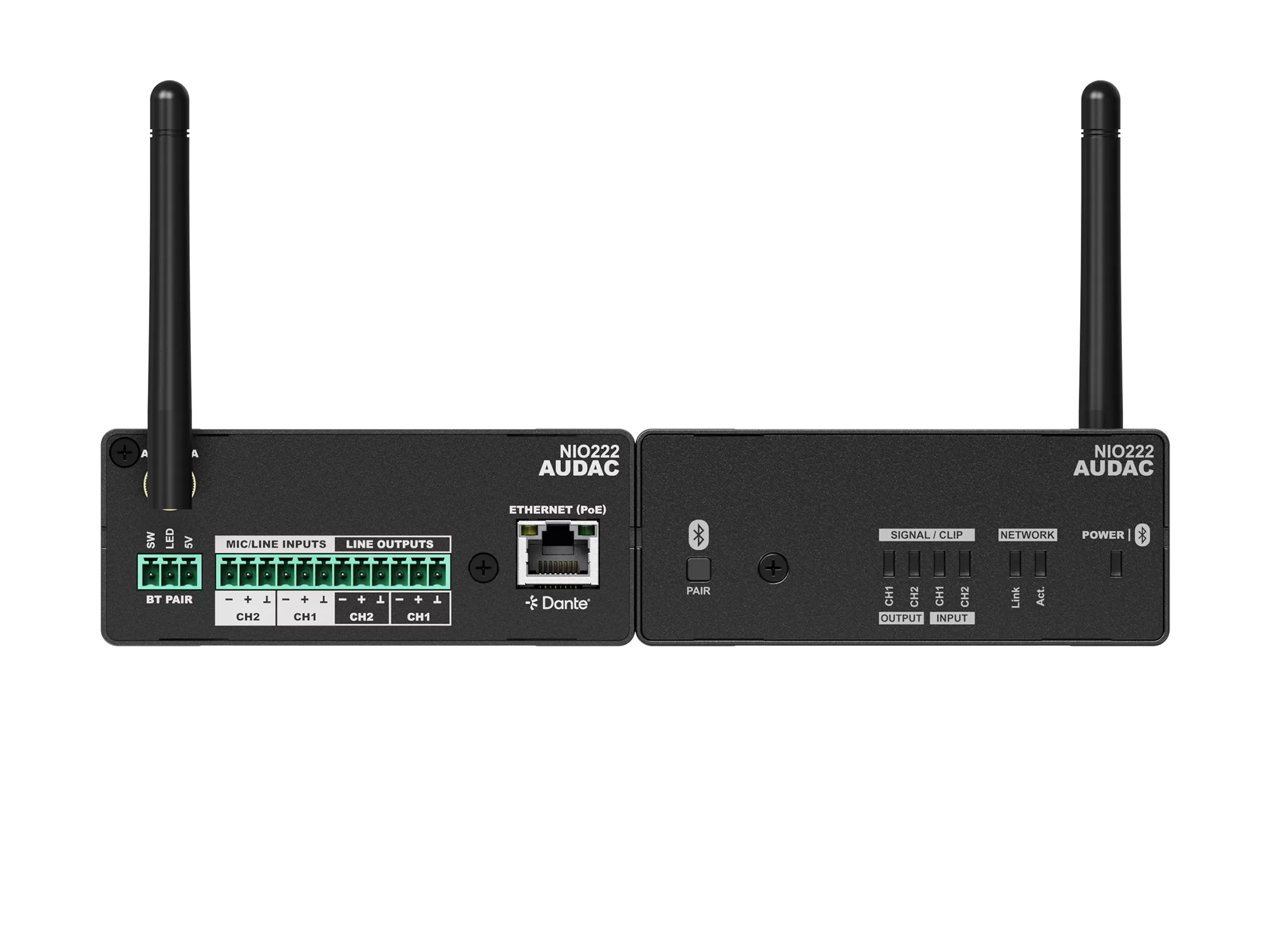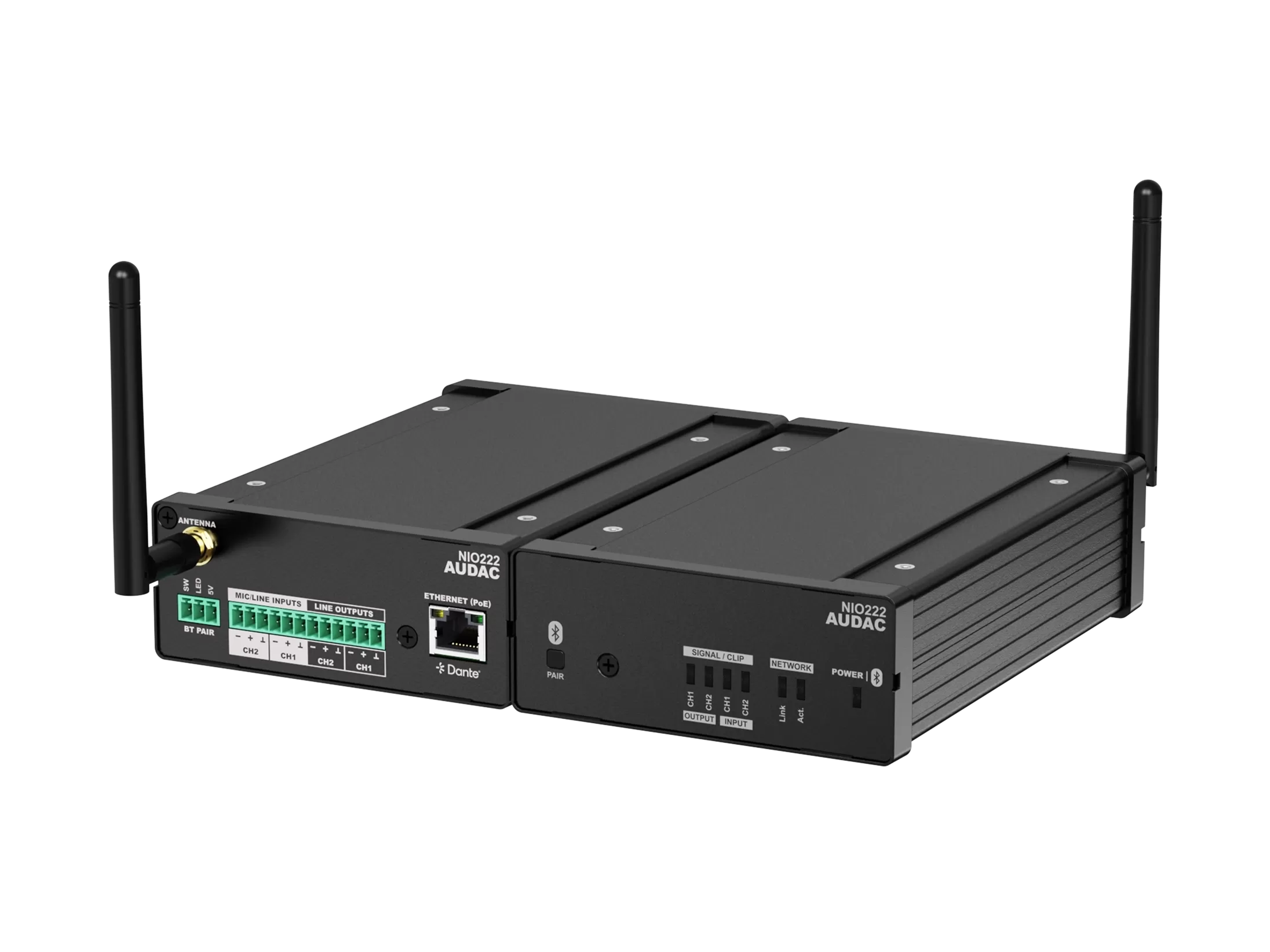 AUDAC NIO222 - матричный коммутационный блок Dante™/AES67 с возможностью микширования и обработки сигнала — 2 микрофонных/линейных входа 2 балансных линейных выхода