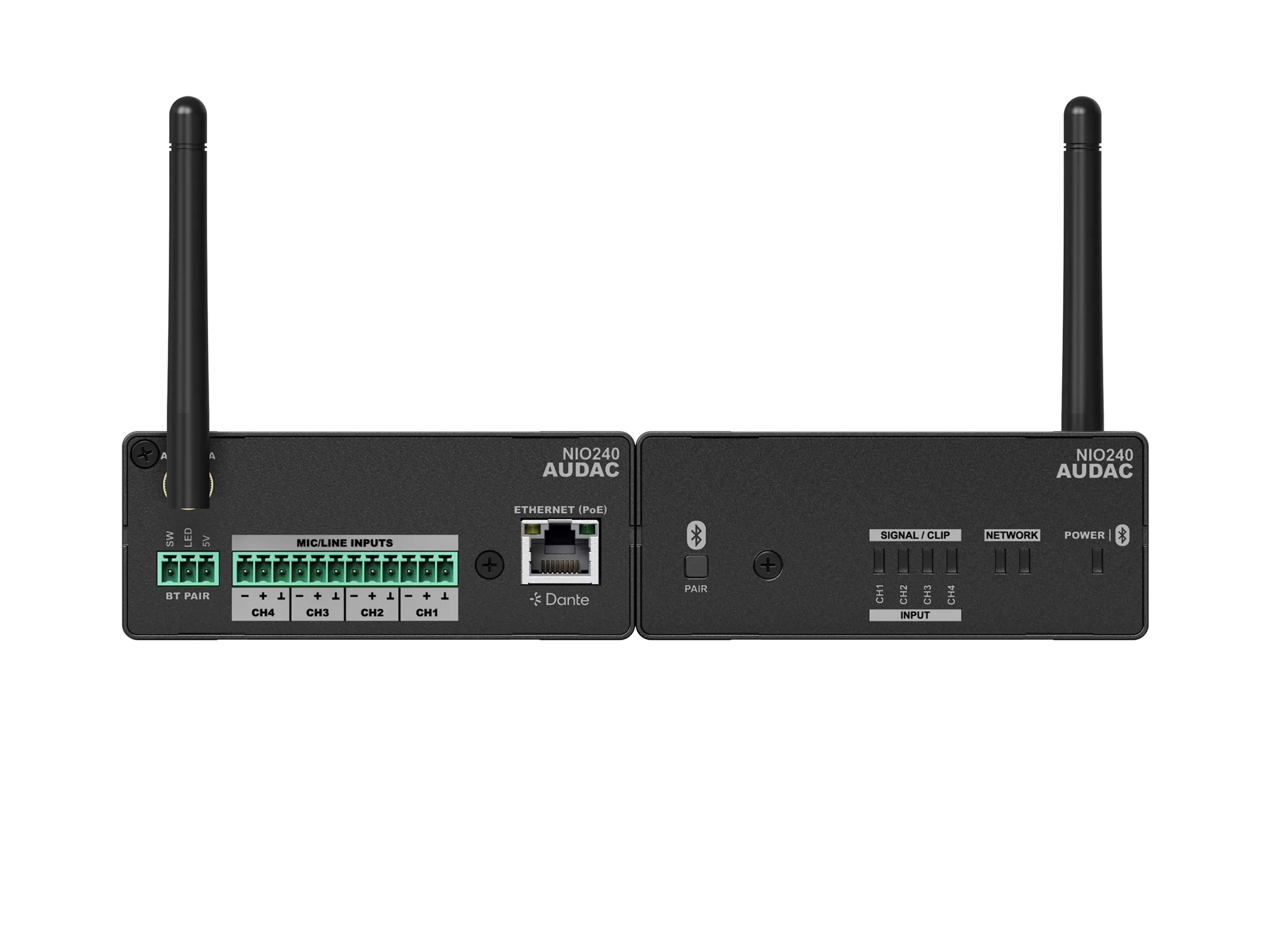 AUDAC NIO240 - матричный коммутационный блок Dante™/AES67 с возможностью микширования и обработки сигнала — 4 микрофонных/линейных входа