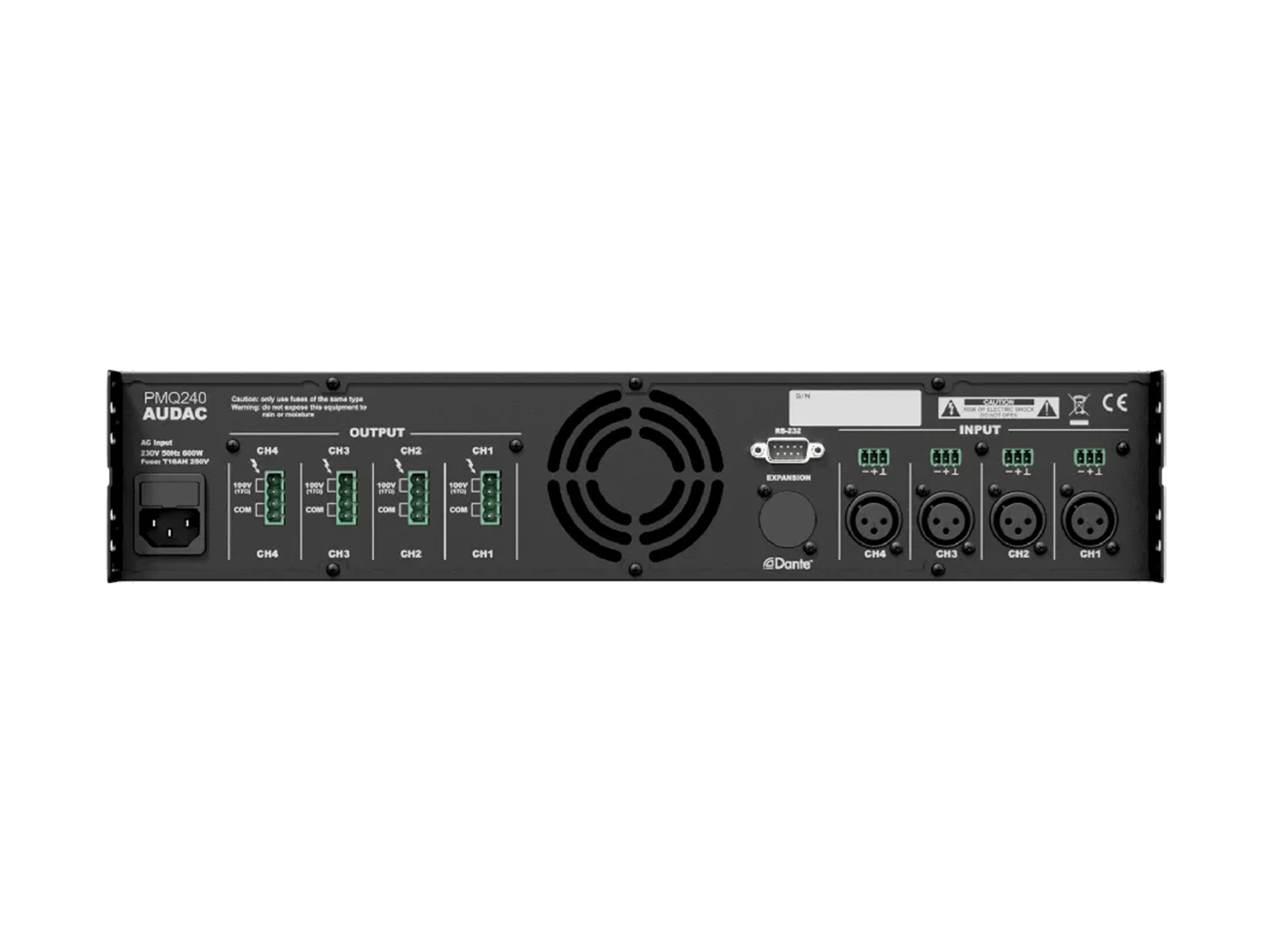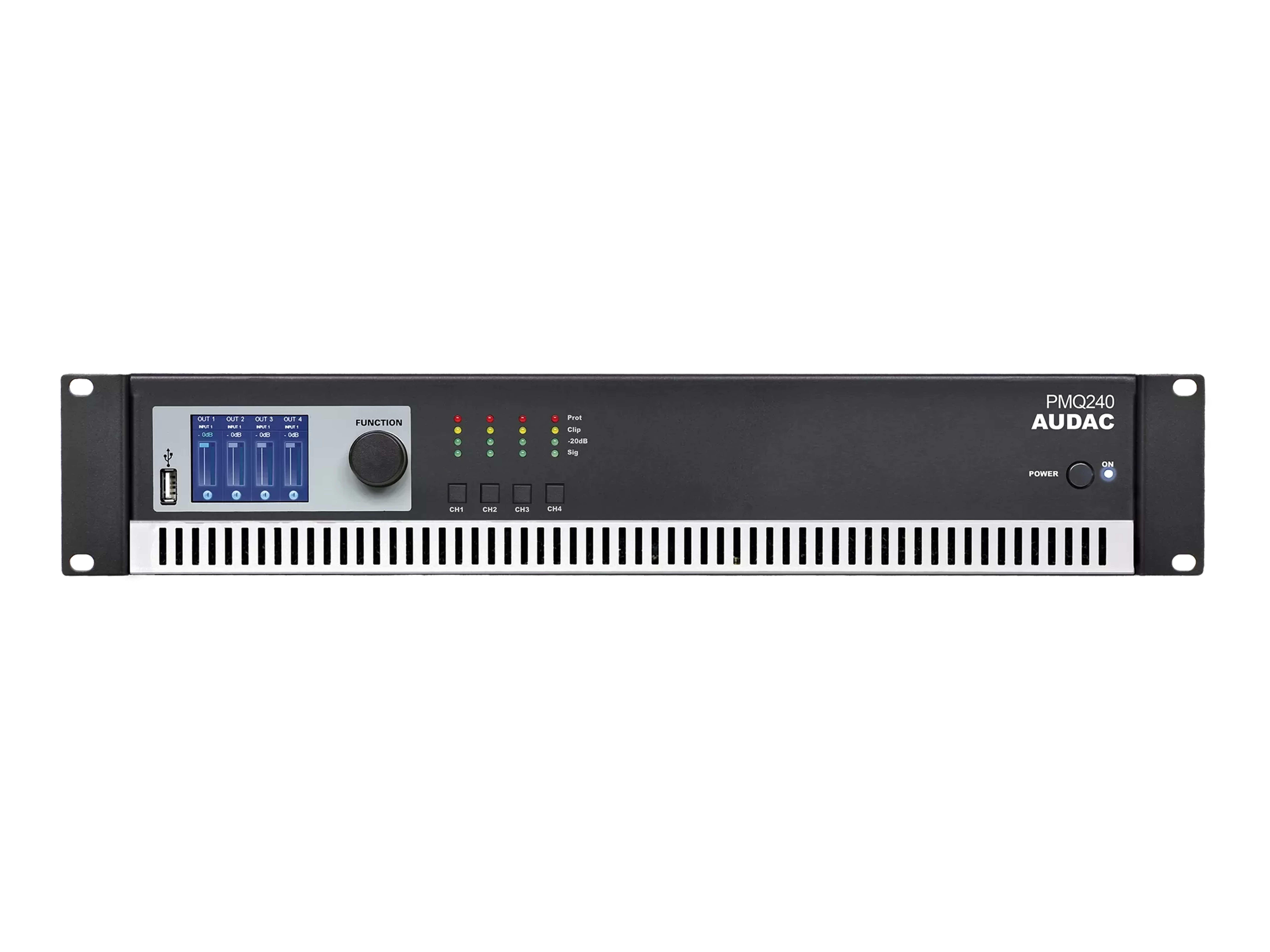 AUDAC PMQ240 - четырехканальный трансляционный усилитель с DSP. Опционально предусмотрена установка карты интерфейса DANTE. Мощность (@100В): 4 x 240 Вт.