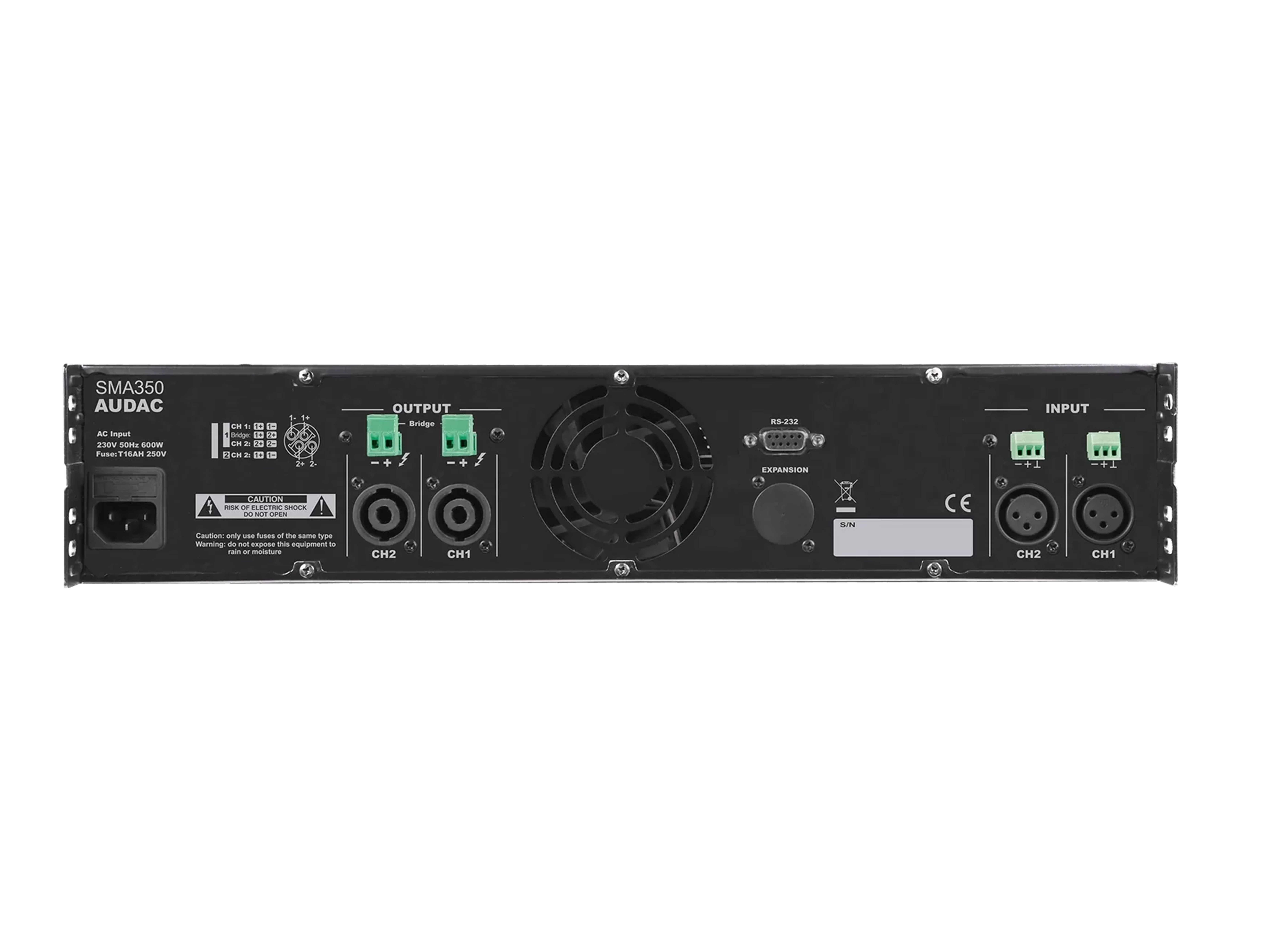 AUDAC SMA350 - двухканальный низкоомный усилитель с DSP. Опционально предусмотрена установка карты интерфейса DANTE. Мощность (@4 Ом): 2 x 350 Вт