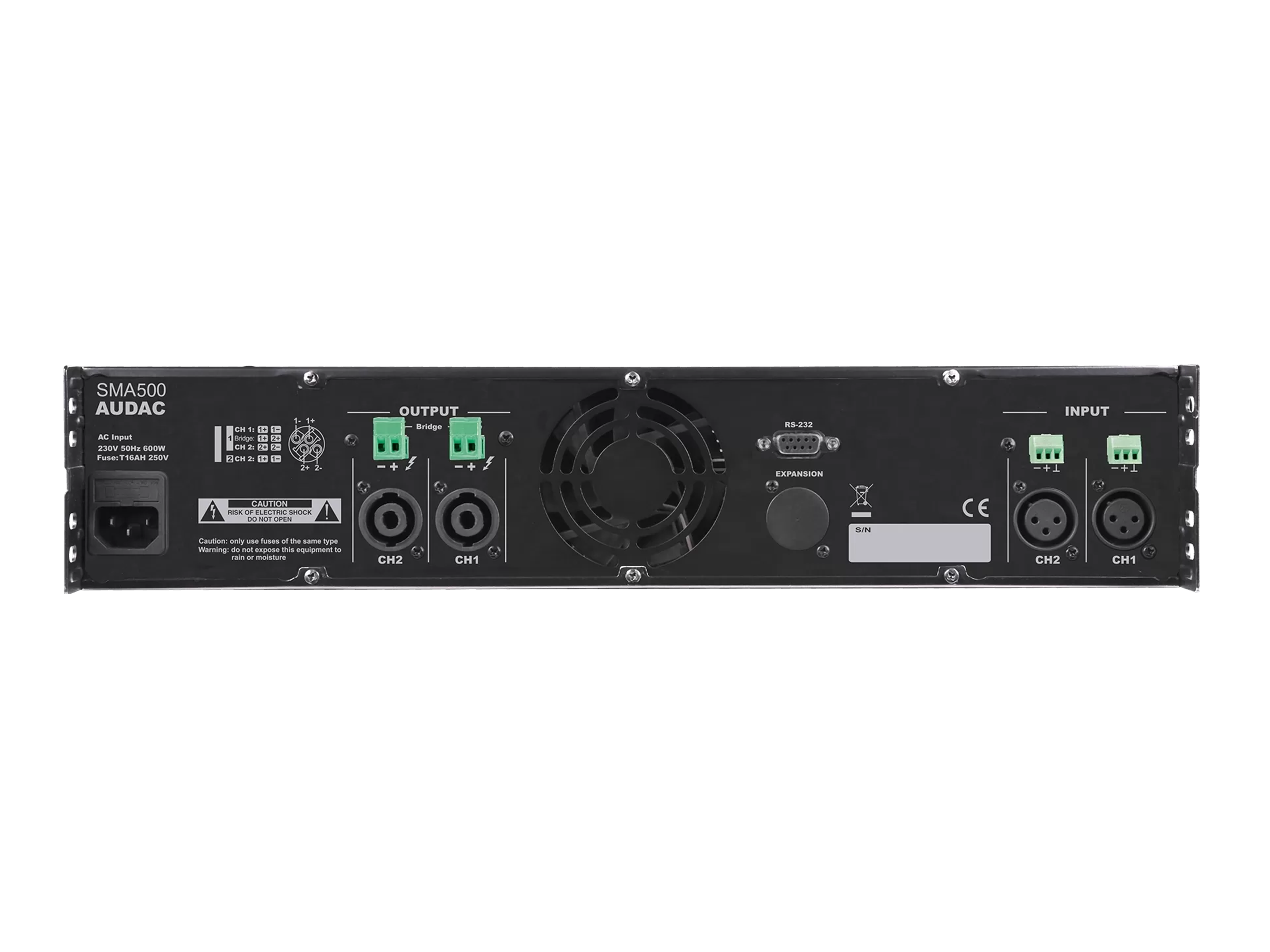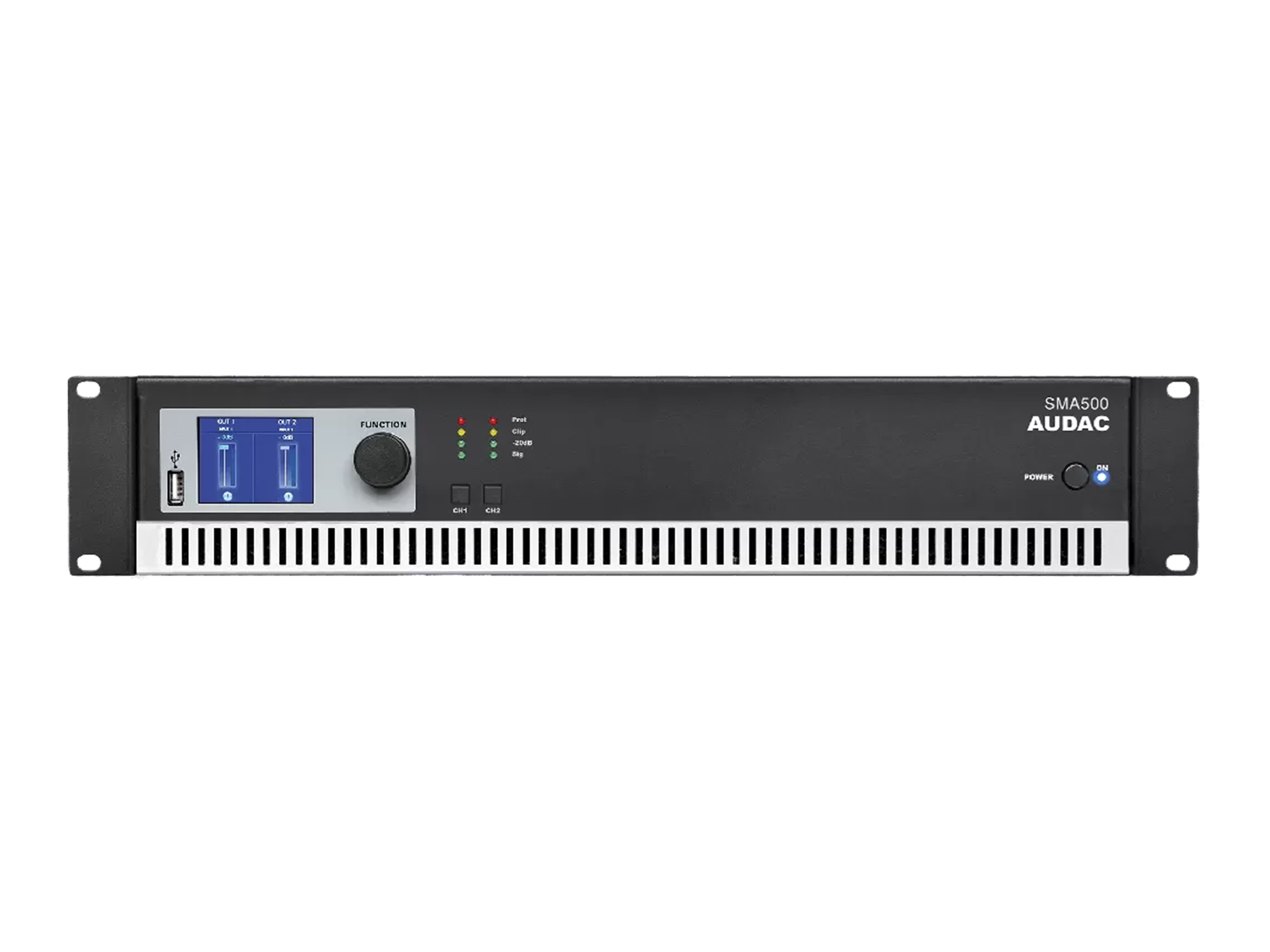 AUDAC SMA500 - двухканальный низкоомный усилитель с DSP. Опционально предусмотрена установка карты интерфейса DANTE. Мощность (@4 Ом): 2 x 500 Вт.