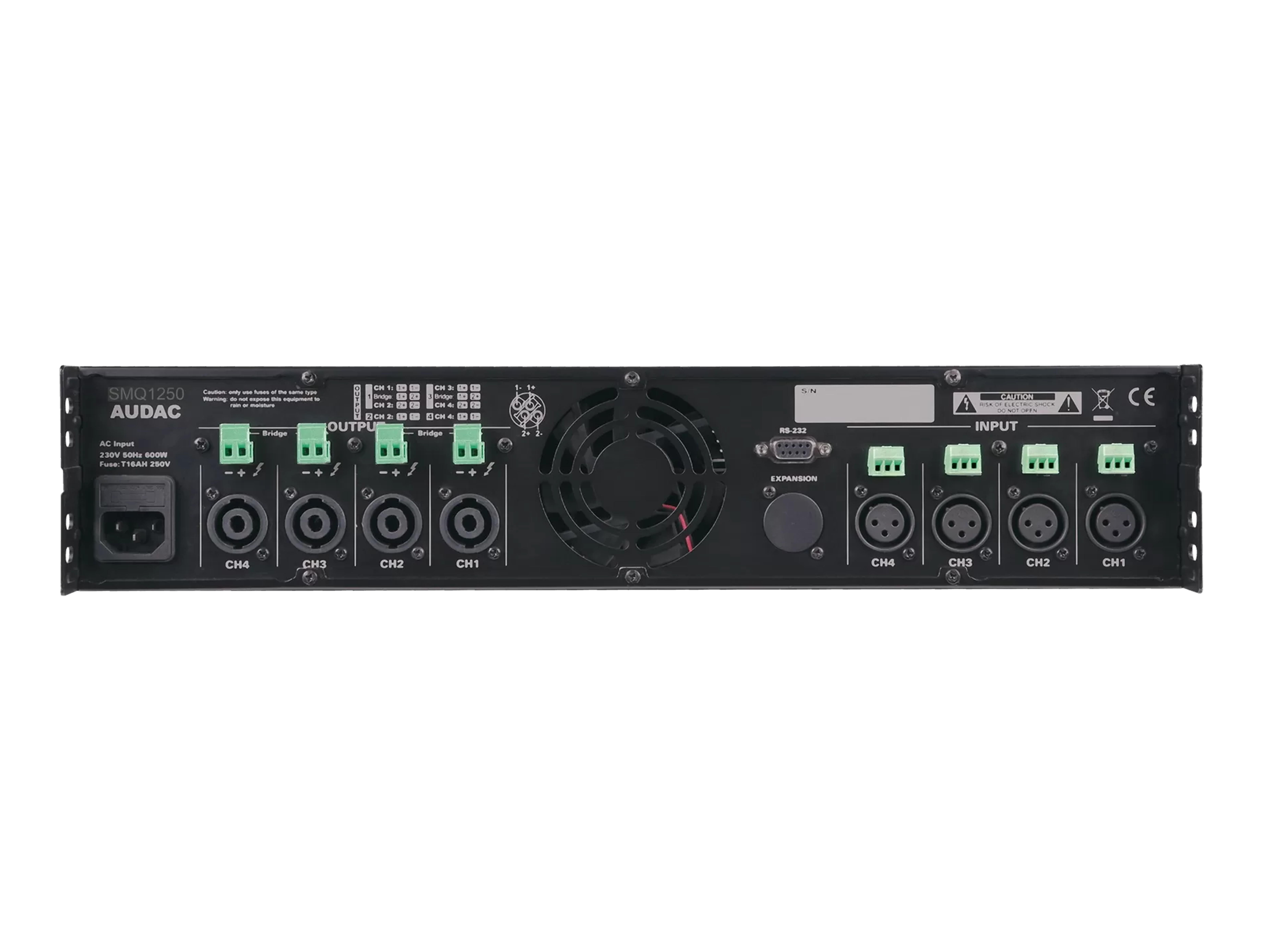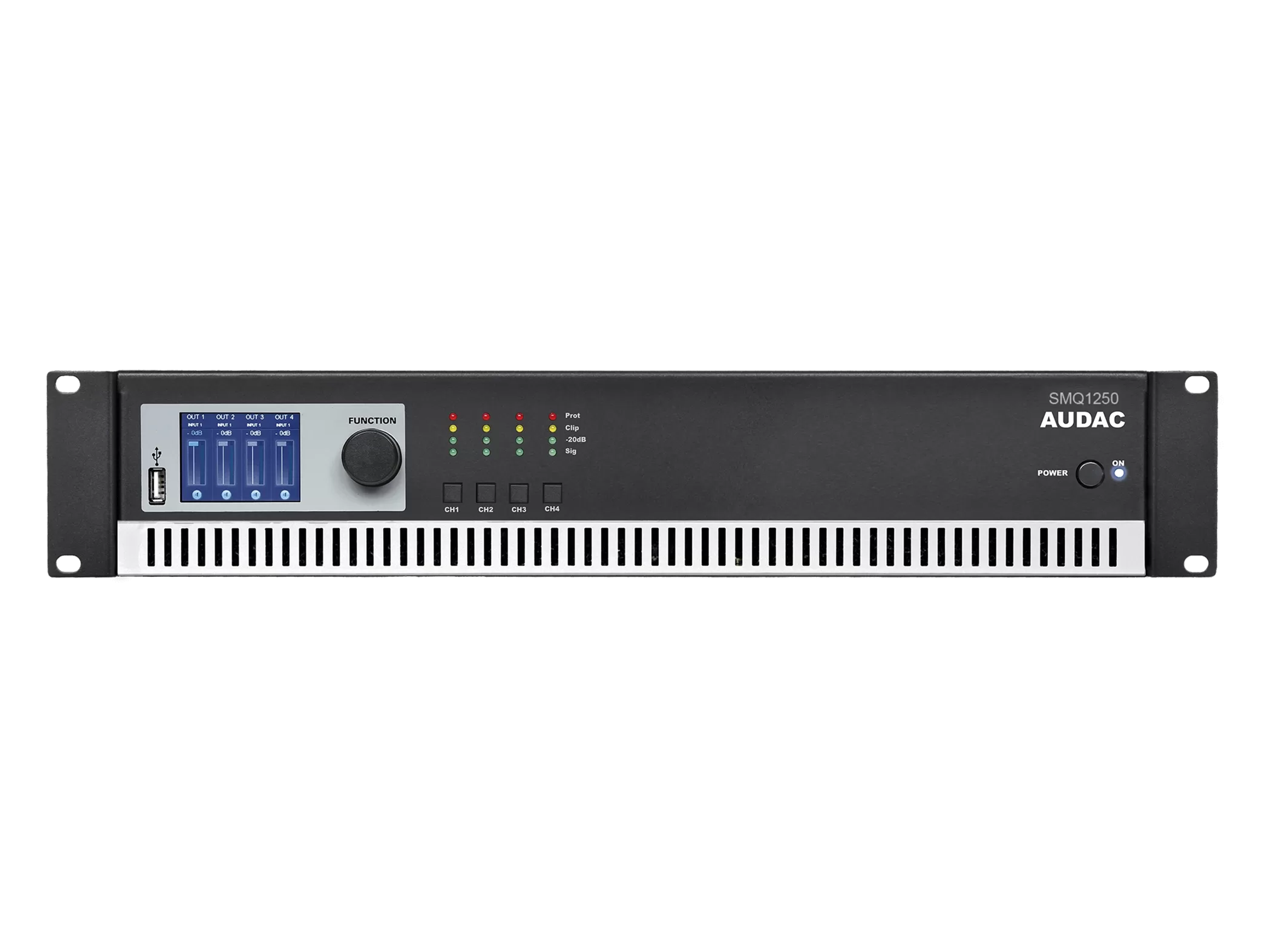 AUDAC SMQ1250 - четырехканальный низкоомный усилитель с DSP. Мощность (@8 Ом): 4 x 630 Вт. Мощность (@4 Ом): 4 x 1250 Вт. Мощность в режиме Bridge (@8 Ом): 2 x 2500 Вт.