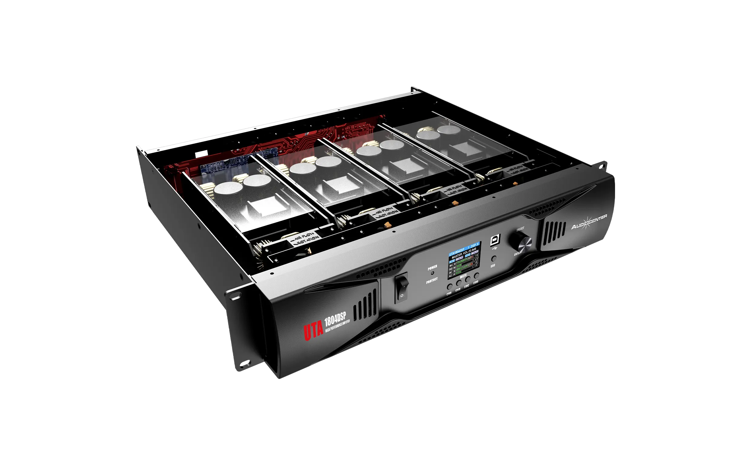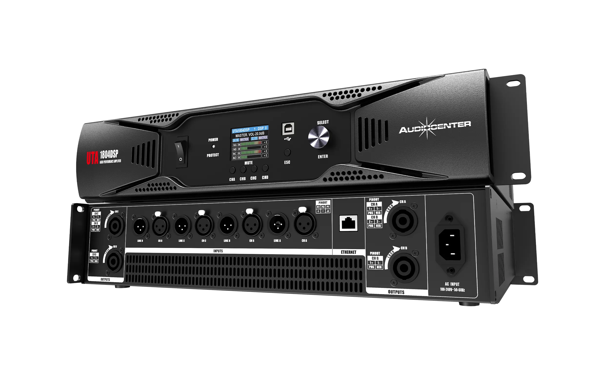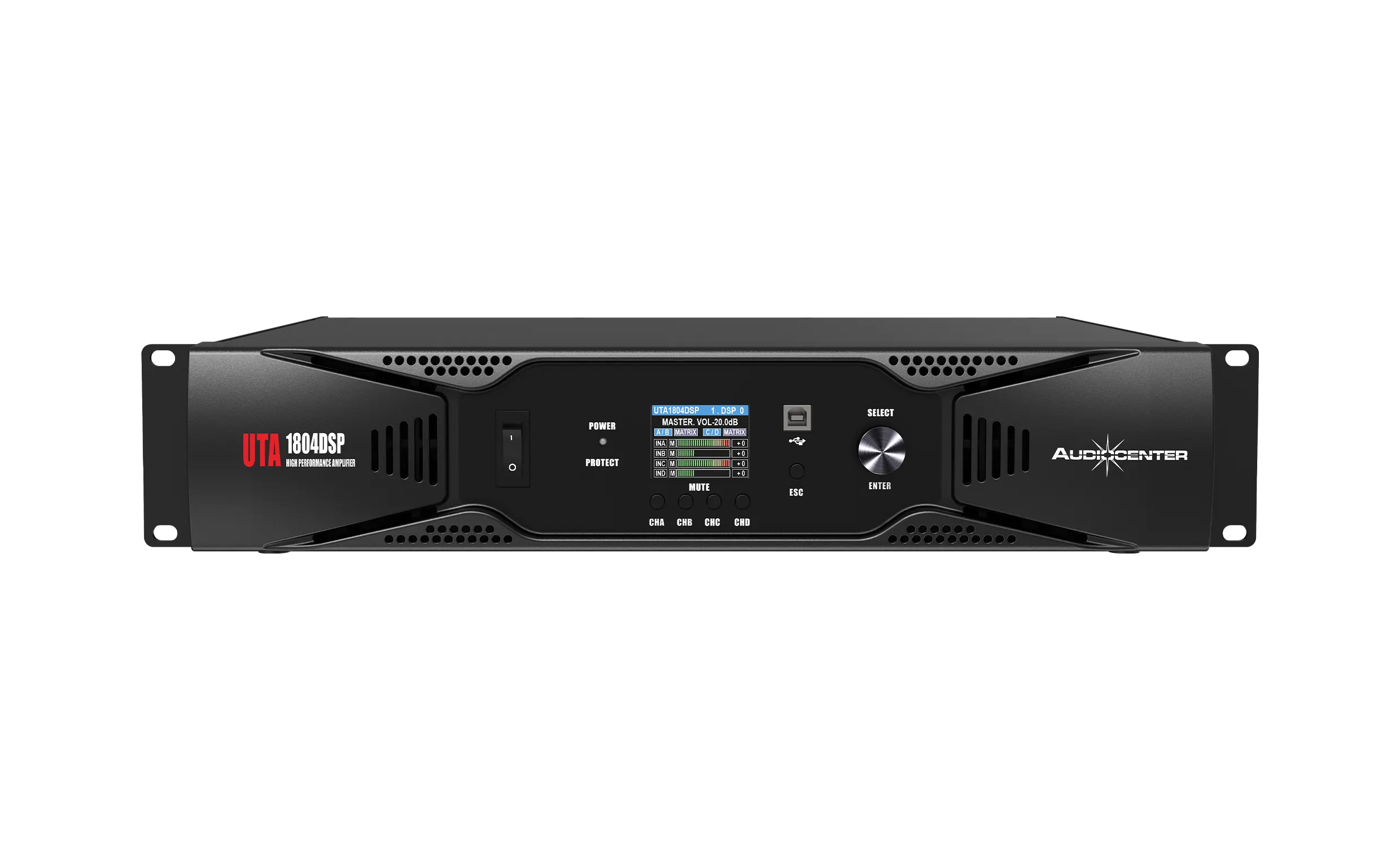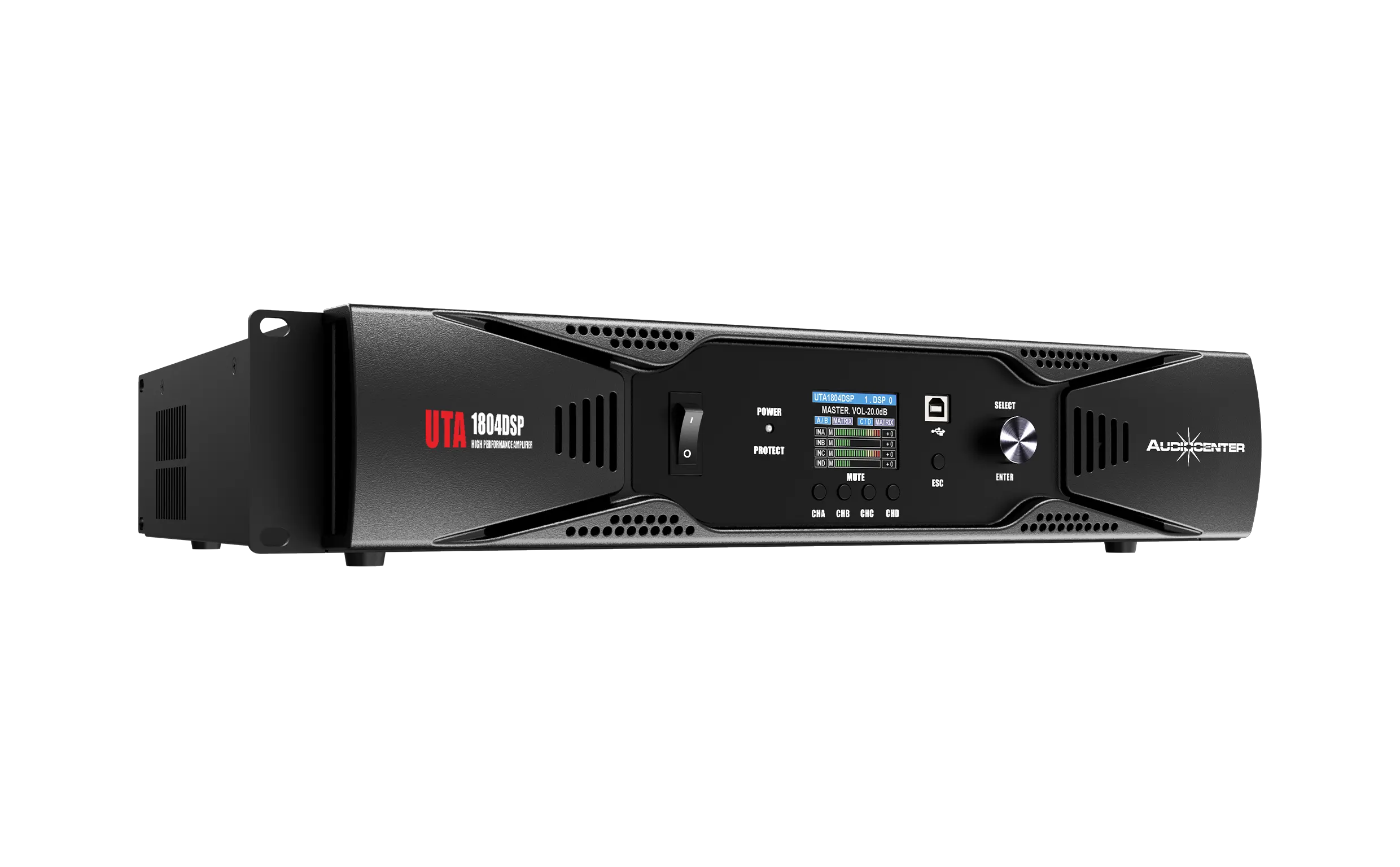 UTA1804DSP – это четырехканальный цифровой усилитель мощности, объединяющий технологию усиления мощности класса D с высокоточной цифровой обработкой сигнала DSP, что повышает качество звучания и удобство управления.