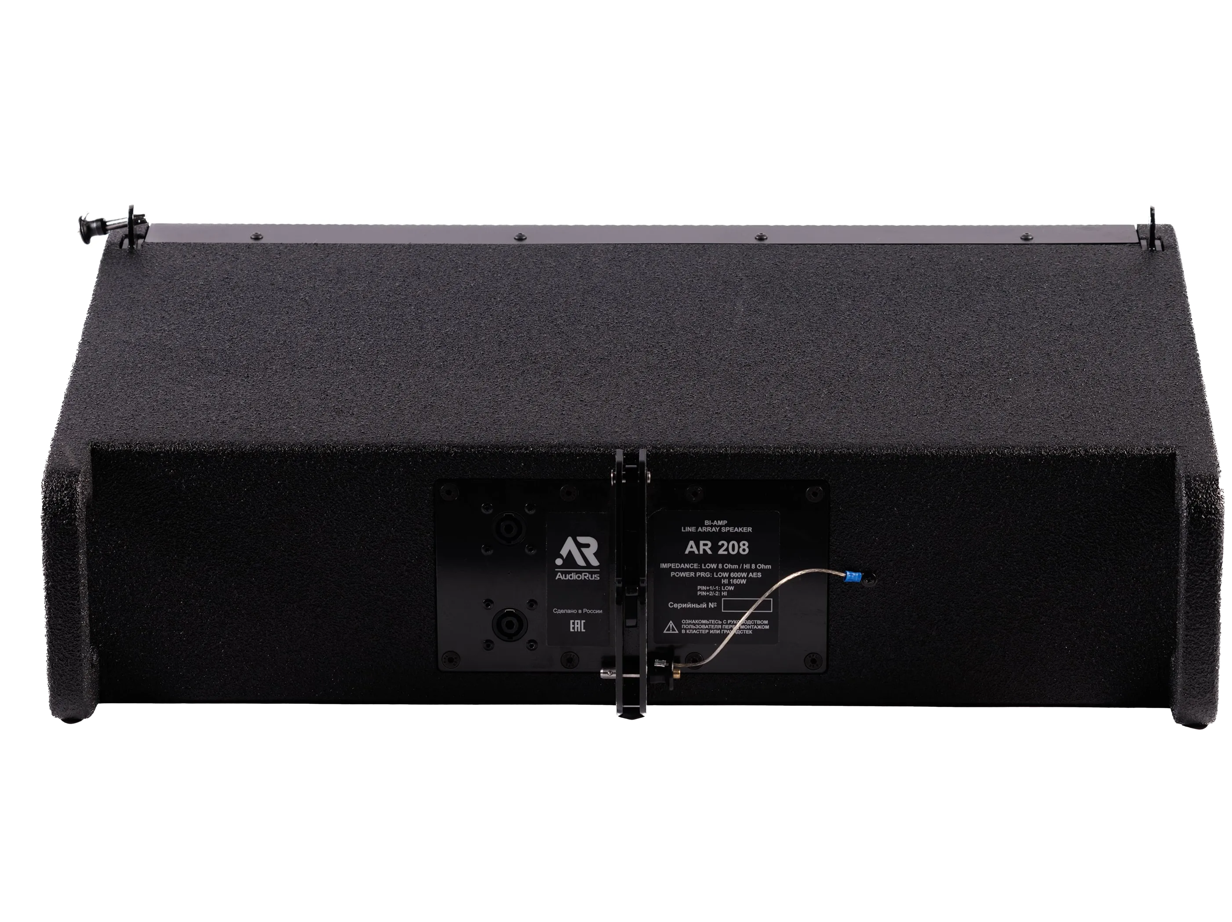 Audiorus AR 208 ND - пассивный элемент линейного массива; 2х НЧ/СЧ 8" неодимовых Custom динамика (VC 64 мм), 2х ВЧ неодимовых драйвера (VC 44 мм) нагруженных на волноводы 1"; НЧ 8 Ом, ВЧ 8 Ом; Max SPL**: 134 дБ; РДЧ: 90 Гц - 20 кГц (-6дБ); Мощность** (AES/PRG): НЧ 1000 Вт; ВЧ 160 Вт; Чувствительность(1Вт/1м): НЧ 104 дБ, ВЧ 110 дБ; Дисперсия (Г/В,(-6дБ): 90° х 10°; Коннекторы: Тип NL4MPR: LF 1+/1-; HF 2+/2-; Полиуретановое чёрное покрытие; Корпус: многослойная 12 и 15 мм фанера; 4 фрезерованные ручки; Габариты, без элементов риггинга (ШxВxГ,мм): 774 х 248 х 460; Вес нетто: 24.80 кг; Риггинг: Механизм настройки углов наклона. Фиксация при помощи пинов диаметром 8 мм. 3 точки крепления. Варианты углов наклона: 0°/1°/2°/3°/5°/7,5°/10°; Опционально: рама AR RIG