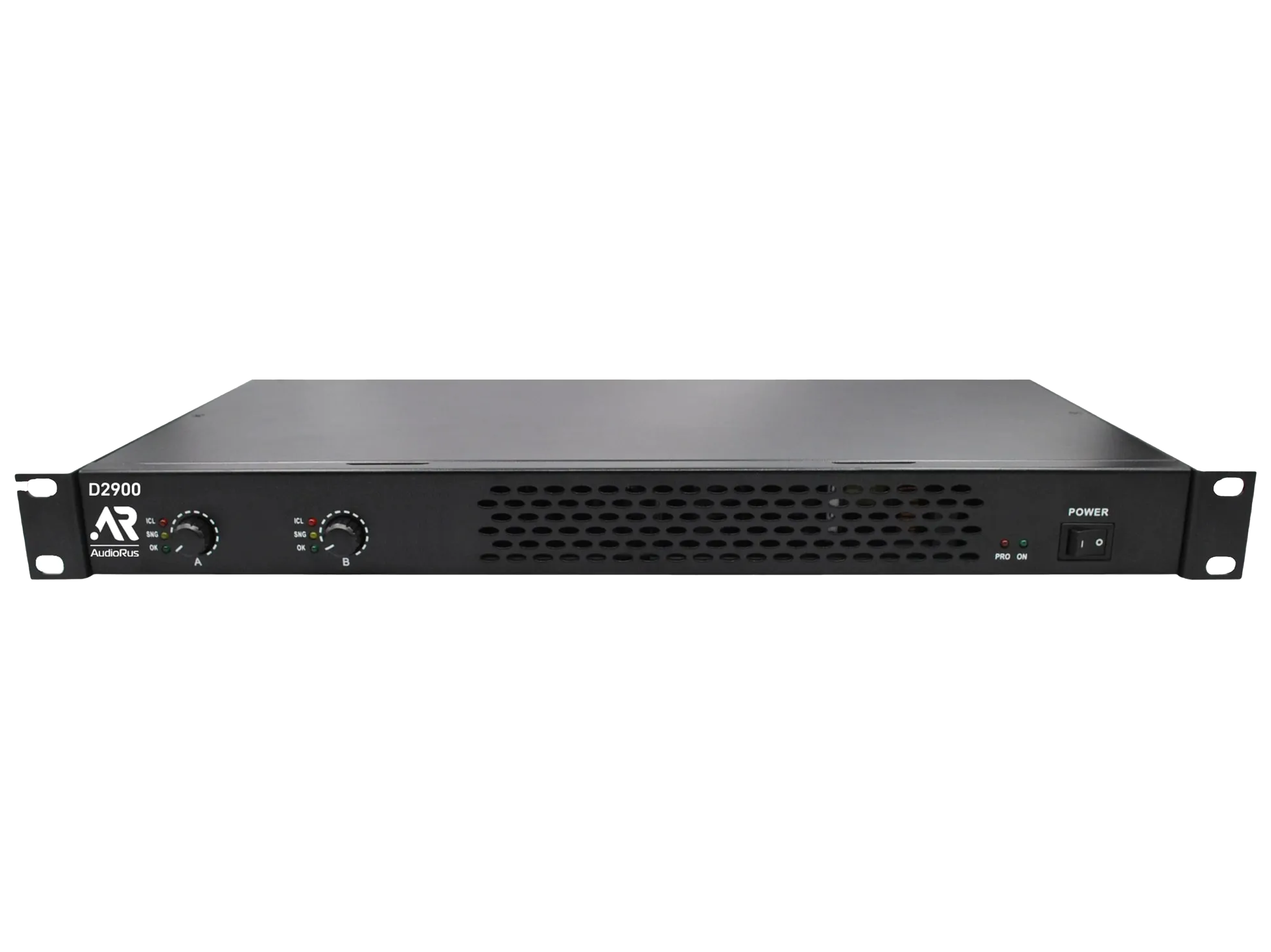 AUDIORUS D2900 — усилитель мощности 8 Ом: 2х 900Вт; 4 Ом: 2x 1400Вт; Класс D; 20 Гц - 20 кГц; Плавное включение; Защиты: перегрузка / короткое замыкание / перегрев / DC output; ~230 В, 50 Гц; PowerCON®