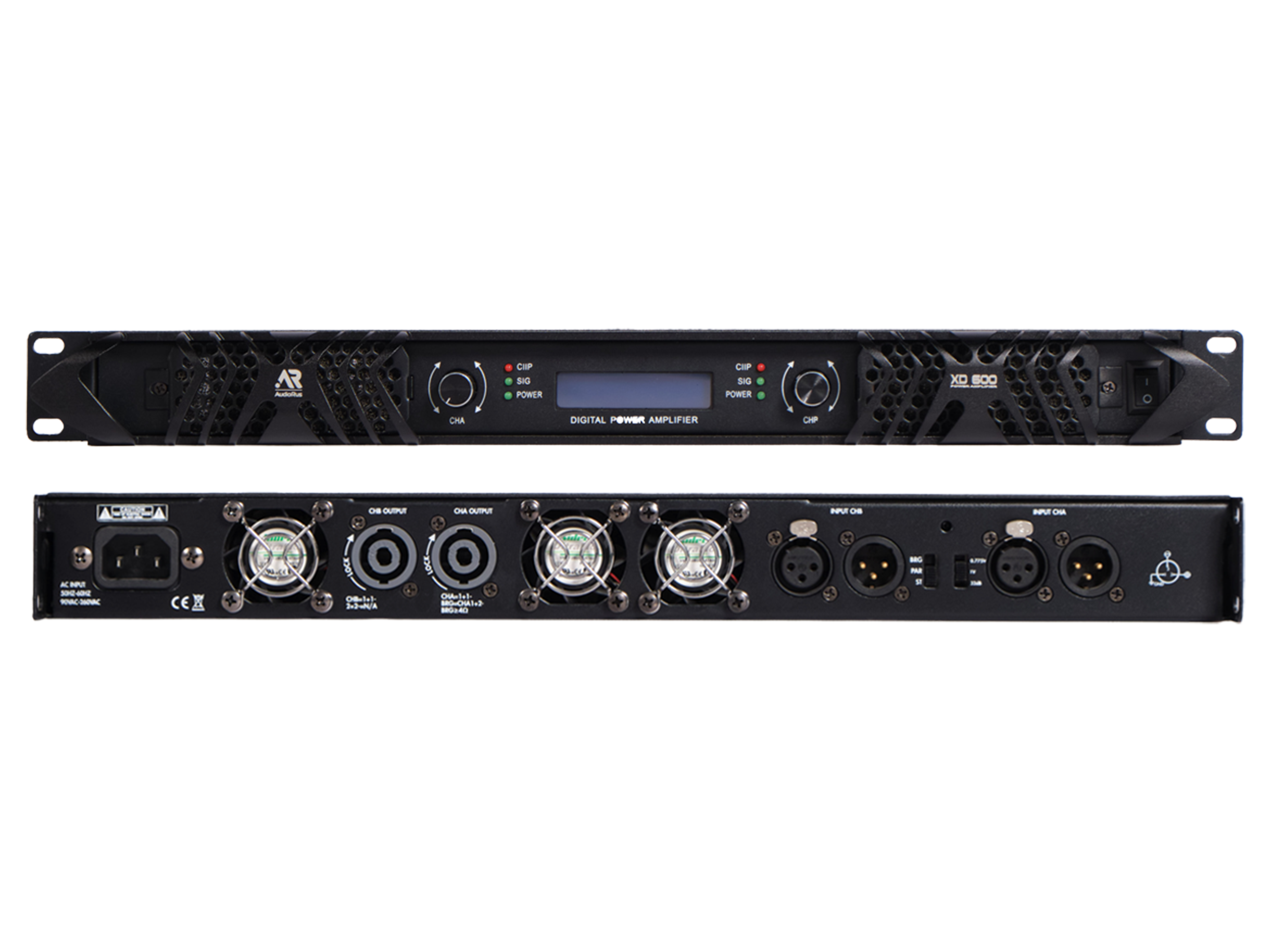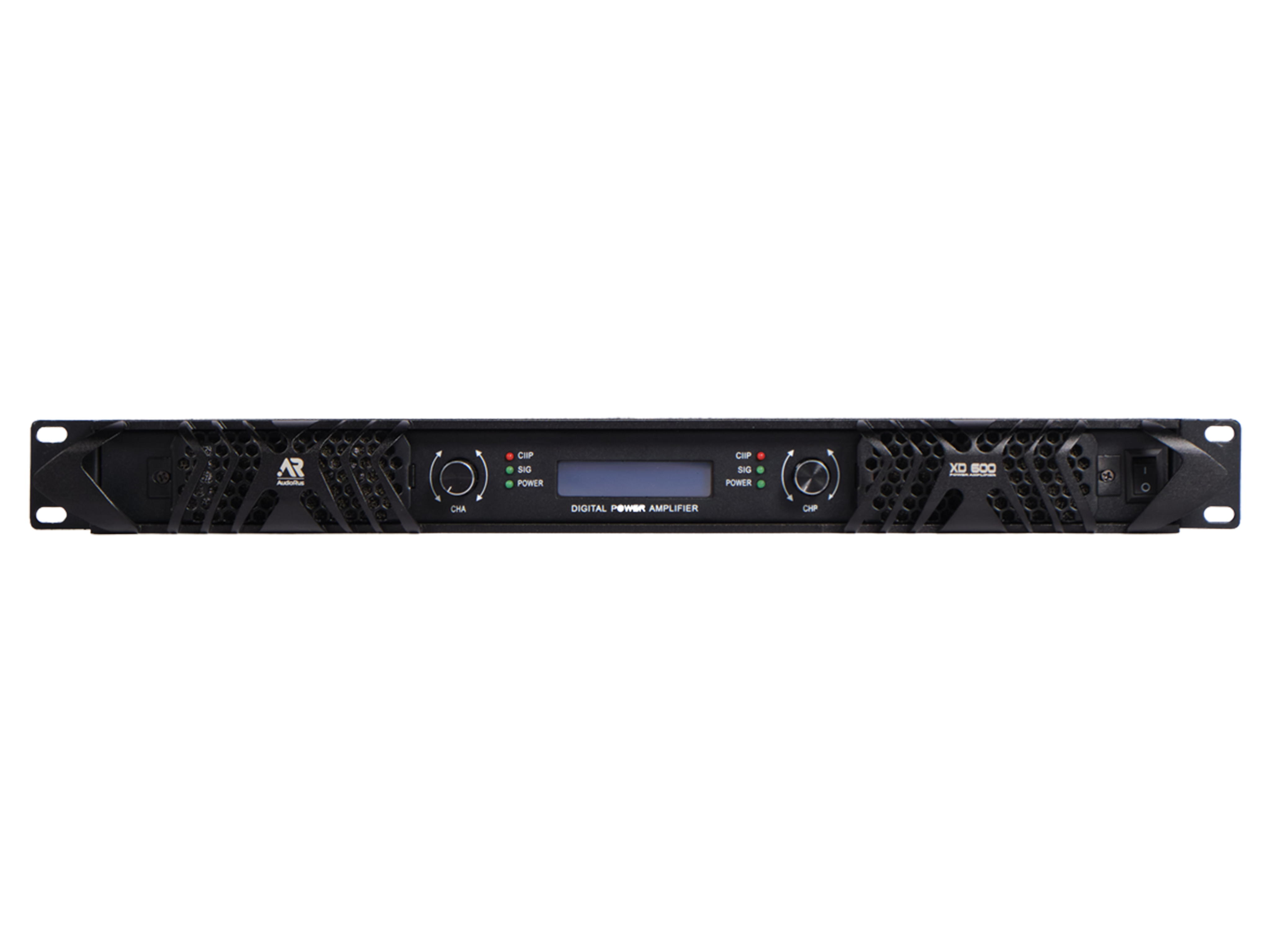 Audiorus XD-600 - цифровой усилитель мощности; 8 Ом: 2x 600Вт; 4 Ом: 2x 1100Вт; режим "мост" 8 Ом: 2200Вт; Класс D; 20Гц-20кГц (± 0.5дБ); Плавное включение; Защиты: перегрузка / короткое замыкание / перегрев / DC output; LCD дисплей; Габариты (ШxГxВ,мм): 483 х 360 х 50 (1U); 6.80 кг