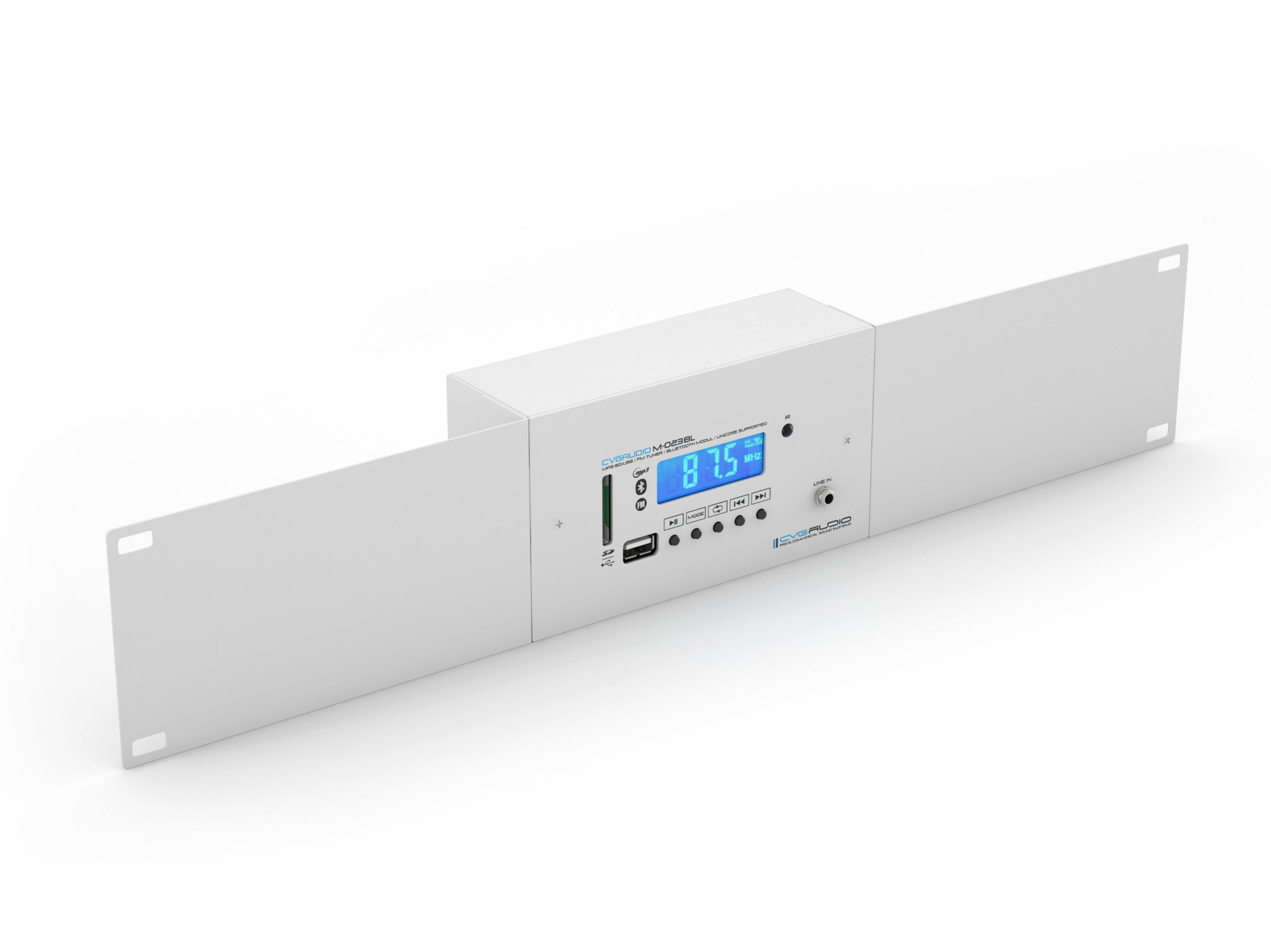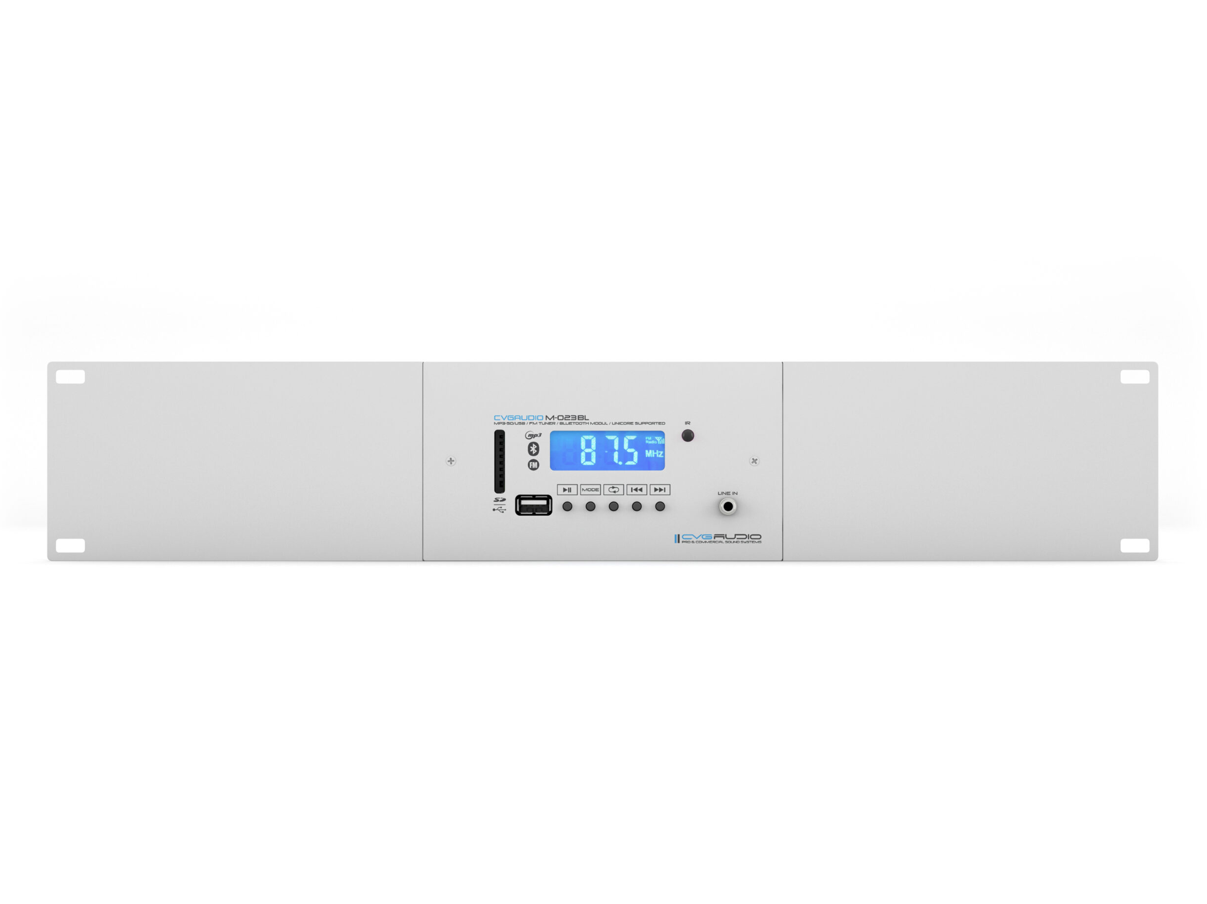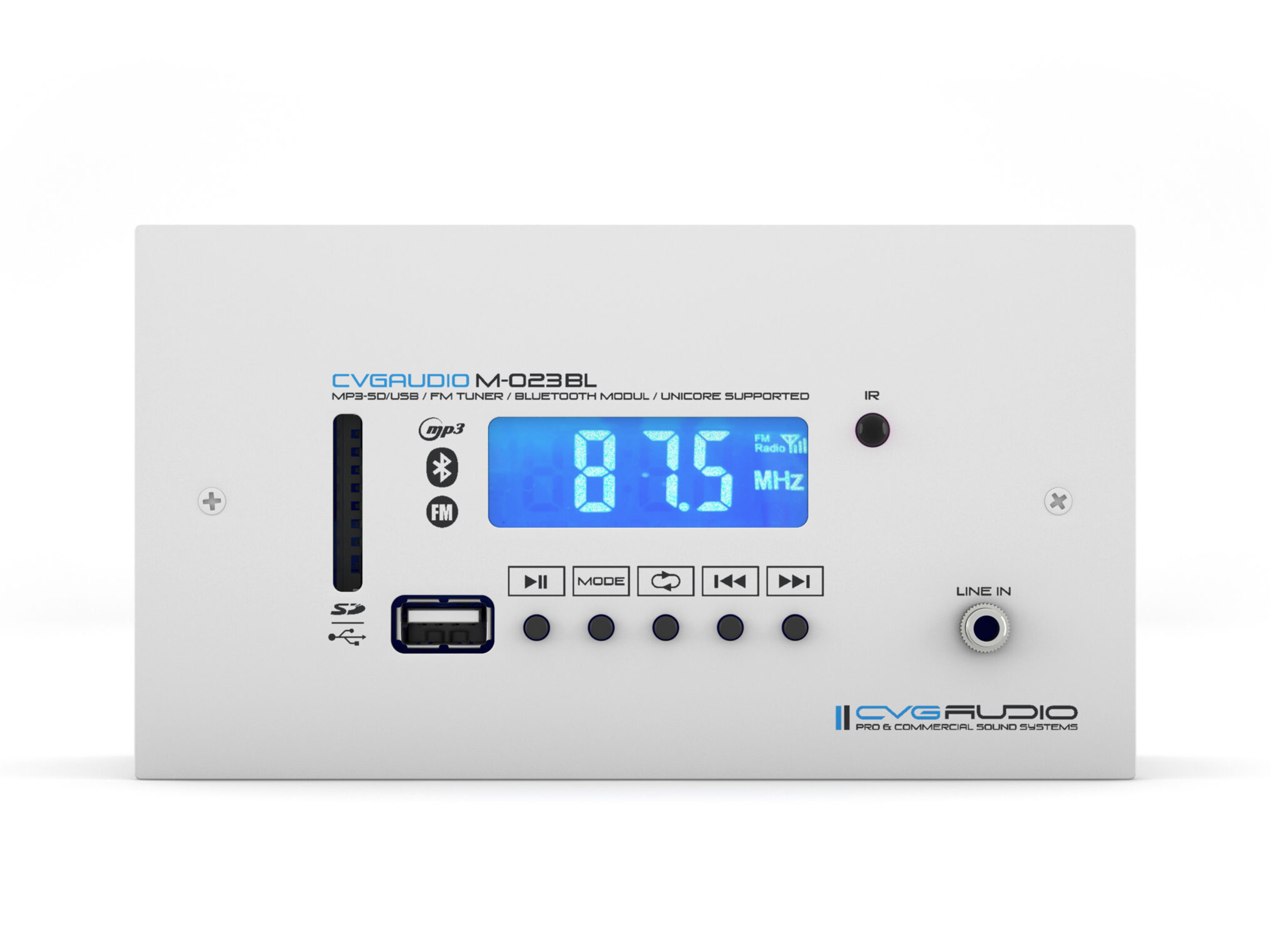 Профессиональный мультимедийный комбинированный источник сигнала MP3/FLAC плеер (USD / SDcard), FM тюнер, Bluetooth, Line in. Установка настольная, настенная, встроенная (используется стандартный двойной подразетник), монтаж в рековую стойку (2U). IR внешний пульт управления. Поддержка управления с веб интерфейса UNICORE/AMBICORE. Цвет белый.