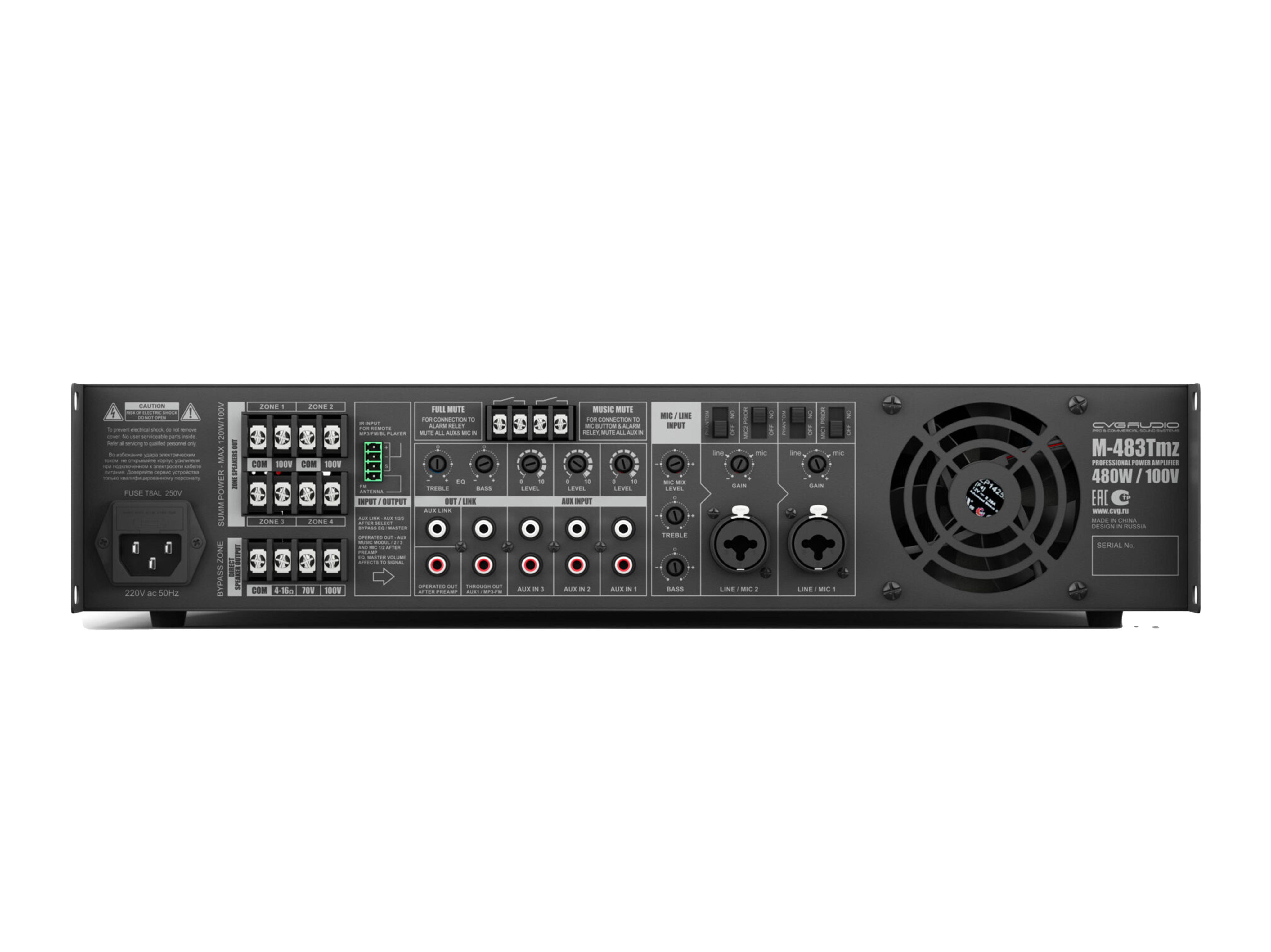 Профессиональный микшер-усилитель, встроенный модуль источника сигнала (MP3 — USB/SDcard, FM тюнер, Bluetooth), 4 управляемые спикерные зоны. Предназначен для качественных систем трансляции фоновой музыки и голосового оповещения. Мощность 480W/100V, 3 line in (3x2RCA), 2 mic/line in (XLR/TRS), настраиваемый приоритет, фантомное питание 24V, управляющие контакты FULL MUTE, MUSIC MUTE, раздельный двухполосный EQ для линейных и микрофонных входов, индивидуальная настройка чувствительности для каждого входа, сквозной выход THROUGH OUT (2RCA) c входа LINE1 / MP3-FM модуля, линейный выход AUX LINK (RCA) с выбранного на входном селекторе AUN IN, управляемый выход OPERATED OUT (RCA) после предусилителя. IR вход для управления встроенным модулем плеера с внешних устройств серии DIGA. Корпус 2U, крепление в монтажную стойку в комплекте.