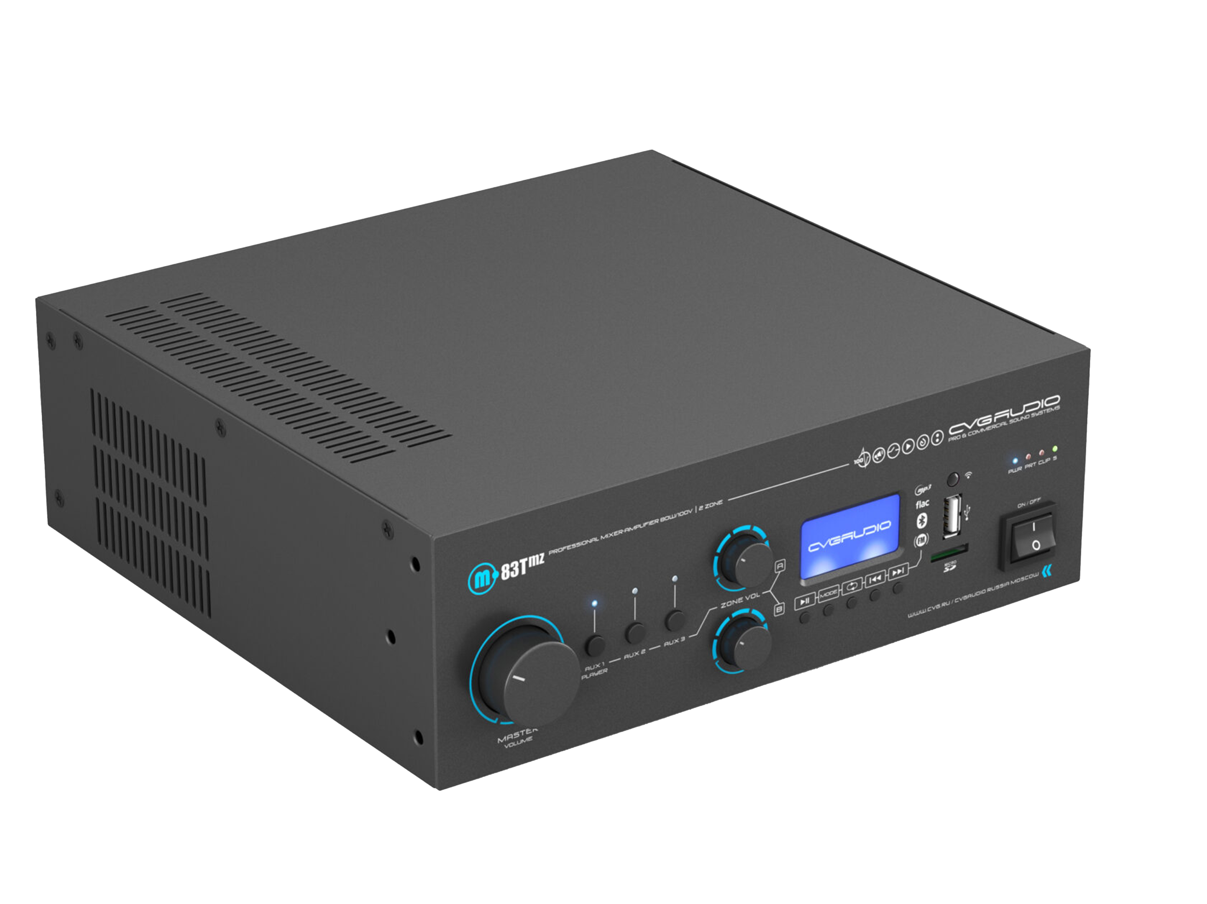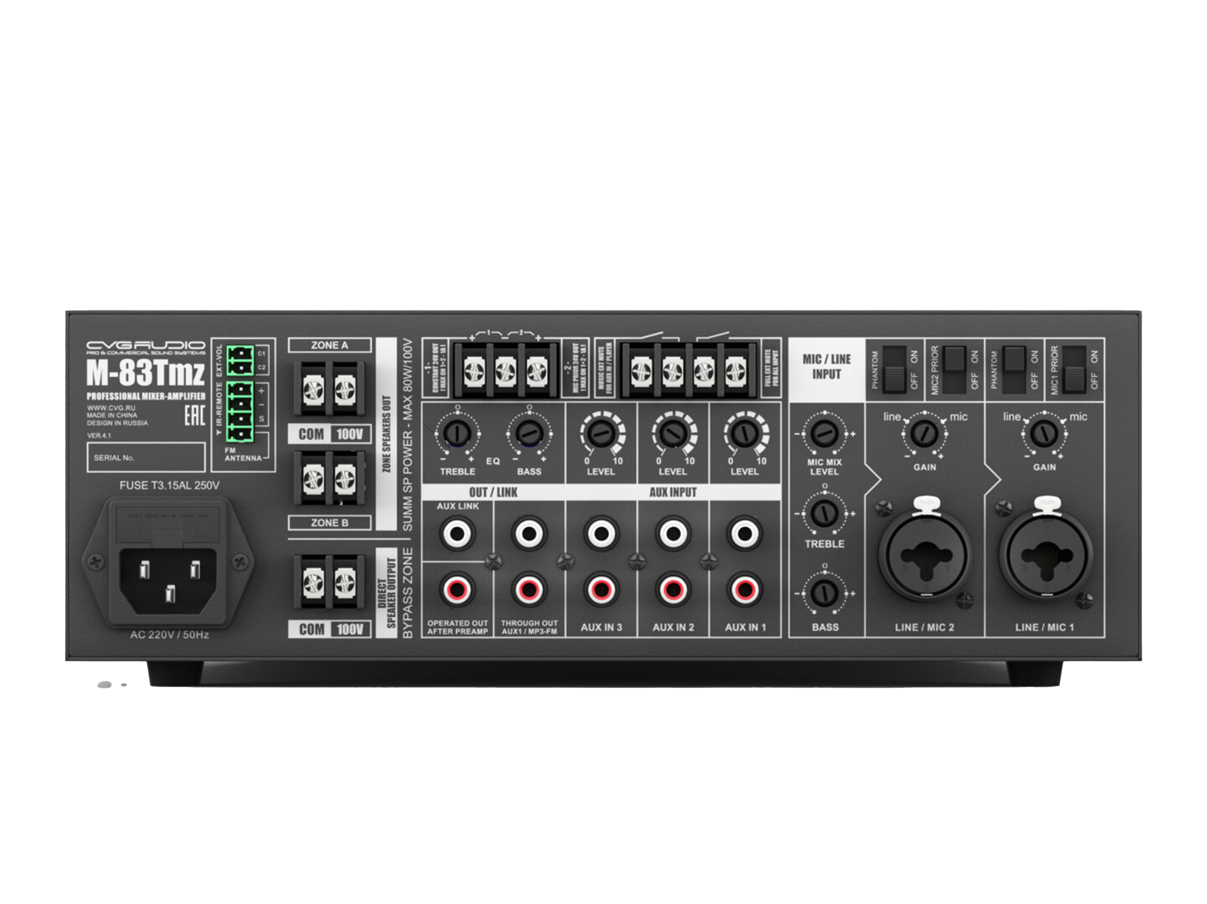 Профессиональный многофункциональный микшер-усилитель с двумя управляемыми спикерными зонами. Только для работы со 100V трансляционными акустическими системами. Мощность – 80W/100V. Встроенный источник сигнала – USB/MicroSD плеер, BLUETOOTH ресивер, FM тюнер. Три селективных линейных входа (2RCA), два балансных микрофонных входа (TRS/XLR) с возможность подачи фантомного питания и управляемым приоритетом. Контакты EXT.MUTE для интеграции в системы аварийно-пожарного оповещения. Питание 24V OUT для внешних панелей и источников сигнала, 24V OUT активируемый при работе приоритетного микрофона, возможность подключения внешнего регулятора громкости CVGAUDIO NVC. Уменьшенный корпус, установка в монтажную стойку с помощью опциональных кронштейнов CVGAUDIO MR/S.