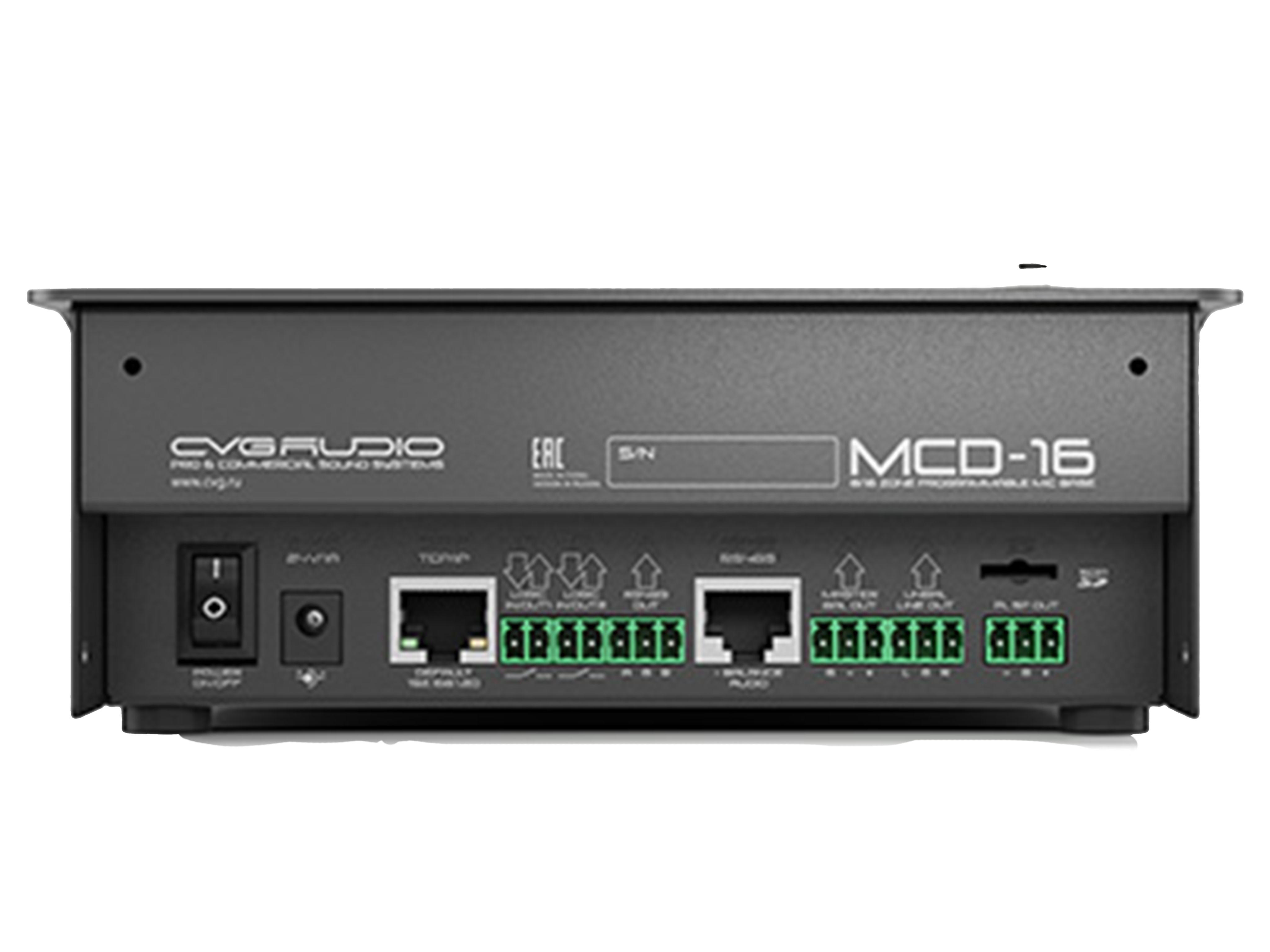 CVGAUDIO MCD-16 - внешняя микрофонная консоль для работы с процессорами CVGAUDIO ZONER pro и MDSP. 16 программируемых кнопок вызова зон оповещения c возможностью программного расширения до управления 32 каналами, встроенный DSP, RS-485, TCP-IP, два программируемых логических входа. MicroSD плеер для предзаписанных сообщений. Веб-интерфейс для настройки и управления. Часы реального времени. Балансный аудио выход. Информационный OLED экран. Металлический настольный корпус.