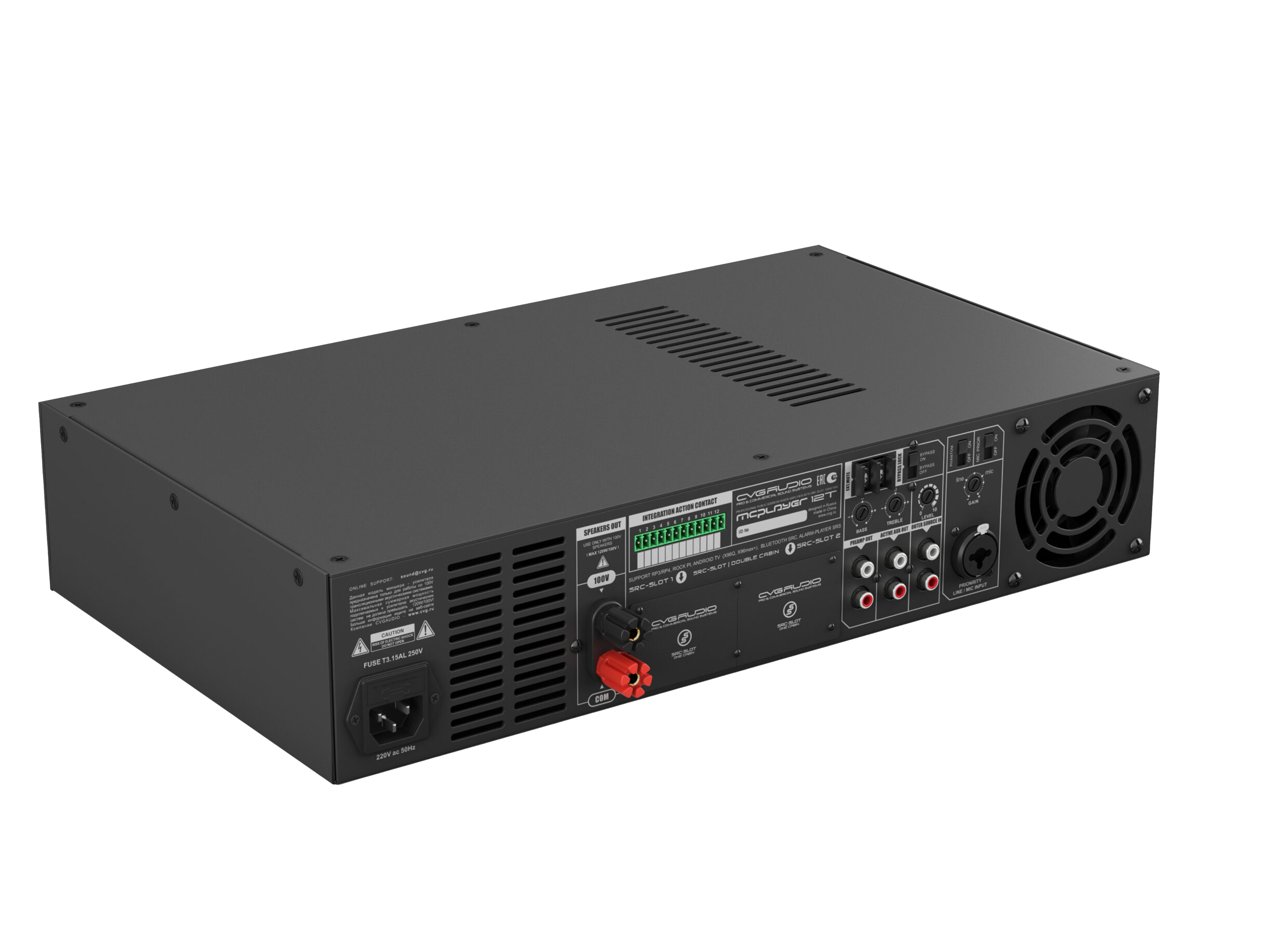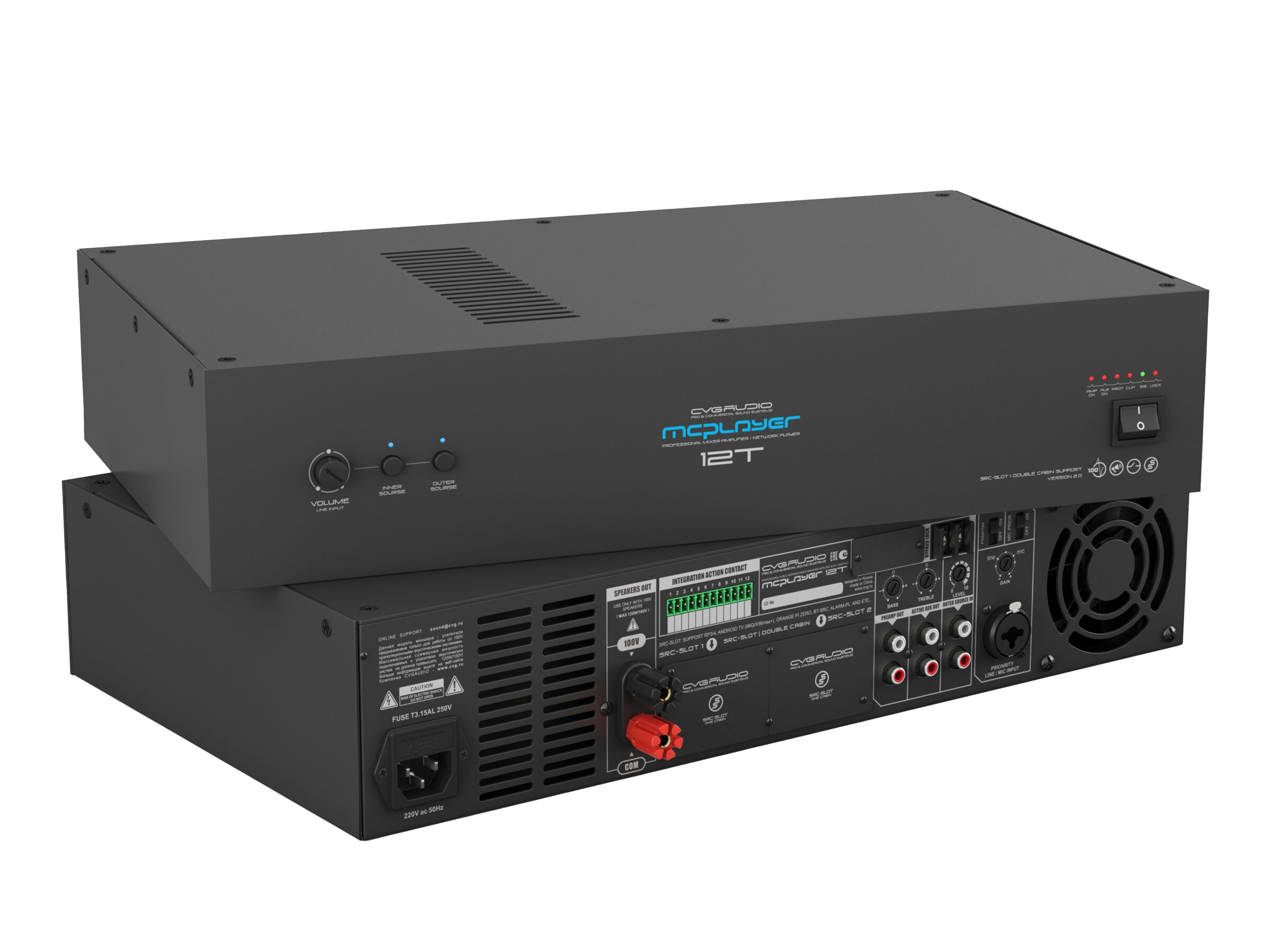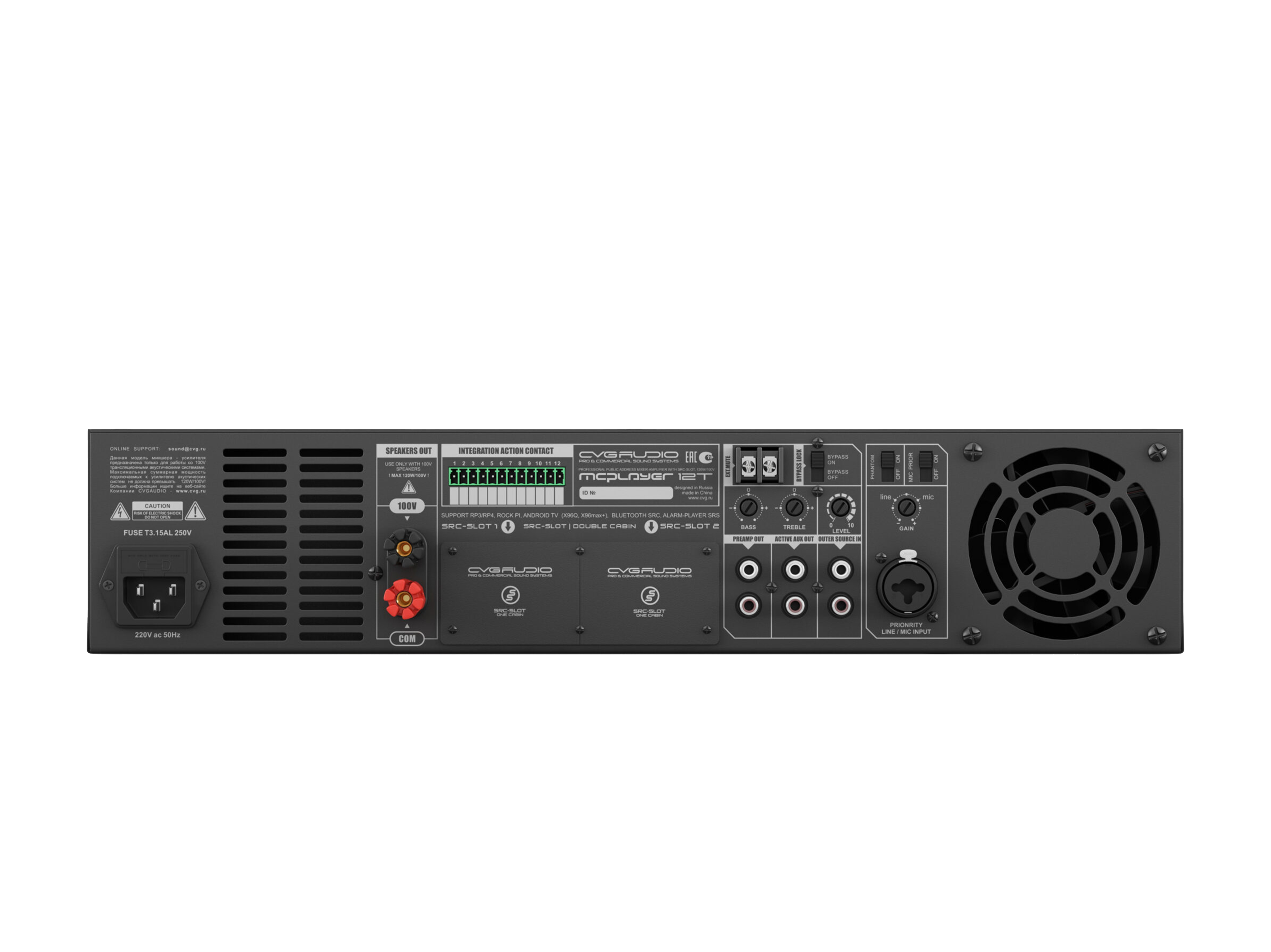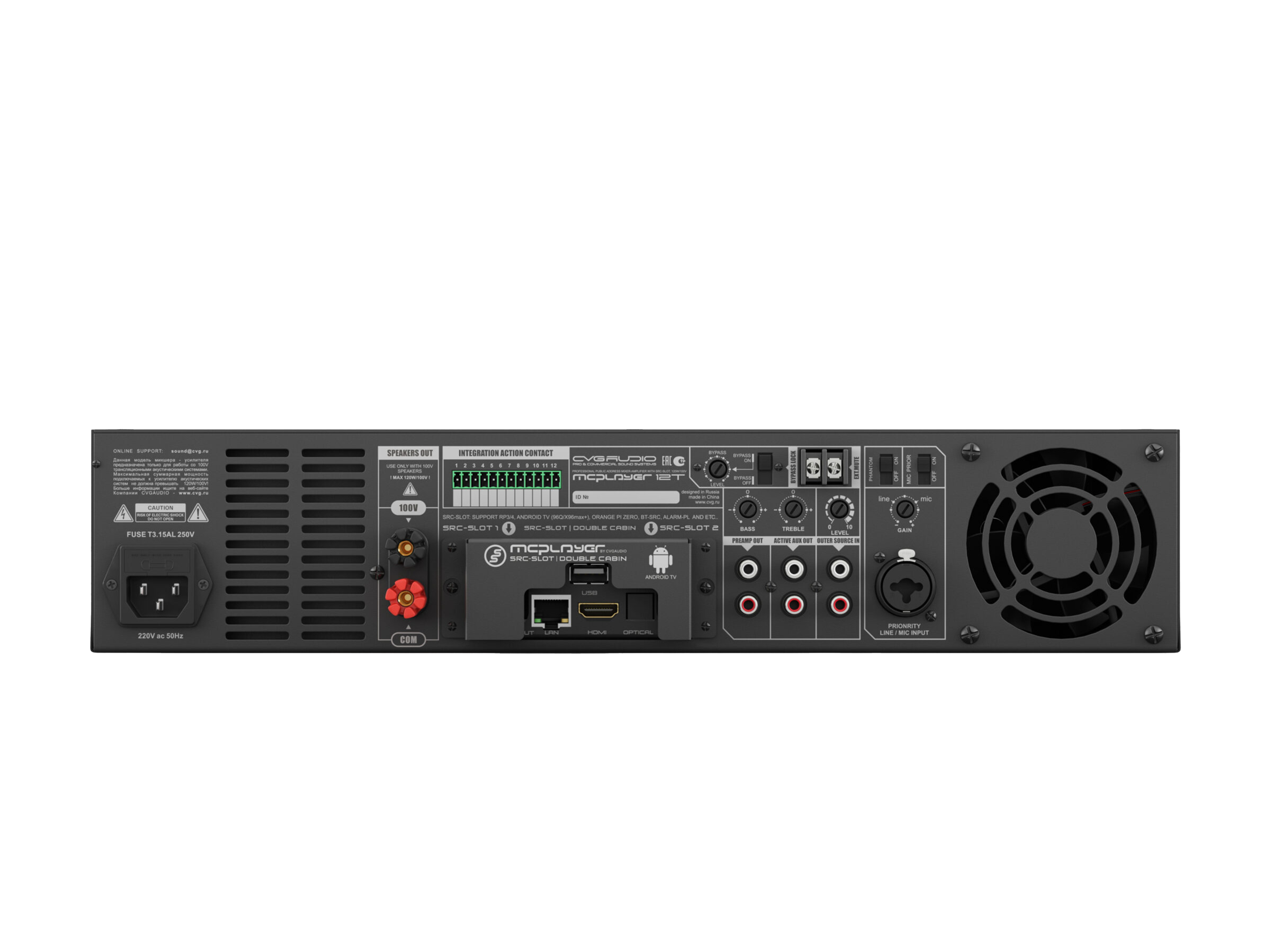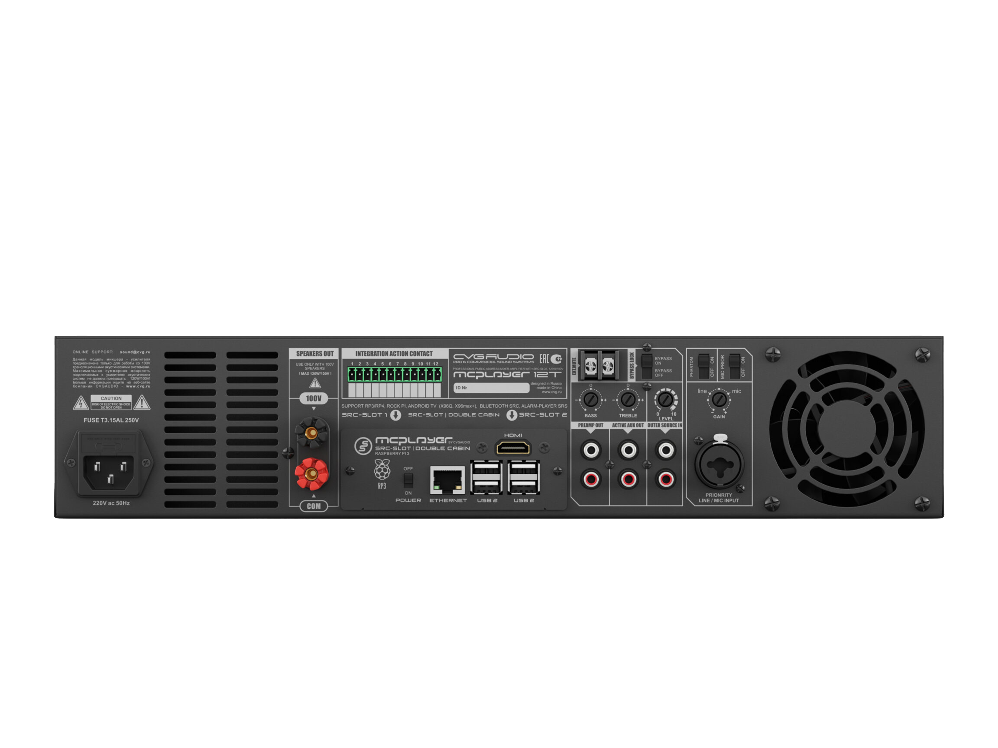 Профессиональный микшер-усилитель 120W/100V, два селективных LINE IN (INNER — встроенный плеер и OUTER — внешний источник). Штатное посадочное место для установки CVGAUDIO SRC-SLOT для интеграции сетевых плееров с поддержкой профессиональных сервисов, работающих с коммерческим аудио контентом. Универсальный LINE/MIC вход с управляемой чувствительностью, фантомным питанием и приоритетом над линейными входами. Управляющие контакты EXT.MUTE для интеграции с СОУЭ. Функция BYPASS LOCK для блокировки управления с лицевой панели усилителя. Корпус – 2U, кронштейны в стандартном комплекте поставки.