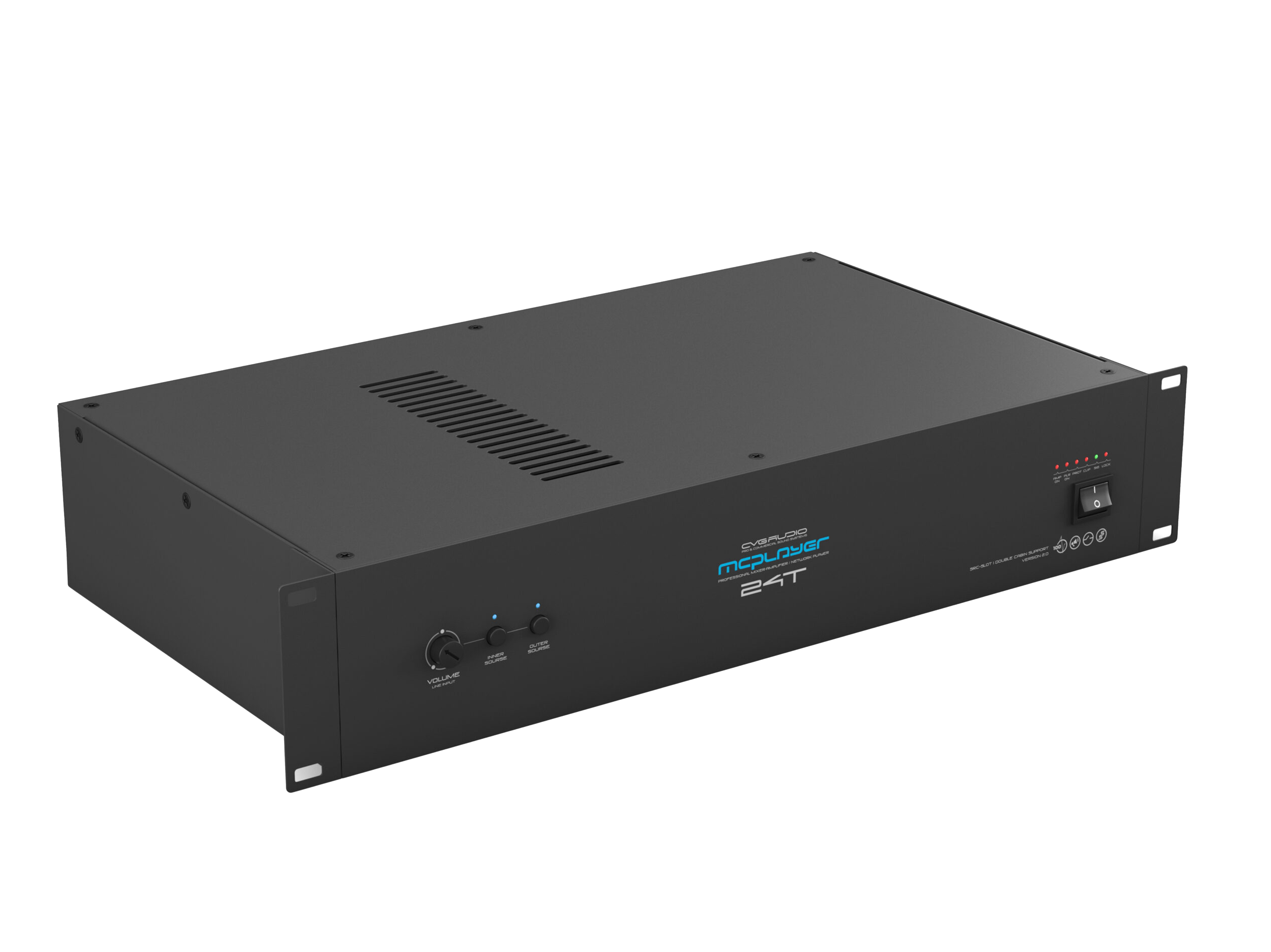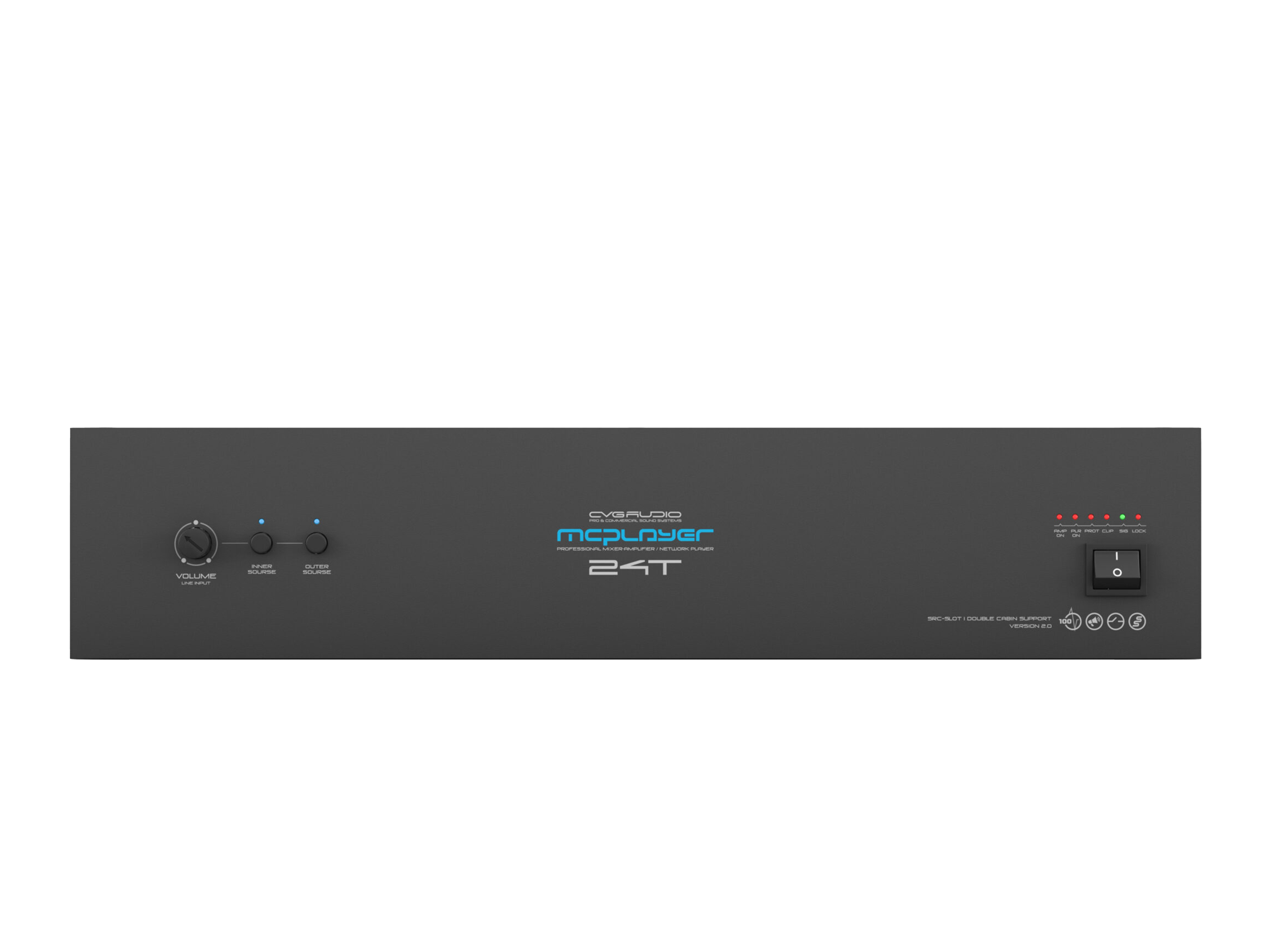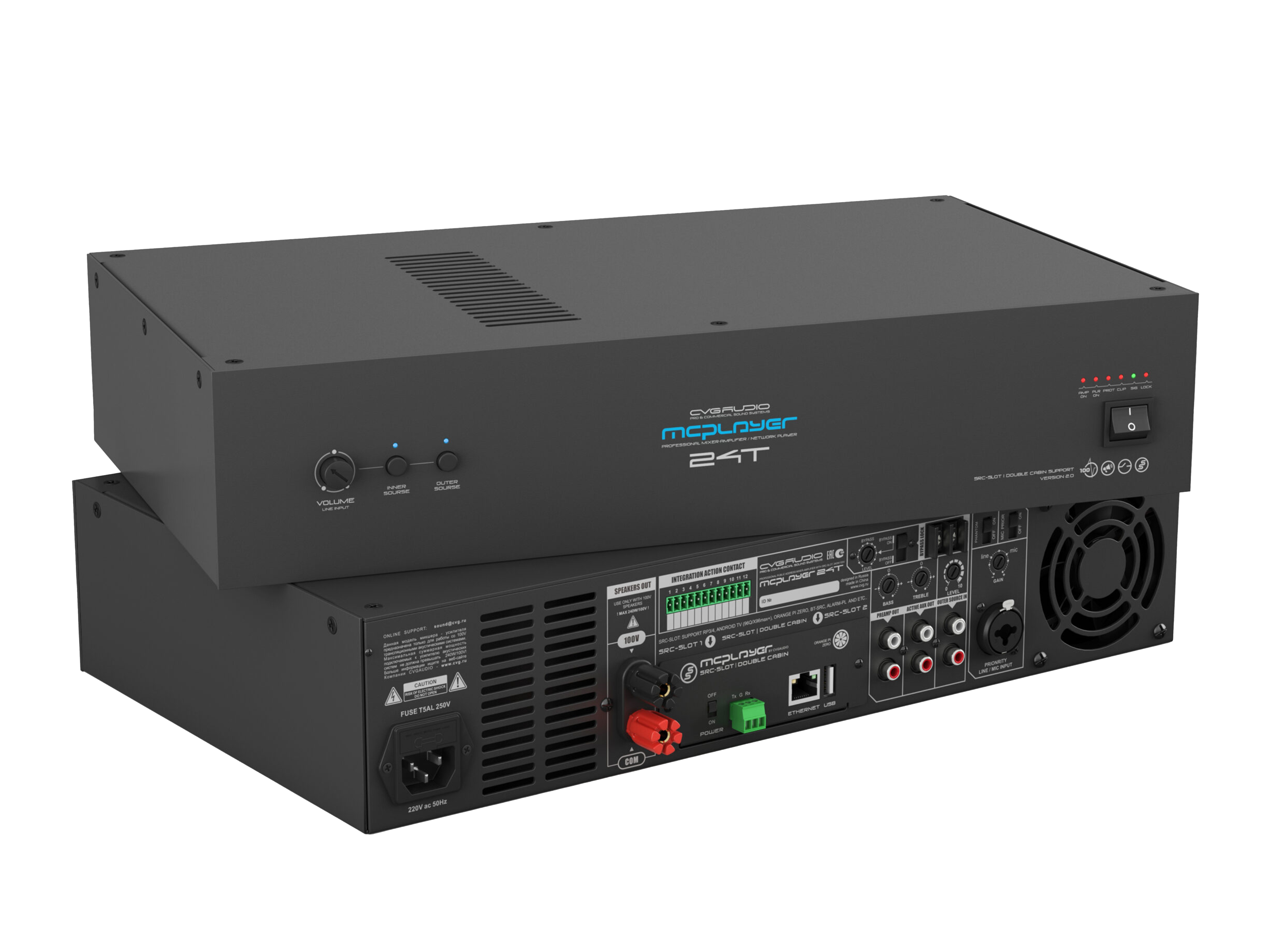 Профессиональный микшер-усилитель 240W/100V, два селективных LINE IN (INNER — встроенный плеер и OUTER — внешний источник). Штатное посадочное место для установки CVGAUDIO SRC-SLOT для интеграции сетевых плееров с поддержкой профессиональных сервисов, работающих с коммерческим аудио контентом. Универсальный LINE/MIC вход с управляемой чувствительностью, фантомным питанием и приоритетом над линейными входами. Управляющие контакты EXT.MUTE для интеграции с СОУЭ. Функция BYPASS LOCK для блокировки управления с лицевой панели усилителя. Корпус – 2U, кронштейны в стандартном комплекте поставки.