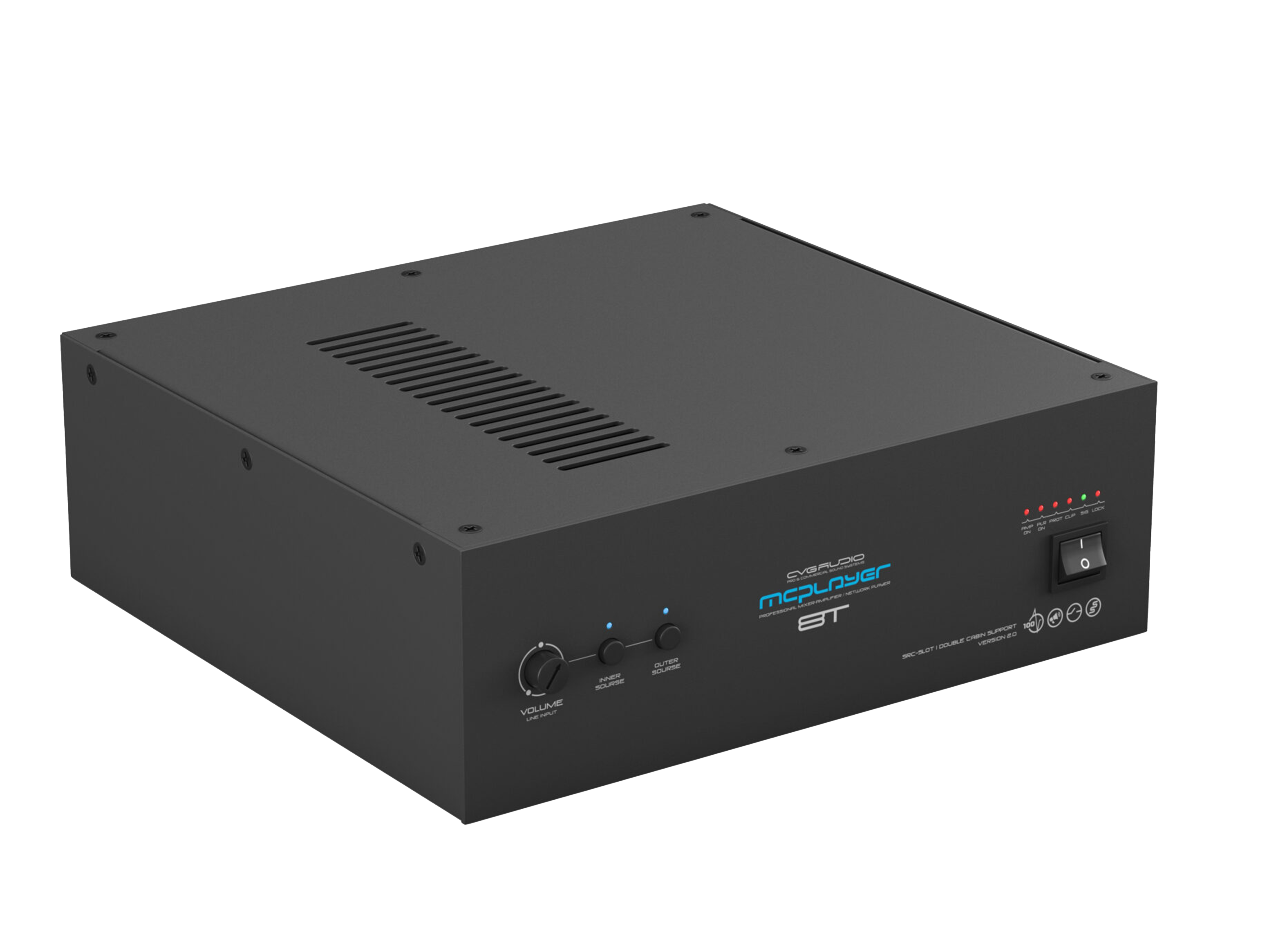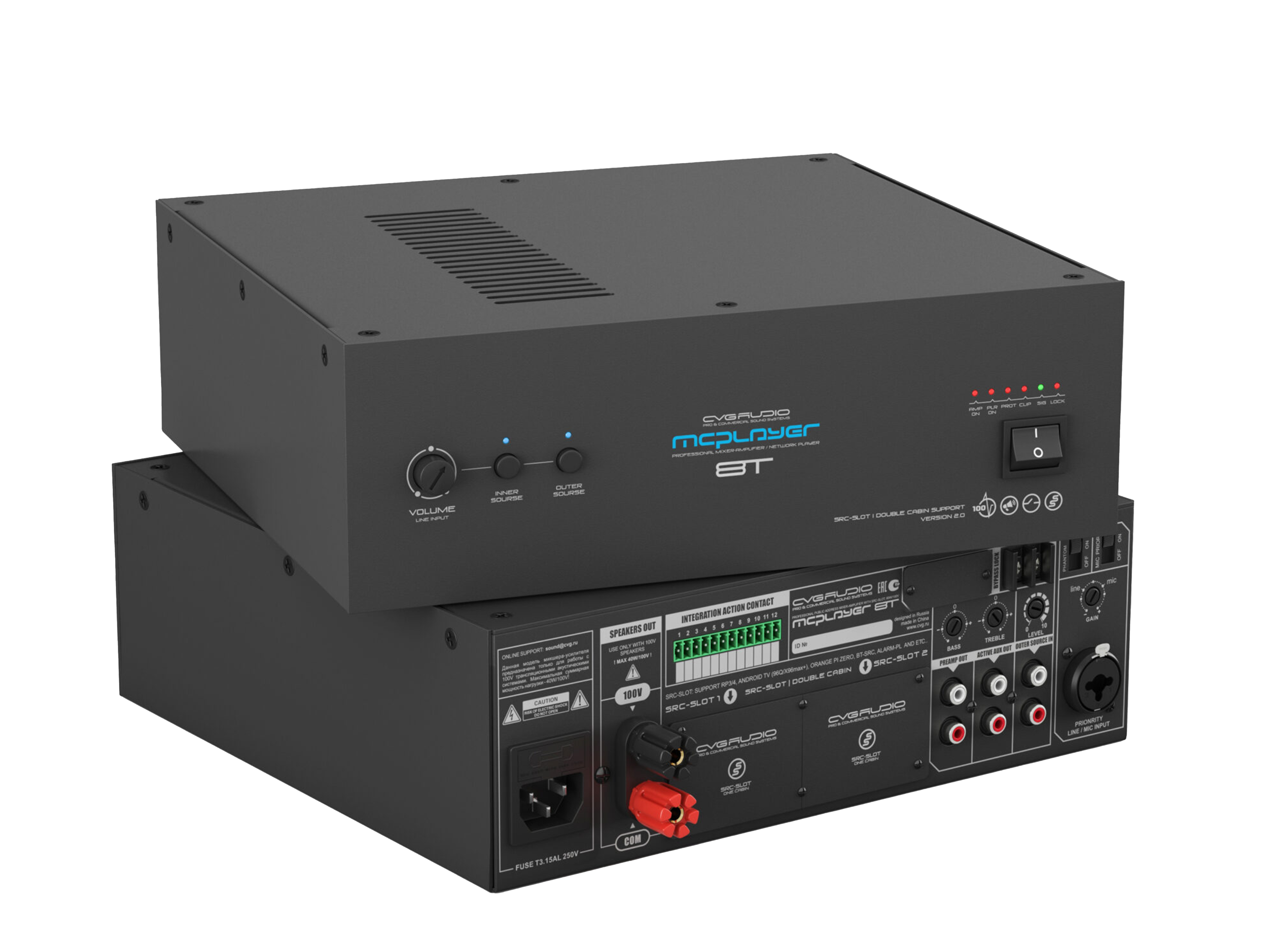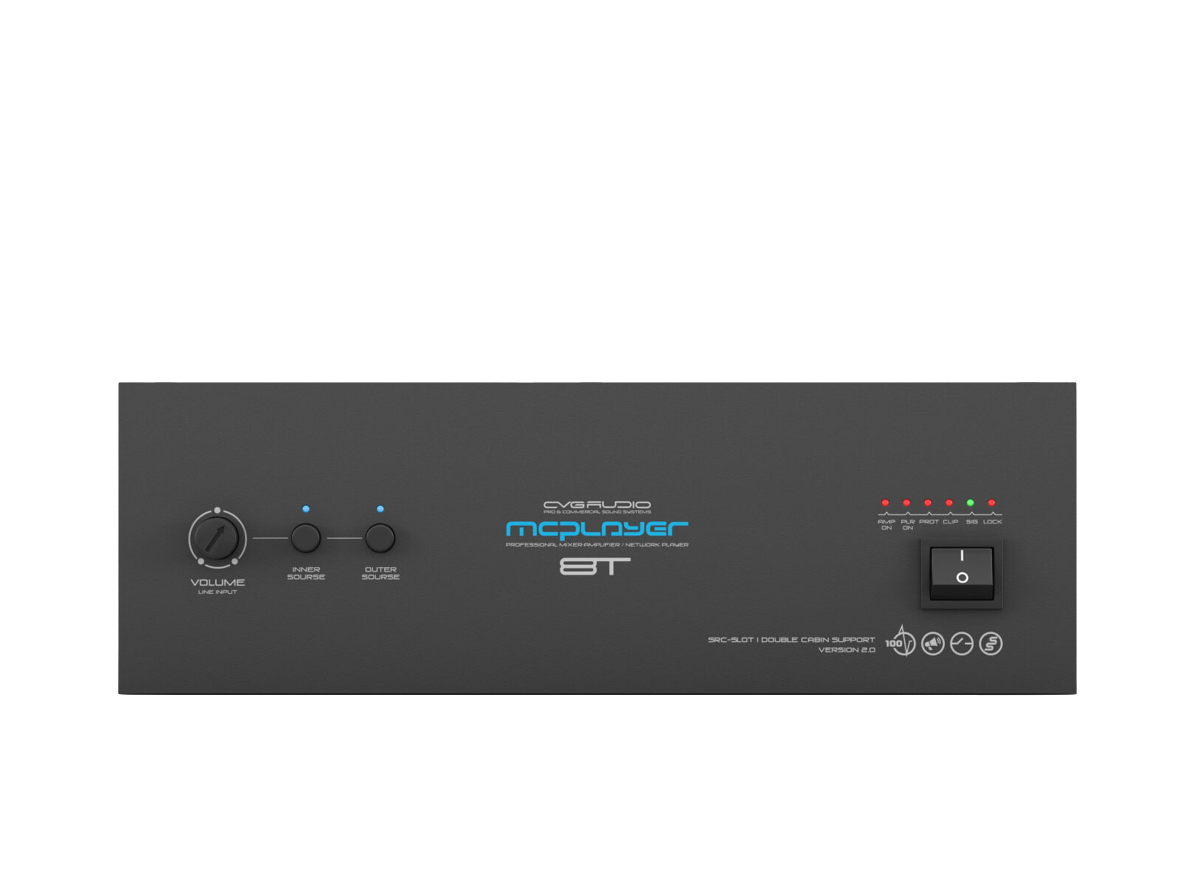 Профессиональный микшер-усилитель 80W/100V, два селективных LINE IN (INNER — встроенный плеер и OUTER — внешний источник). Штатное посадочное место для установки CVGAUDIO SRC-SLOT для интеграции сетевых плееров с поддержкой профессиональных сервисов, работающих с коммерческим аудио контентом. Универсальный LINE/MIC вход с управляемой чувствительностью, фантомным питанием и приоритетом над линейными входами. Управляющие контакты EXT.MUTE для интеграции с СОУЭ. Функция BYPASS LOCK для блокировки управления с лицевой панели усилителя. Корпус – 2U, кронштейны в стандартном комплекте поставки.