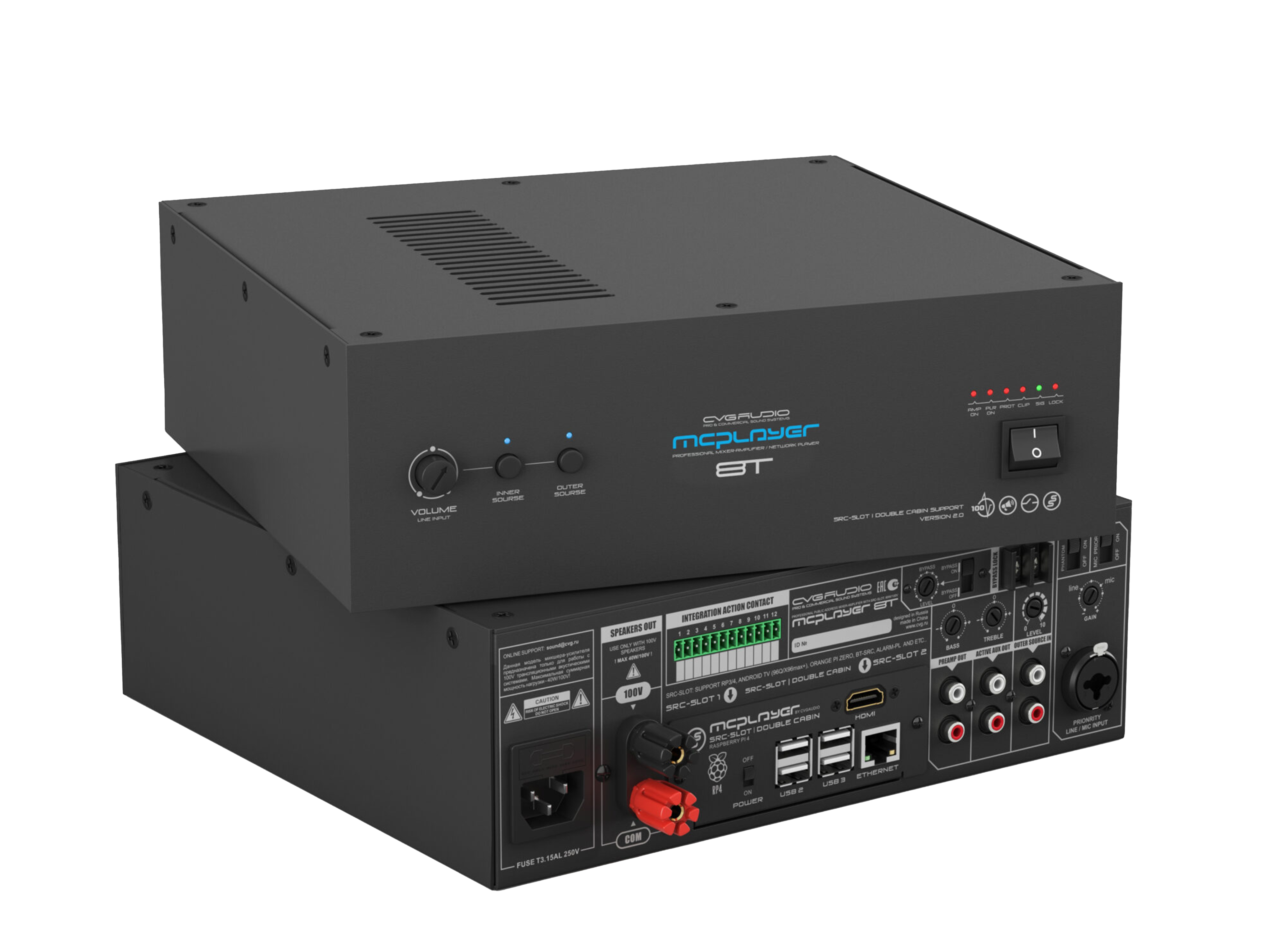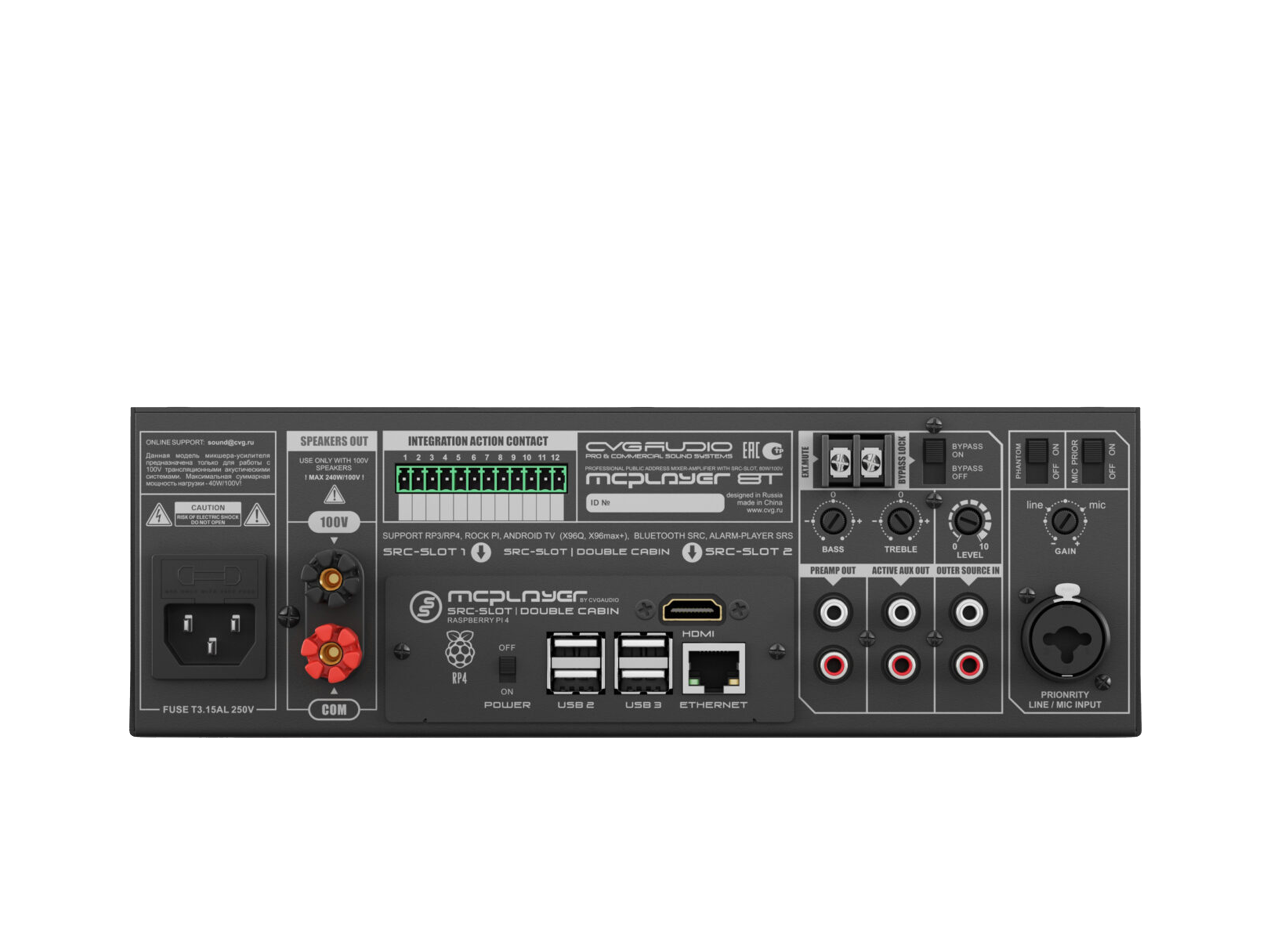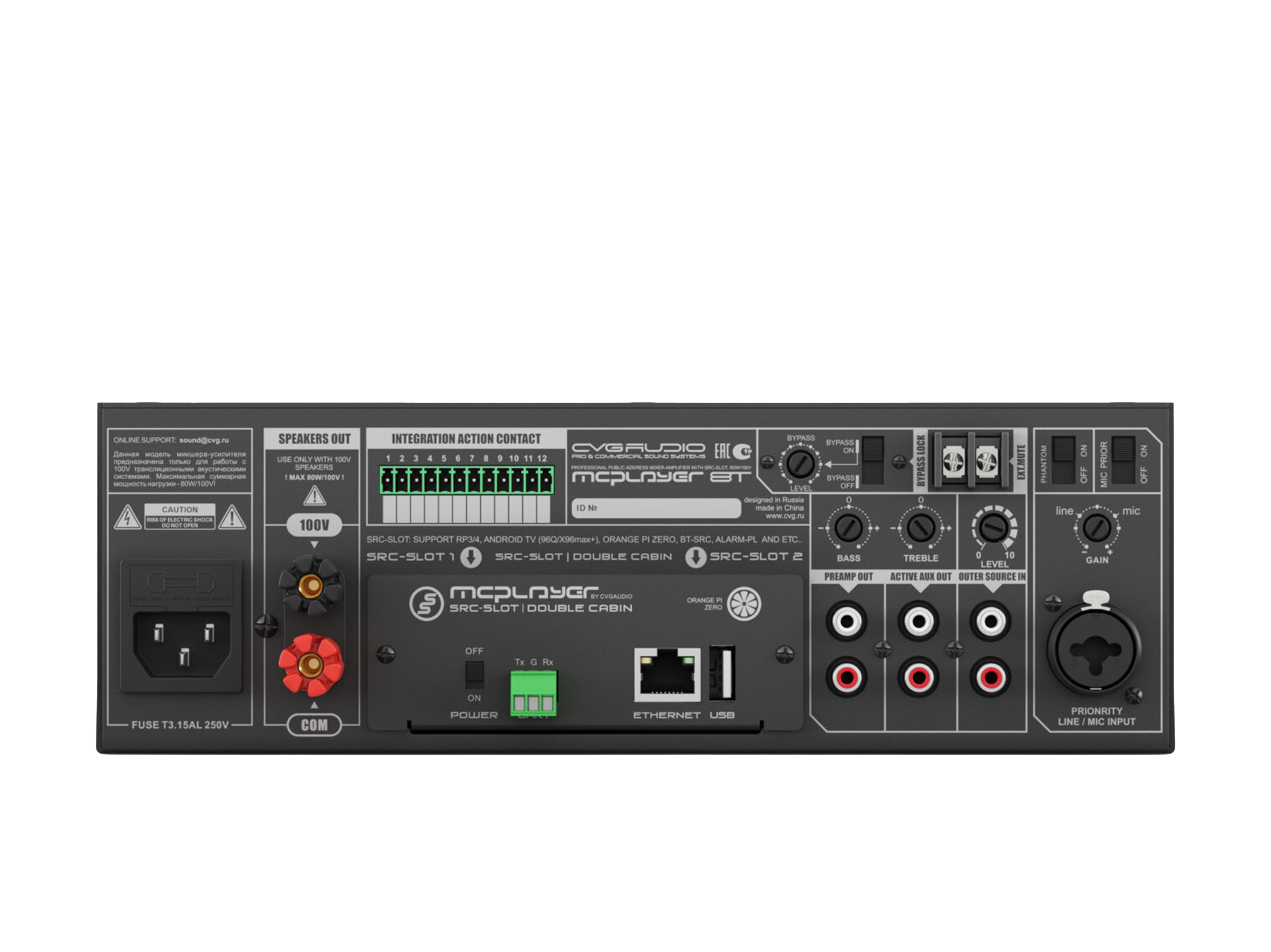 Профессиональный микшер-усилитель 80W/100V, два селективных LINE IN (INNER — встроенный плеер и OUTER — внешний источник). Штатное посадочное место для установки CVGAUDIO SRC-SLOT для интеграции сетевых плееров с поддержкой профессиональных сервисов, работающих с коммерческим аудио контентом. Универсальный LINE/MIC вход с управляемой чувствительностью, фантомным питанием и приоритетом над линейными входами. Управляющие контакты EXT.MUTE для интеграции с СОУЭ. Функция BYPASS LOCK для блокировки управления с лицевой панели усилителя. Корпус – 2U, кронштейны в стандартном комплекте поставки.