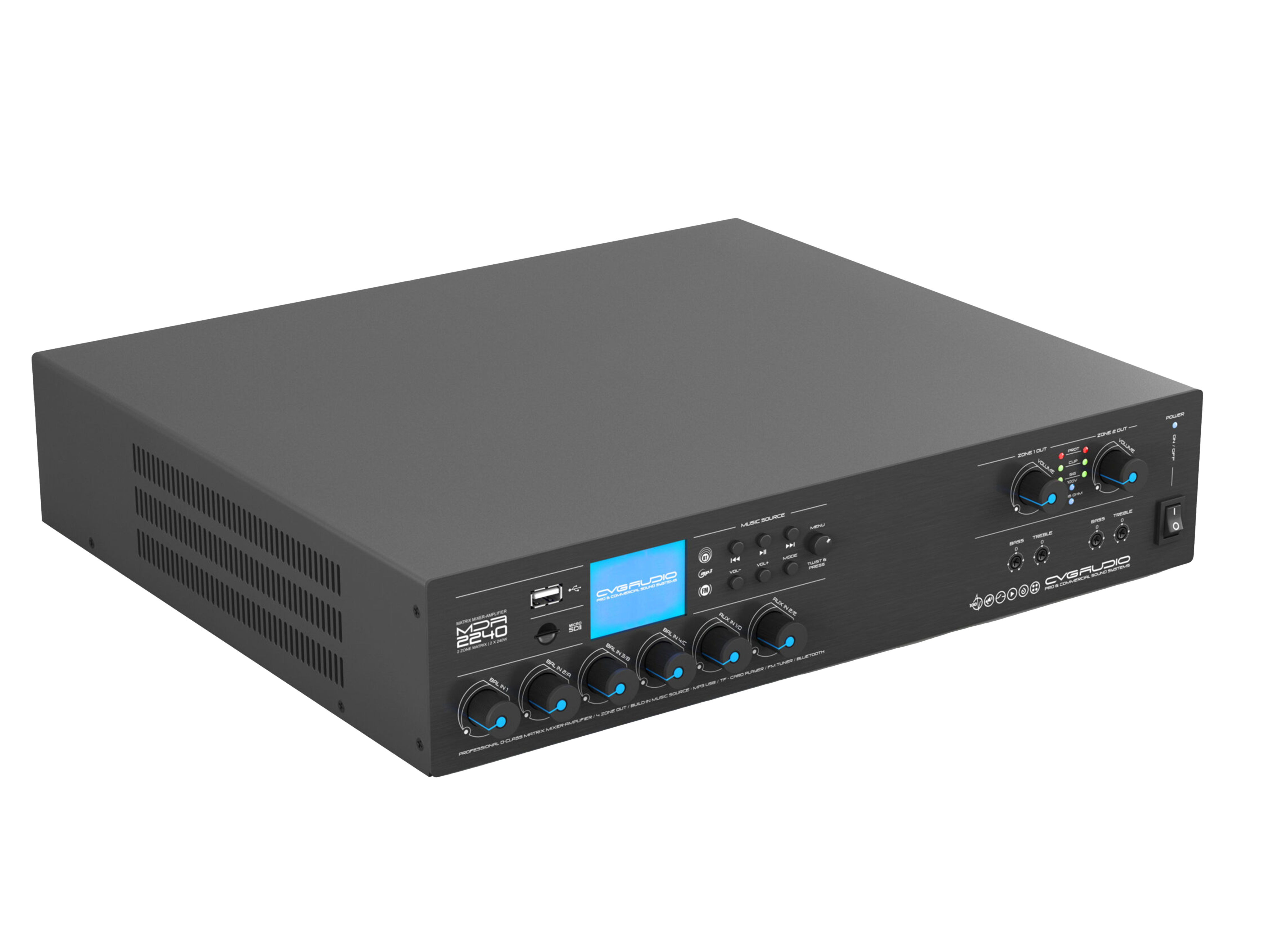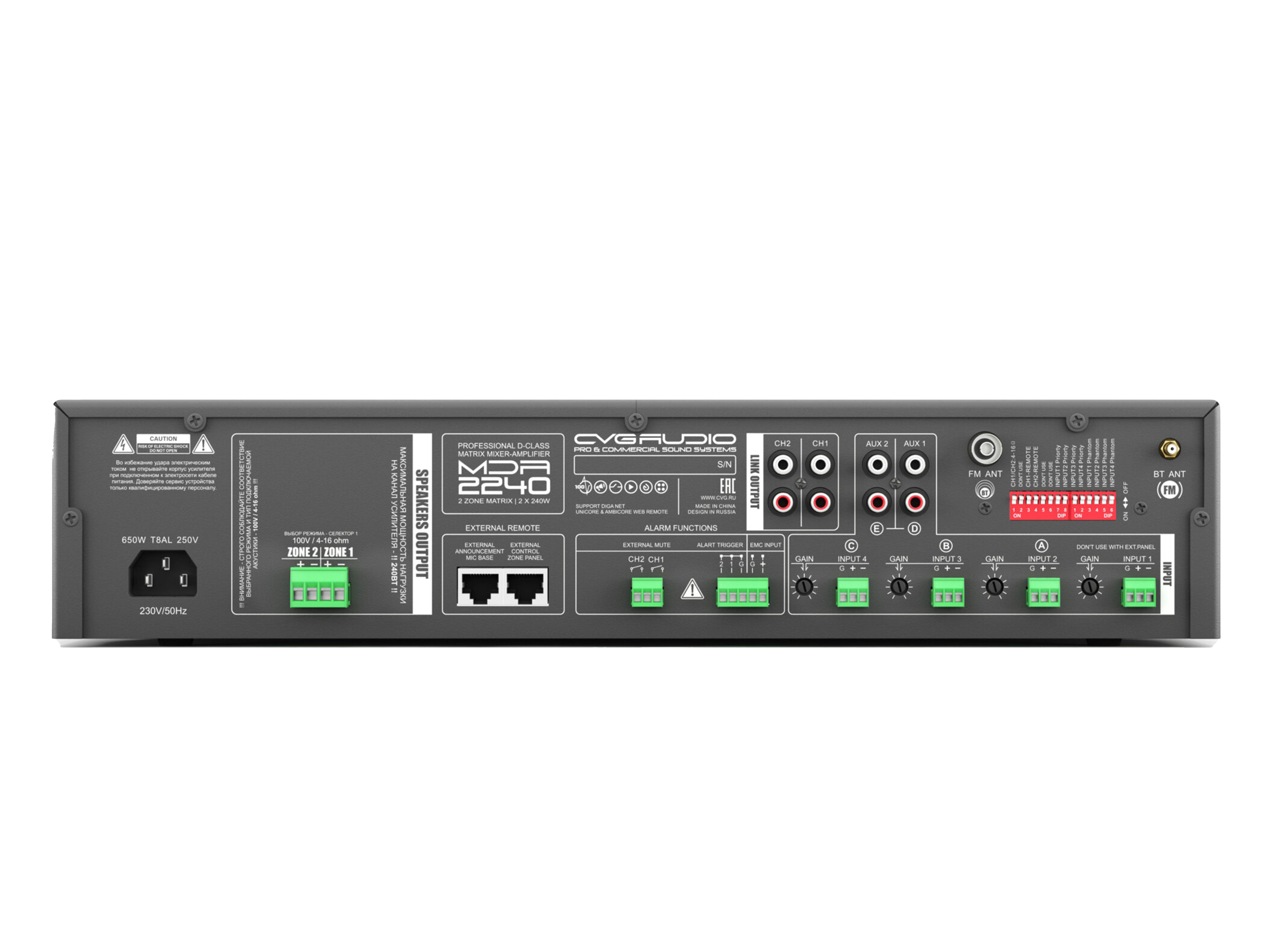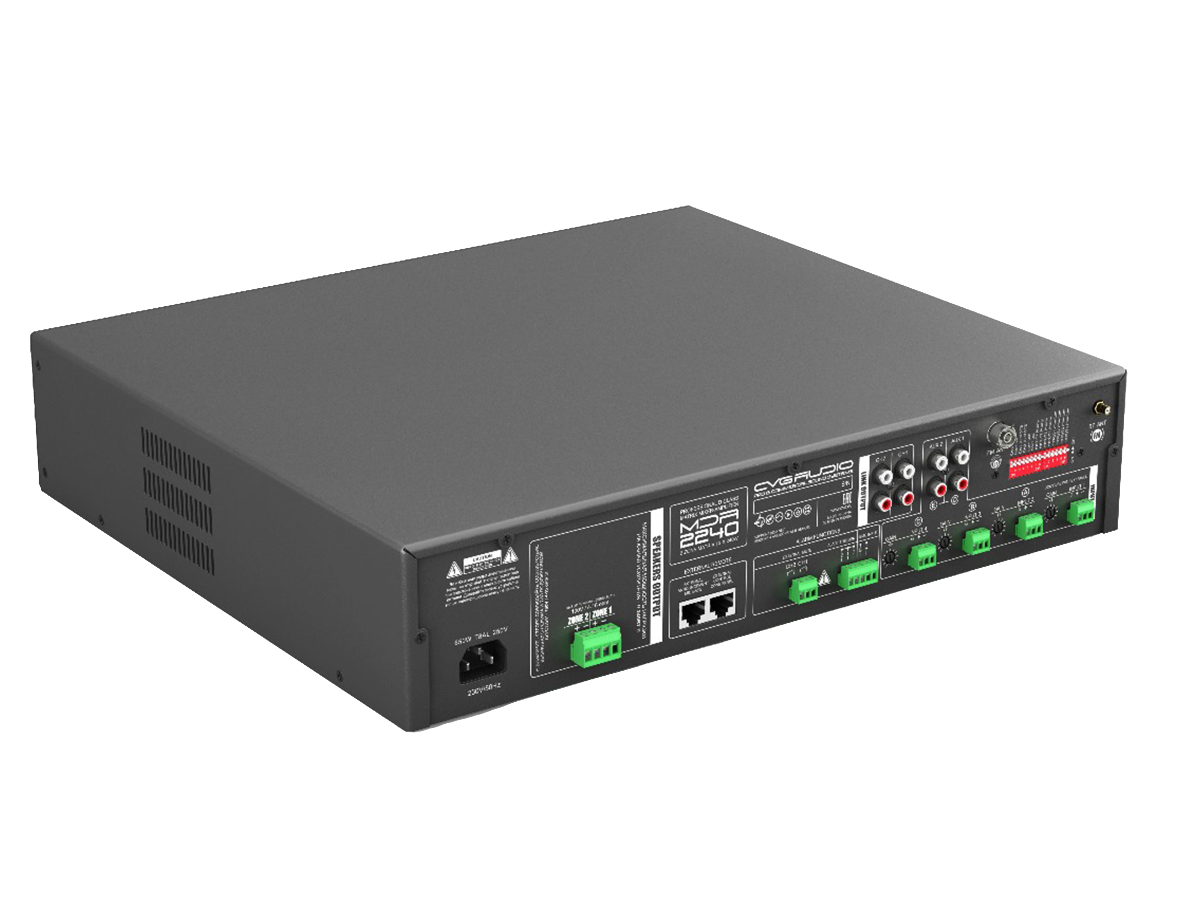 Профессиональный матричный двухзонный микшер-усилитель, класс D. Мощность 2х240W/100V или 4-16ohm. 4 х MIC/LINE балансных входа (3-pin EuroBlock), 2 х 2RCA небалансных AUX входа, встроенный блок источника сигнала, состоящий из microSD/USB плеера с поддержкой mp3/flac, Bluetooth модуля и FM тюнера. Каждый из шести подключаемых к входам усилителя звуковых устройств и встроенный модуль источника сигнала могут быть направлены в любую из двух зон. Аварийные контакты EXT.MUTE, ALARM TRIGGER, EMC IN аварийный вход с максимальным приоритетом. Поддержка подключения микрофонных консолей с выбором зоны вещания и зональных настенных регуляторов громкости и выбора входа. 2U, кронштейны в комплекте.