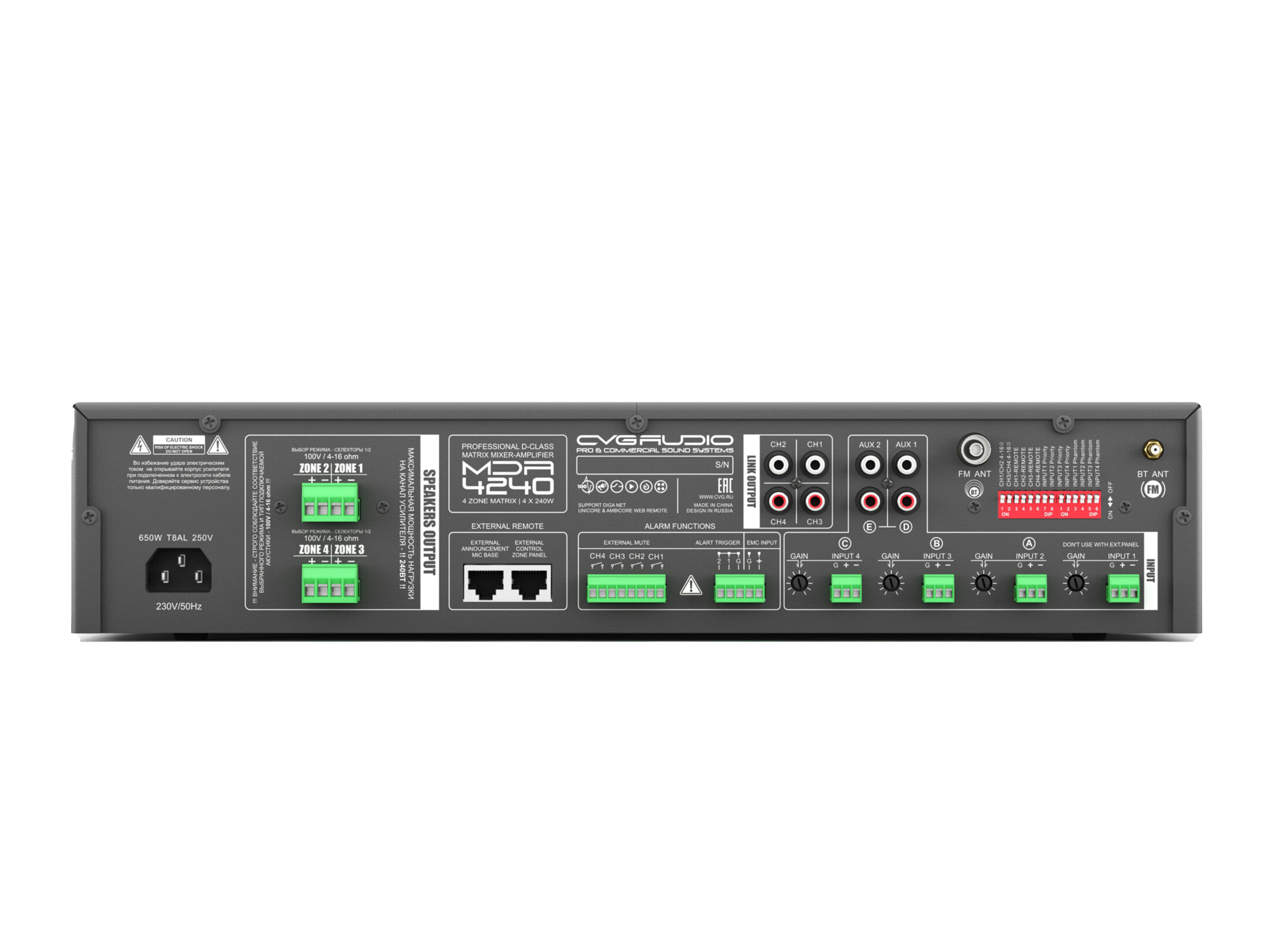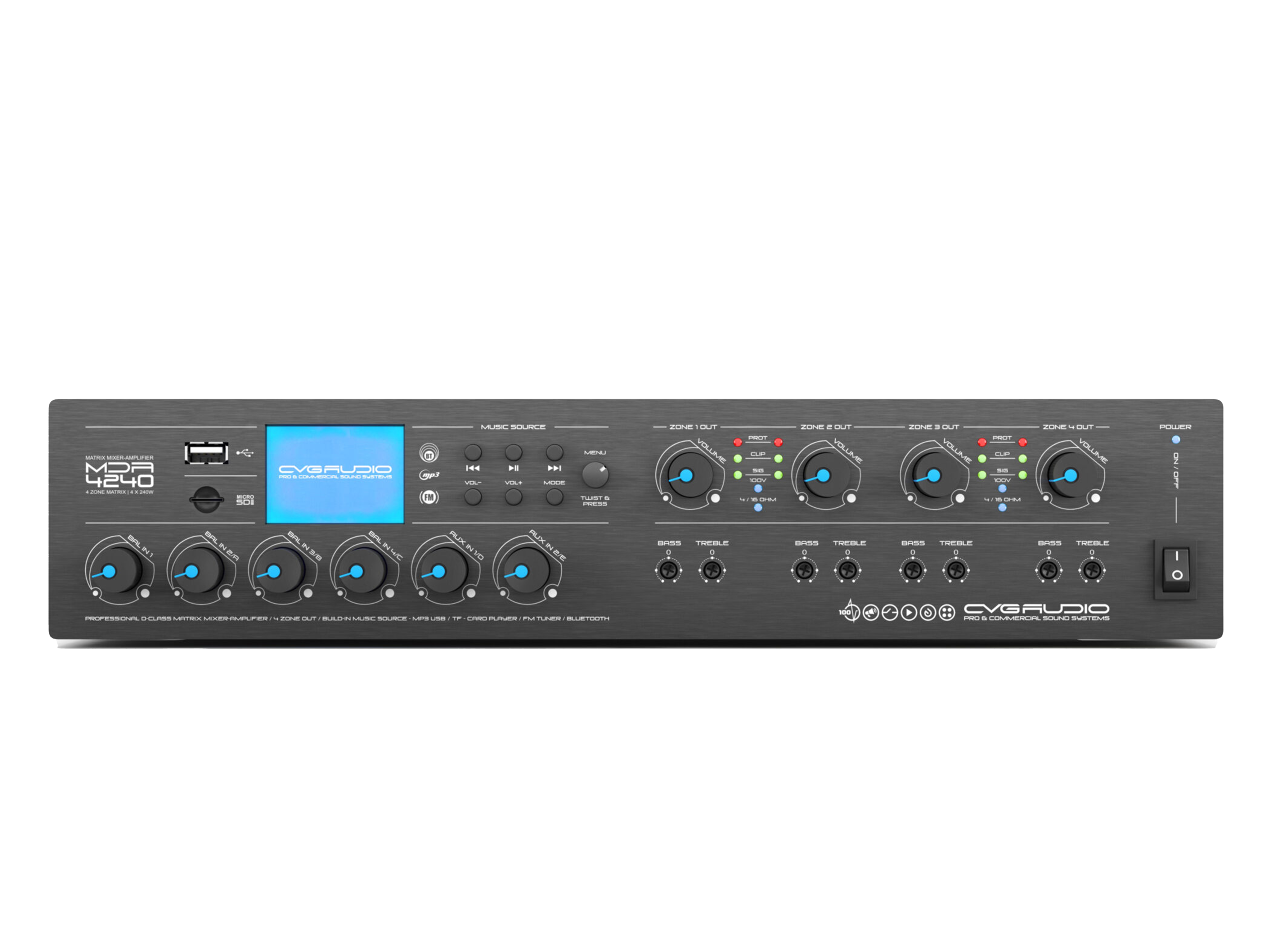 Профессиональный матричный четырехзонный микшер-усилитель, класс D. Мощность 4х240W/100V или 4-16ohm. 4 х MIC/LINE балансных входа (3-pin EuroBlock), 2 х 2RCA небалансных AUX входа, встроенный блок источника сигнала, состоящий из microSD/USB плеера с поддержкой mp3/flac, Bluetooth модуля и FM тюнера. Каждый из шести подключаемых к входам усилителя звуковых устройств и встроенный модуль источника сигнала могут быть направлены в любую из четырех зон. Аварийные контакты EXT.MUTE, ALARM TRIGGER, EMC IN аварийный вход с максимальным приоритетом. Поддержка подключения микрофонных консолей с выбором зоны вещания и зональных настенных регуляторов громкости и выбора входа. 2U, кронштейны в комплекте.