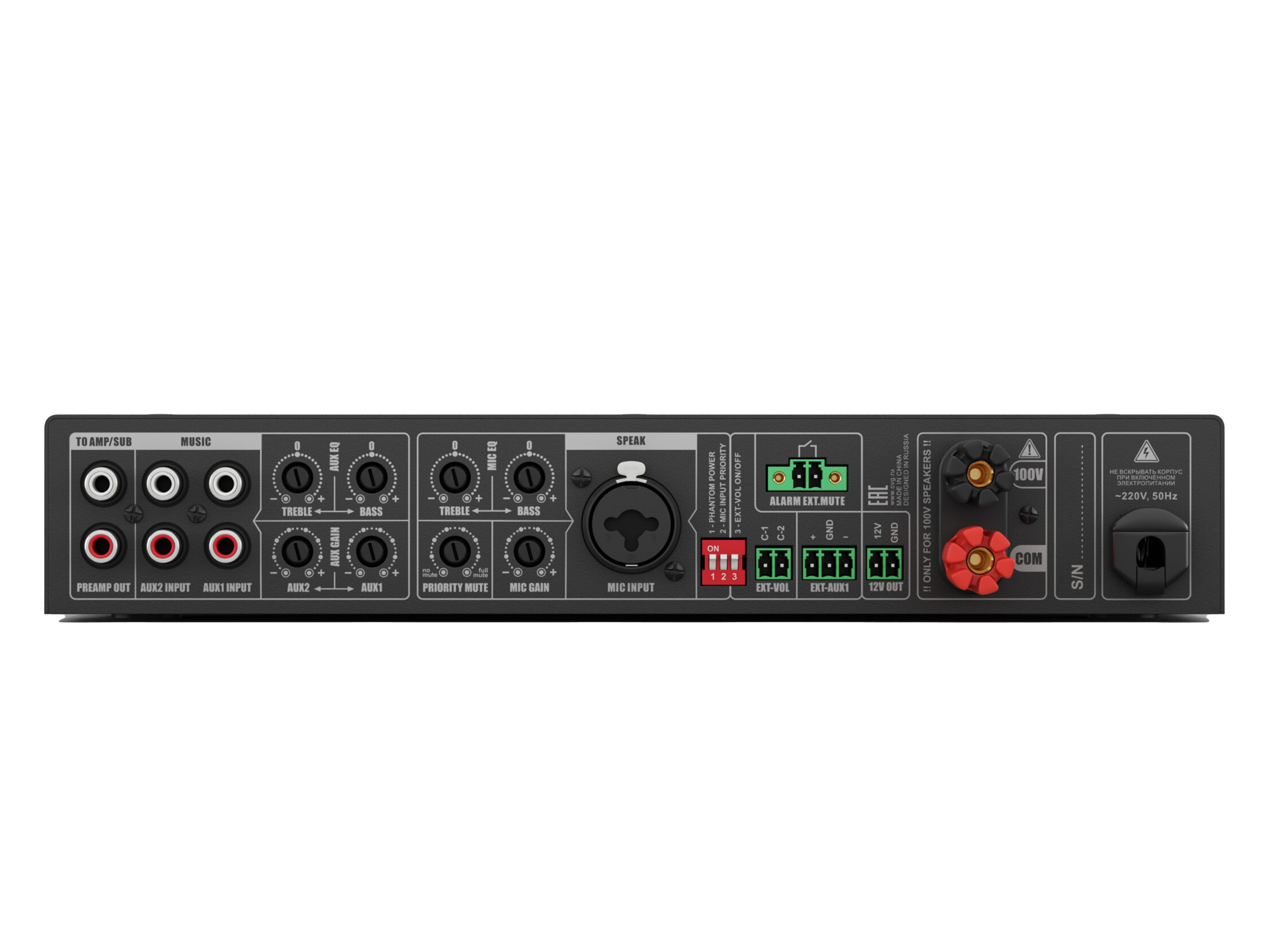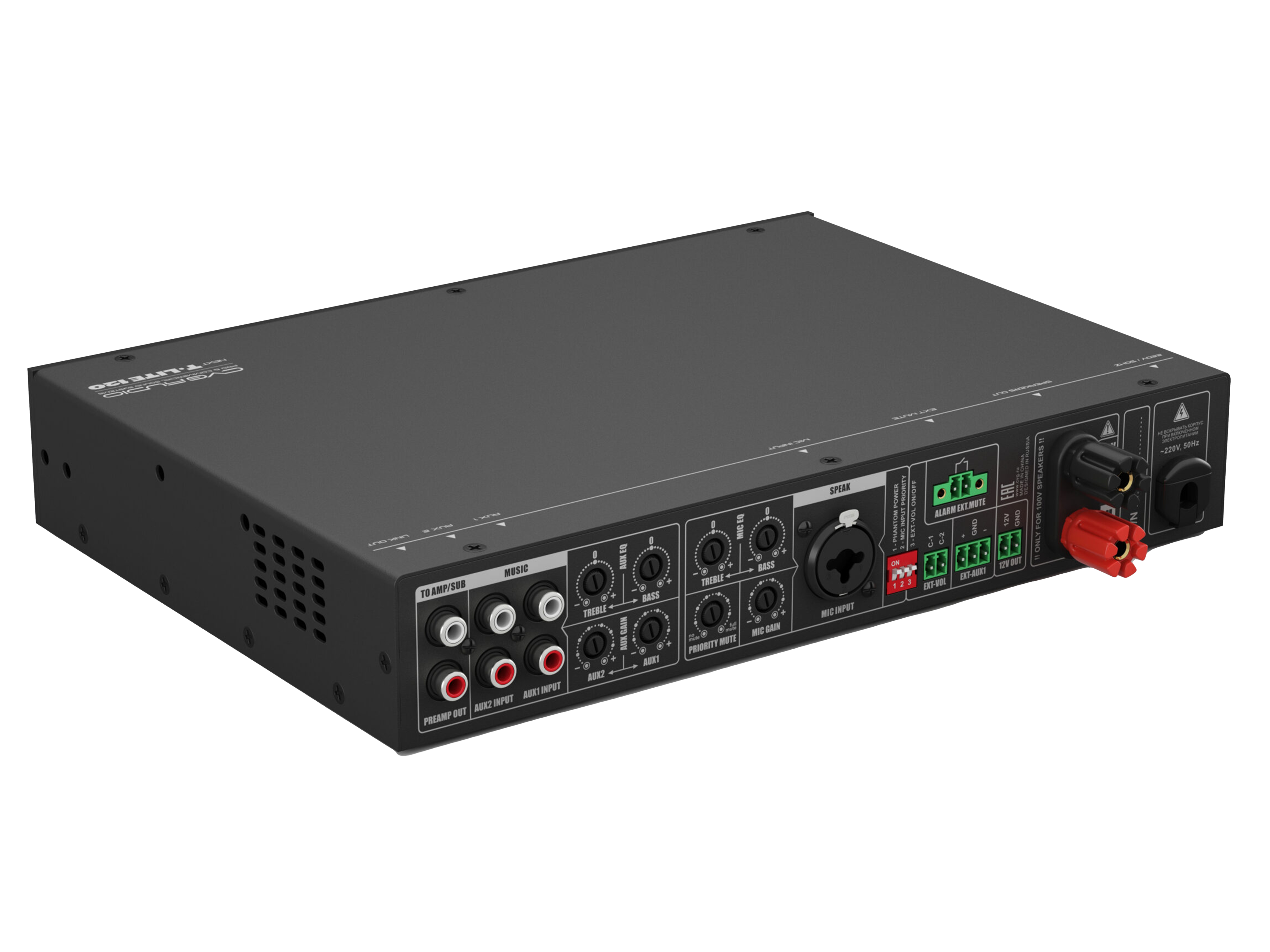 Профессиональный микшер-усилитель для качественных 100V систем фонового звука и оповещения, мощность 120W/100V, D-class, два селективных Line-in 2х2RCA, универсальный Mic-in TRS/XLR (фантомное питание, управляемый приоритет, настраиваемый уровень приглушения). Подключение по CAT5E/CAT6 удаленного регулятора громкости и универсального источника сигнала (mp3-flac плеер / Fm тюнер / Bluetooth), максимальная дистанция 50m. Управляющие пожарные контакты EXT.MUTE. Раздельное управление громкостью и эквализацией линейного и микрофонного входов.