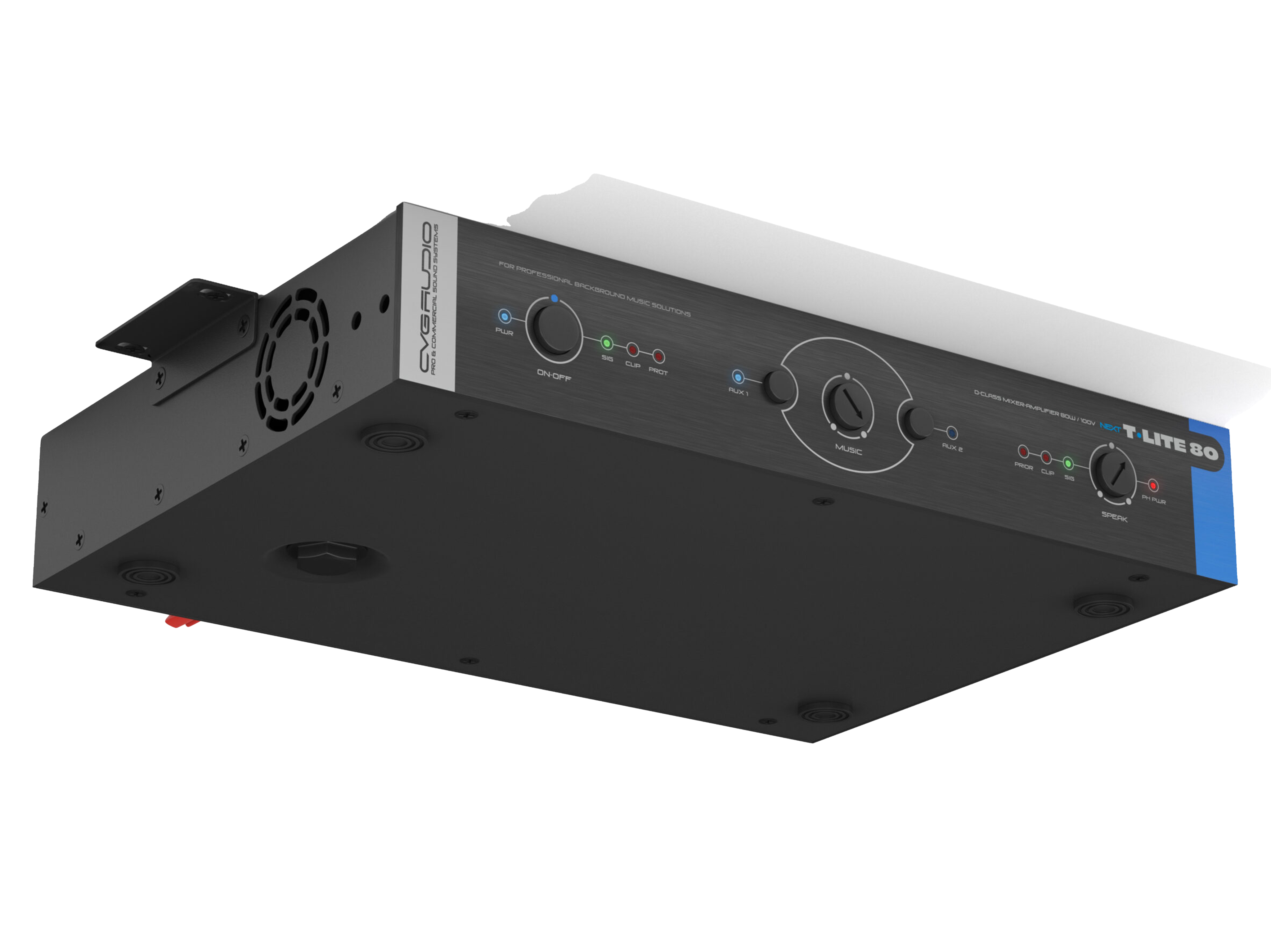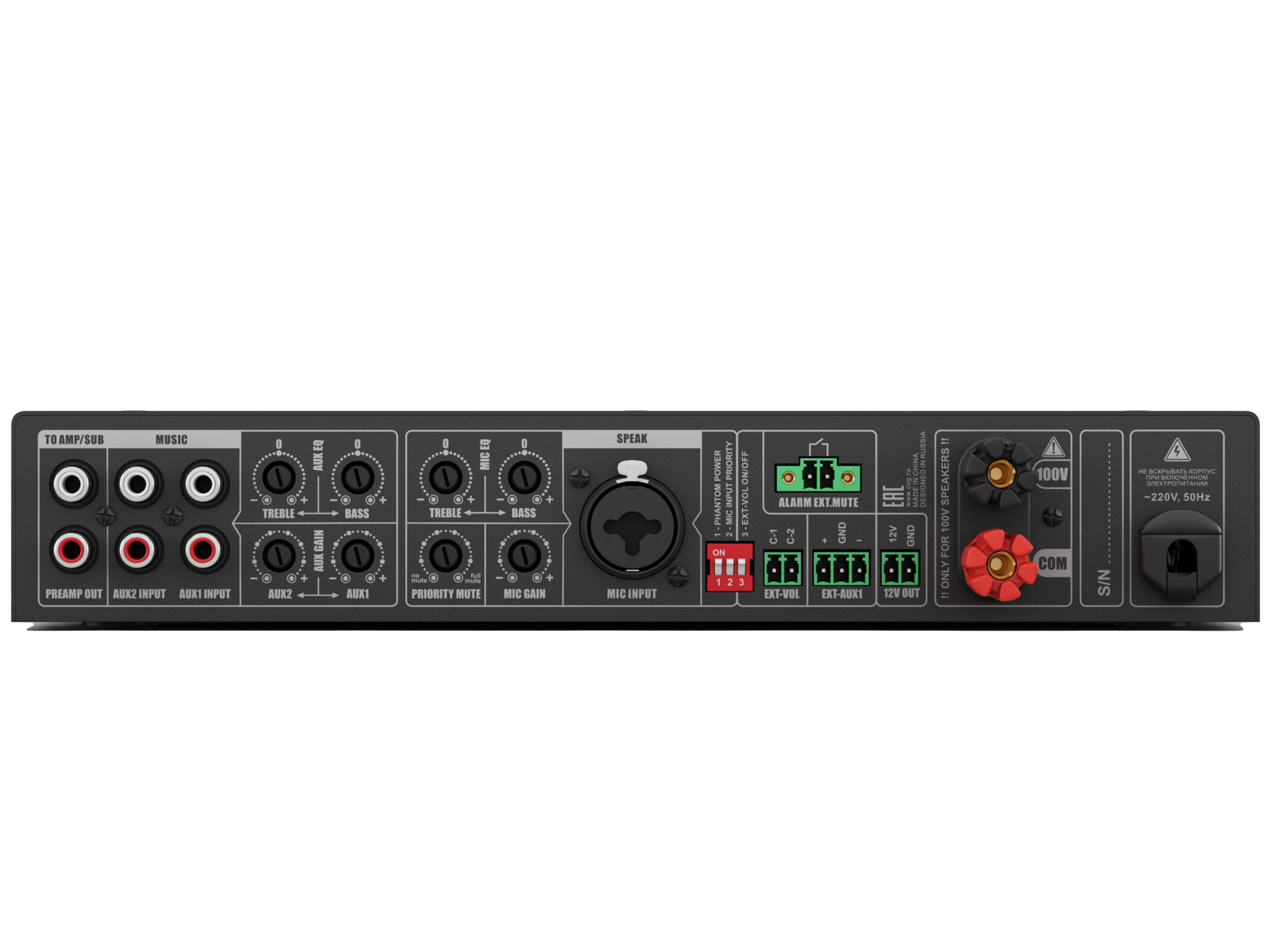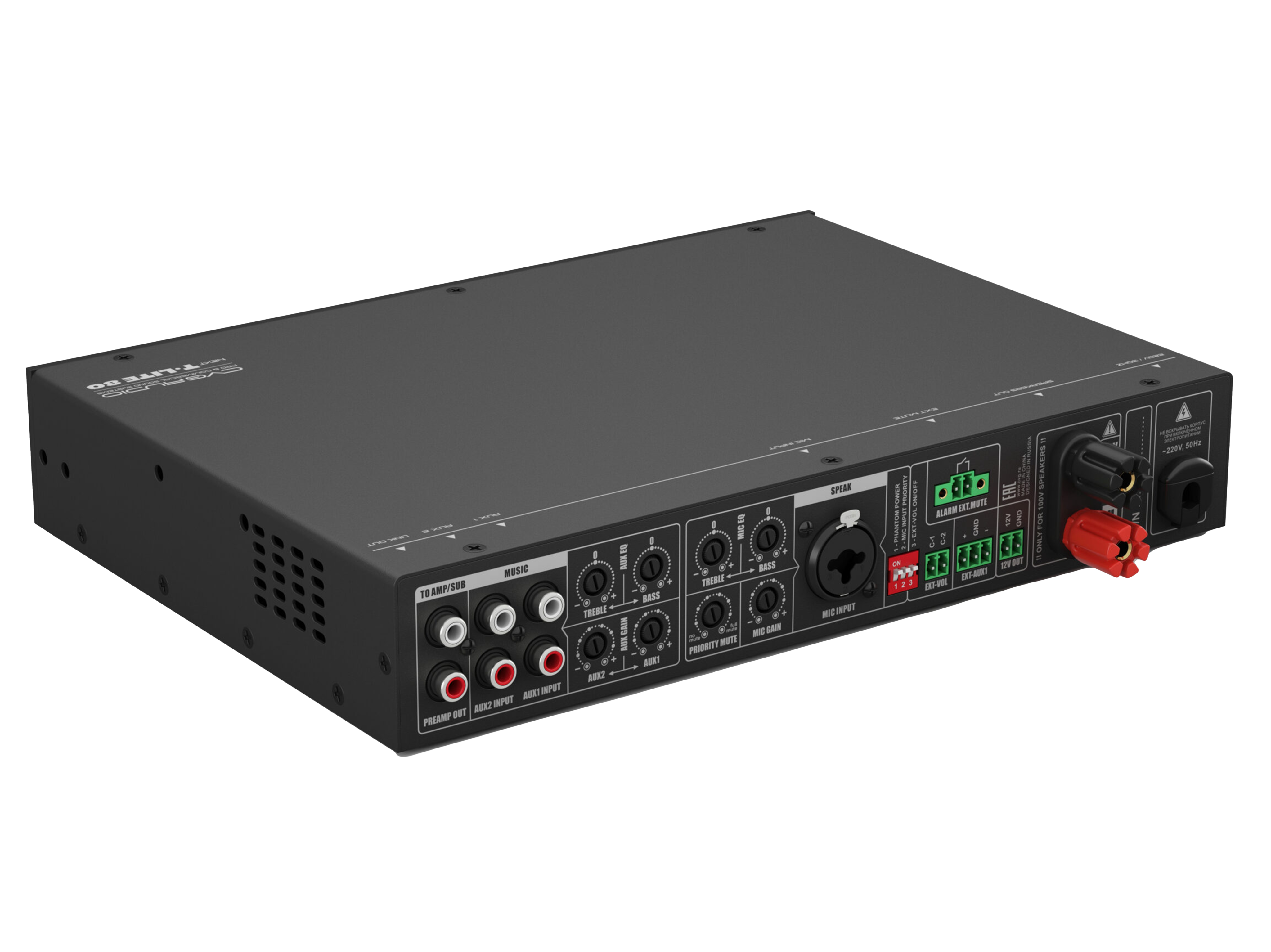 Профессиональный микшер-усилитель для качественных 100V систем фонового звука и оповещения, мощность 80W/100V, D-class, два селективных Line-in 2х2RCA, универсальный Mic-in TRS/XLR (фантомное питание, управляемый приоритет, настраиваемый уровень приглушения). Подключение по CAT5E/CAT6 удаленного регулятора громкости и универсального источника сигнала (mp3-flac плеер / Fm тюнер / Bluetooth), максимальная дистанция 50m. Управляющие пожарные контакты EXT.MUTE. Раздельное управление громкостью и эквализацией линейного и микрофонного входов.