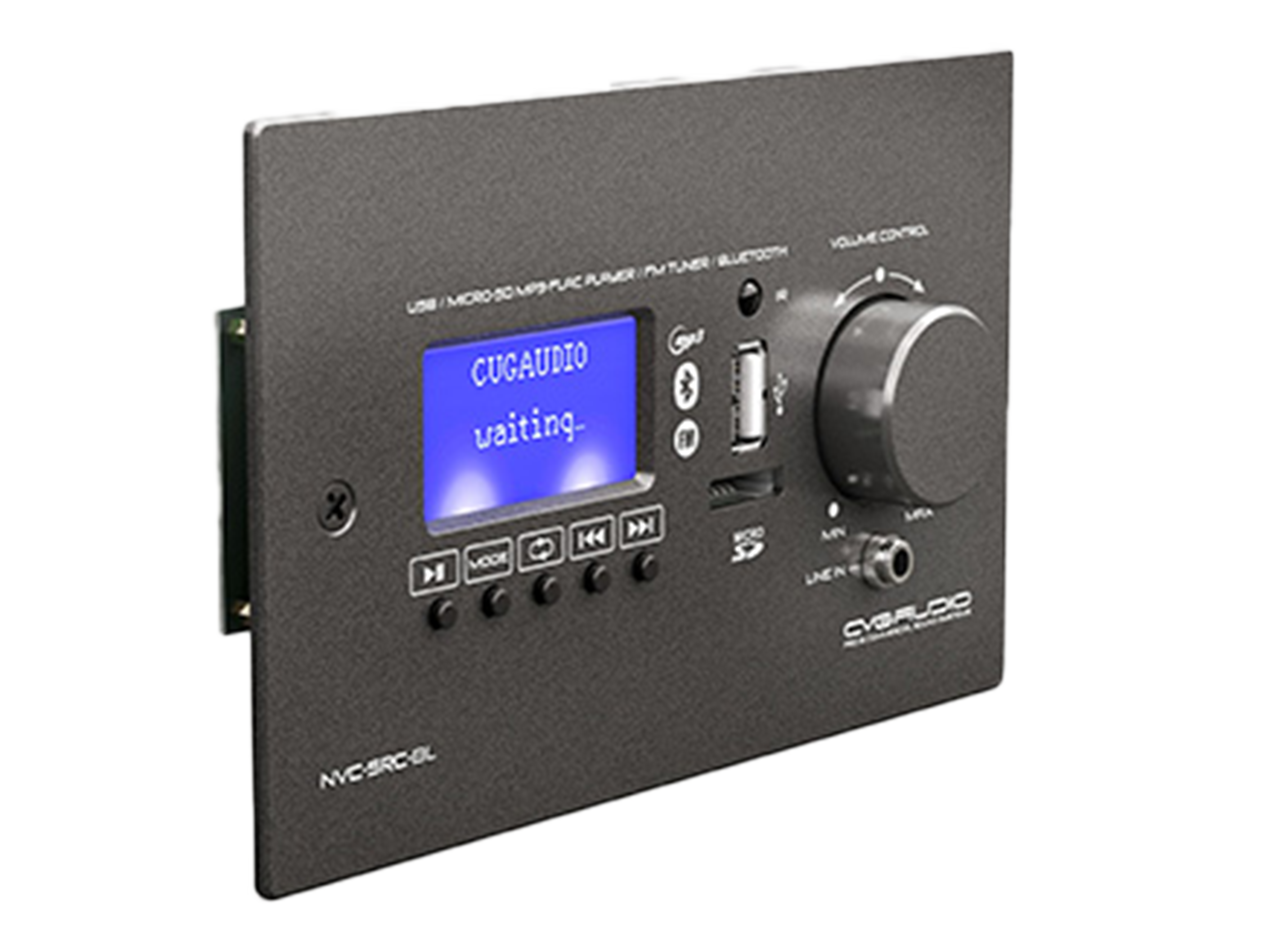 Настенный удаленный регулятор громкости с интегрированным универсальным источником сигнала MP3/BLUETOOTH/FM и линейным входом. Модуль предназначен для совместной работы с микшерами-усилителями CVGAUDIO серии NEXT. Интегрированный регулятор громкости управляет уровнем активного линейного входа усилителя. Модель предназначена для встроенной или накладной установка. Лицевая панель изготовлена из анодированного алюминия, цвет черный металлик. Размер лицевой панели – 155mm х 95mm.