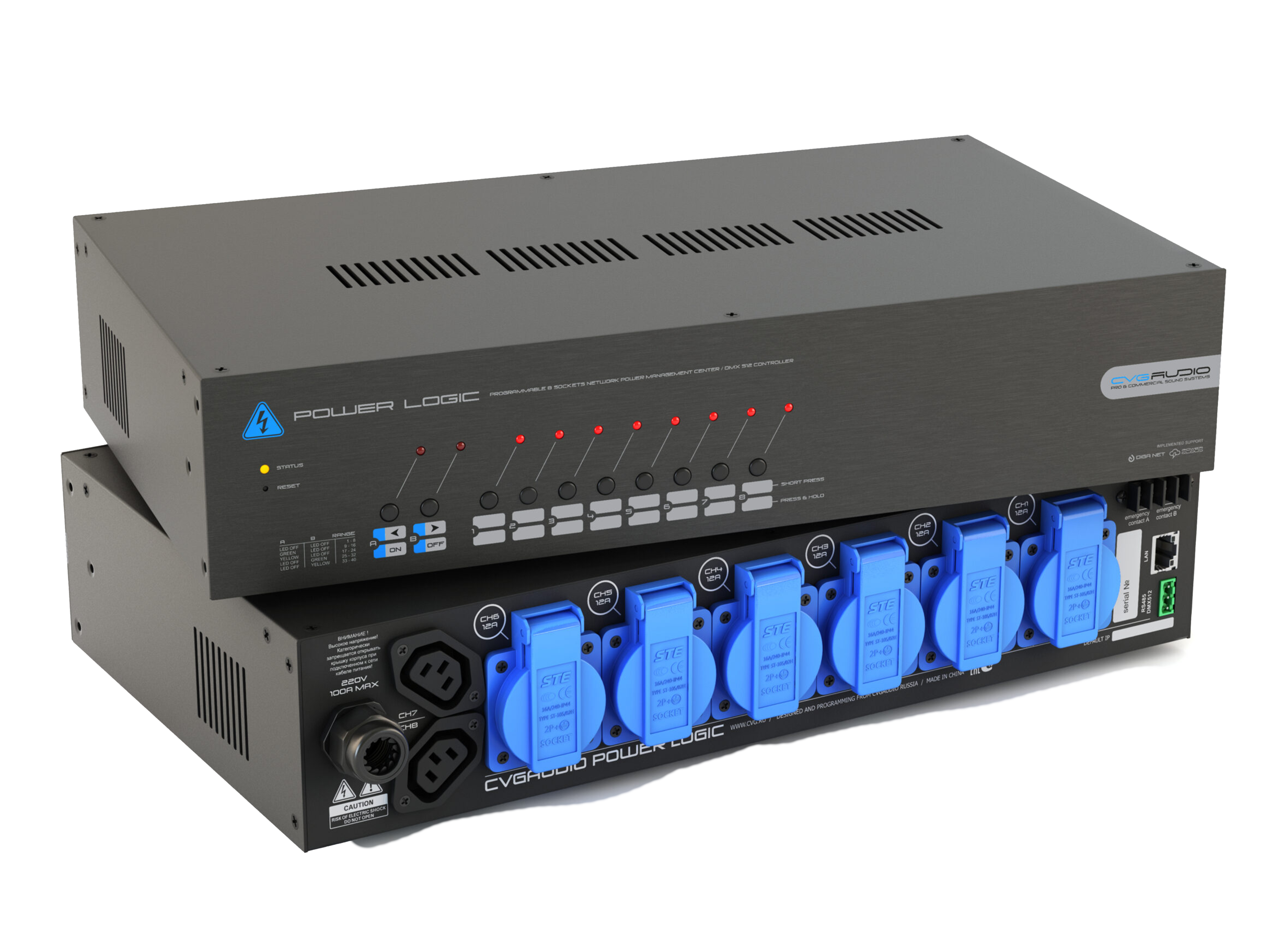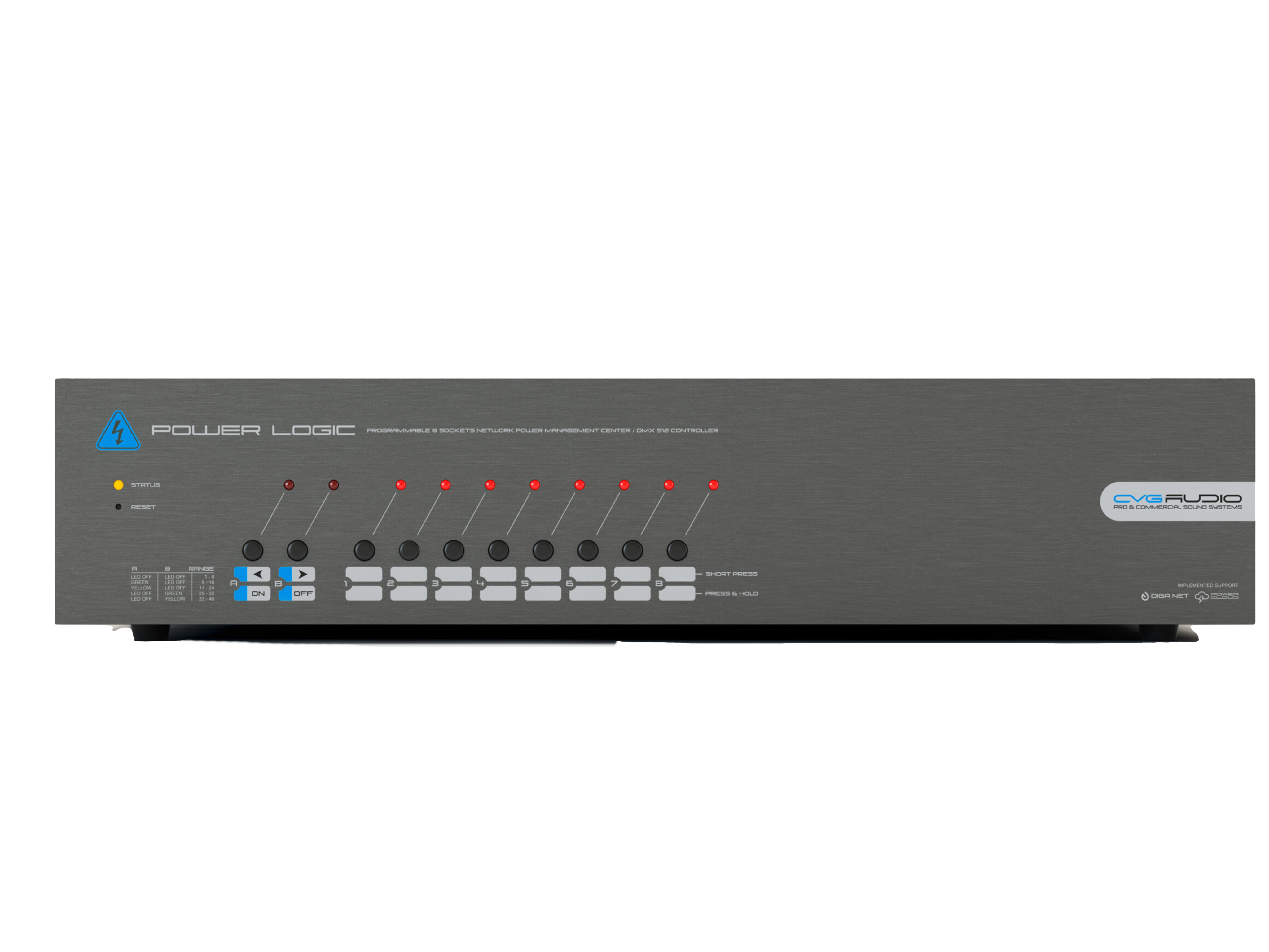 CVGAUDIO Power Logic - программируемый контроллер управления электропитанием на 8 розеток 220V / нагрузка до 11кВт/50A, модуль последовательного включения с программируемыми последовательностями и задержками, свободно масштабируется на любое количество устройств сквозными UDP командами, контроллер программирования и управления интерьерным и архитектурным светодиодным освещением по протоколу DMX512, порт TCP-IP, RS485, 2 Logic Input, веб интерфейс, часы реального времени с недельным таймером,2U