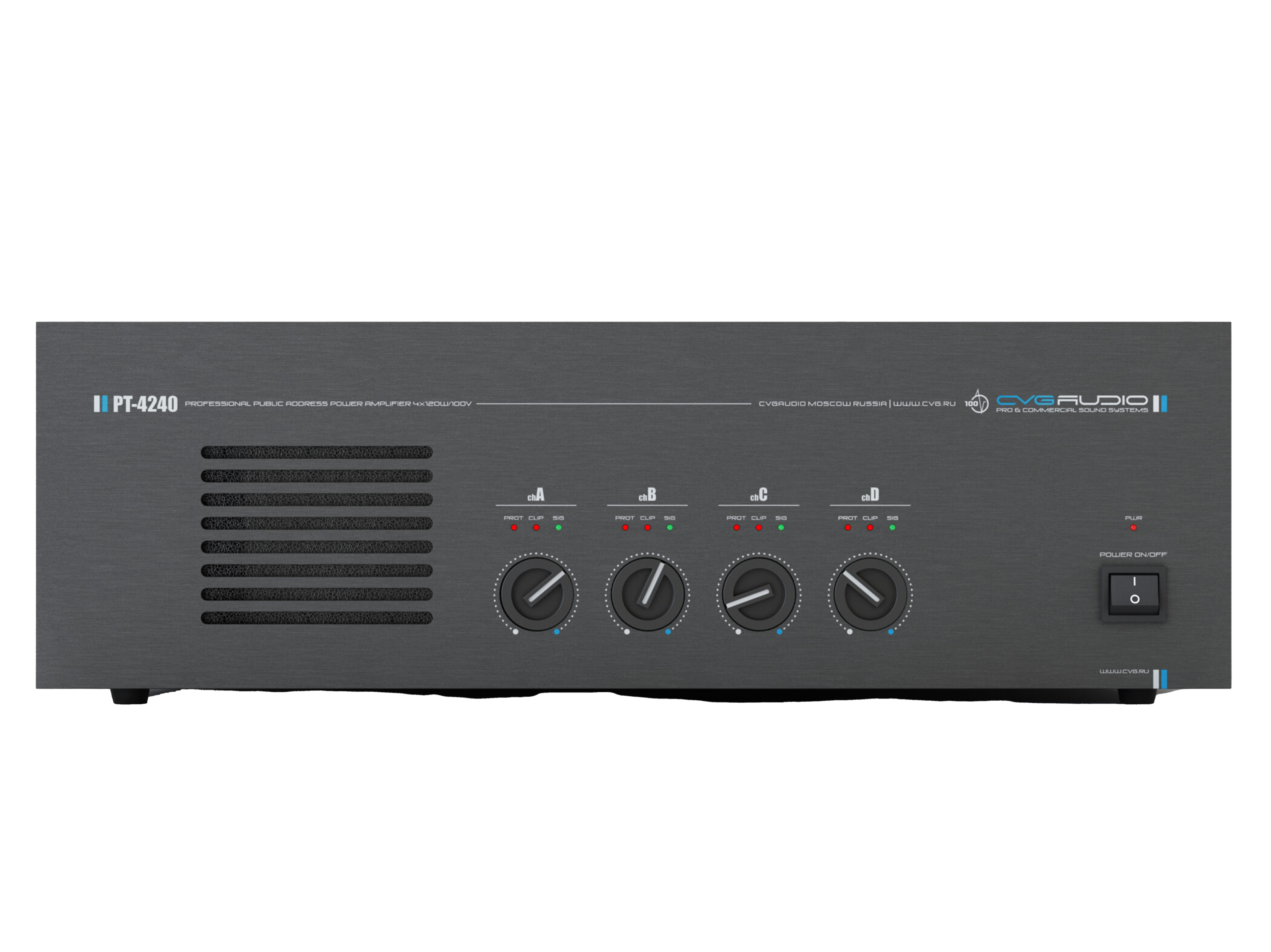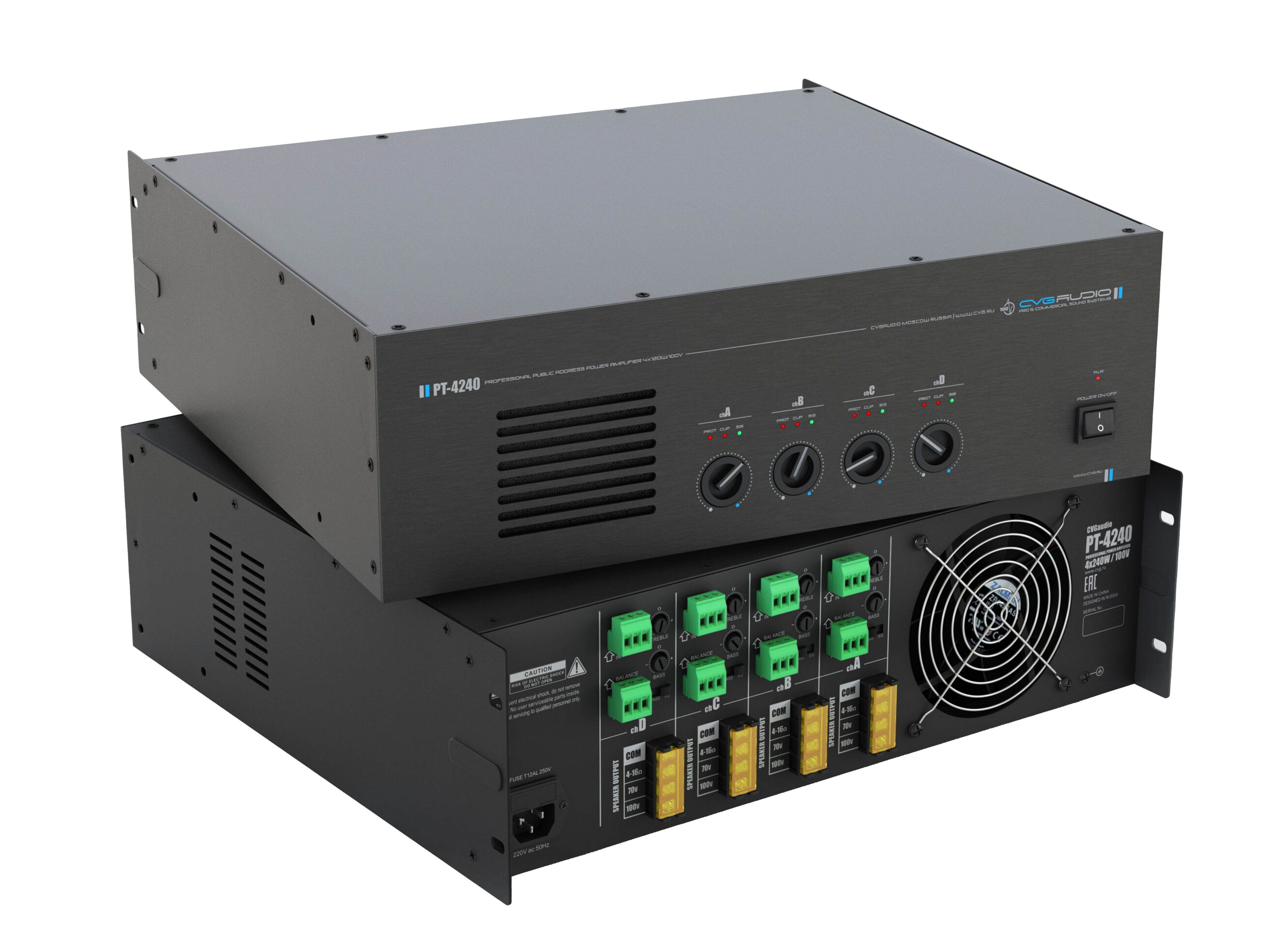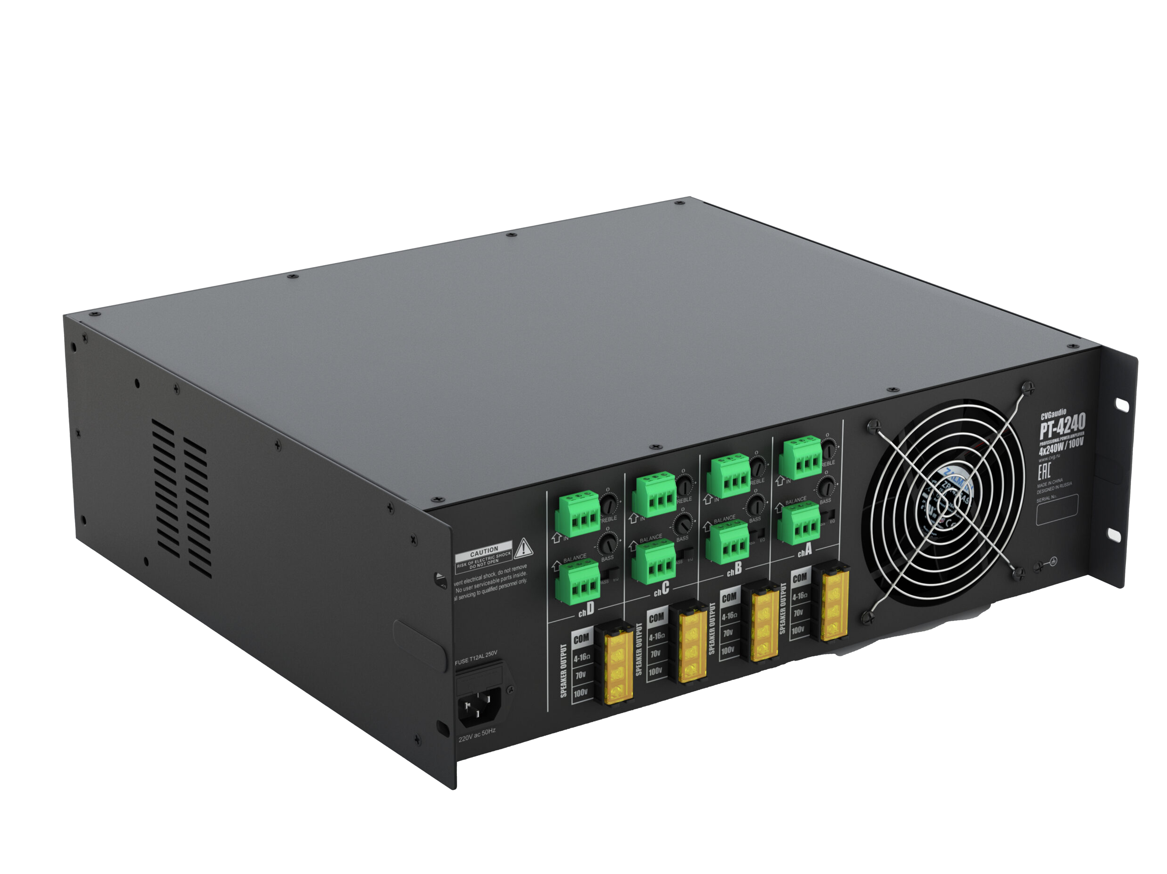 Профессиональный четырехканальный высококачественный усилитель мощности для многозонных систем трансляции фоновой музыки и речевого оповещения, четыре независимых канала усиления по 240W/100V, балансный Euro Block вход, линкующий балансный Euro Block выход раздельно для каждого канала. Двухполосный эквалайзер для каждого канала с возможностью режима обхода (ByPass), активное охлаждение. Металлический корпус, алюминиевая лицевая панель, высота в монтажной стойке – 3U (кронштейны в комплекте поставки)
