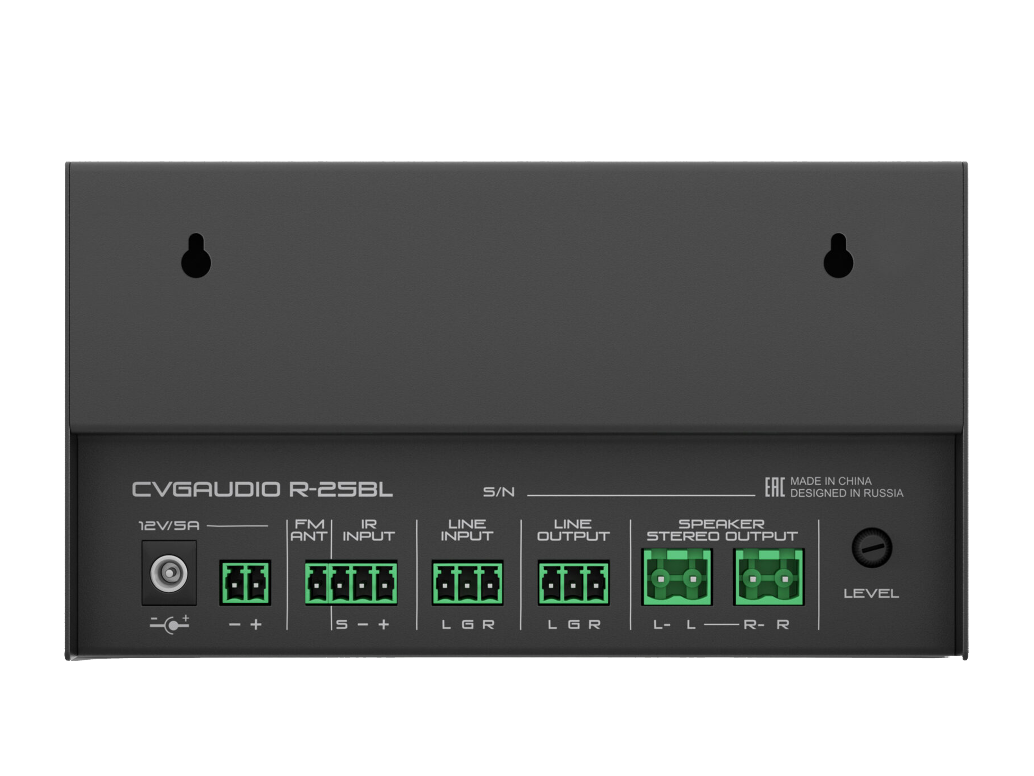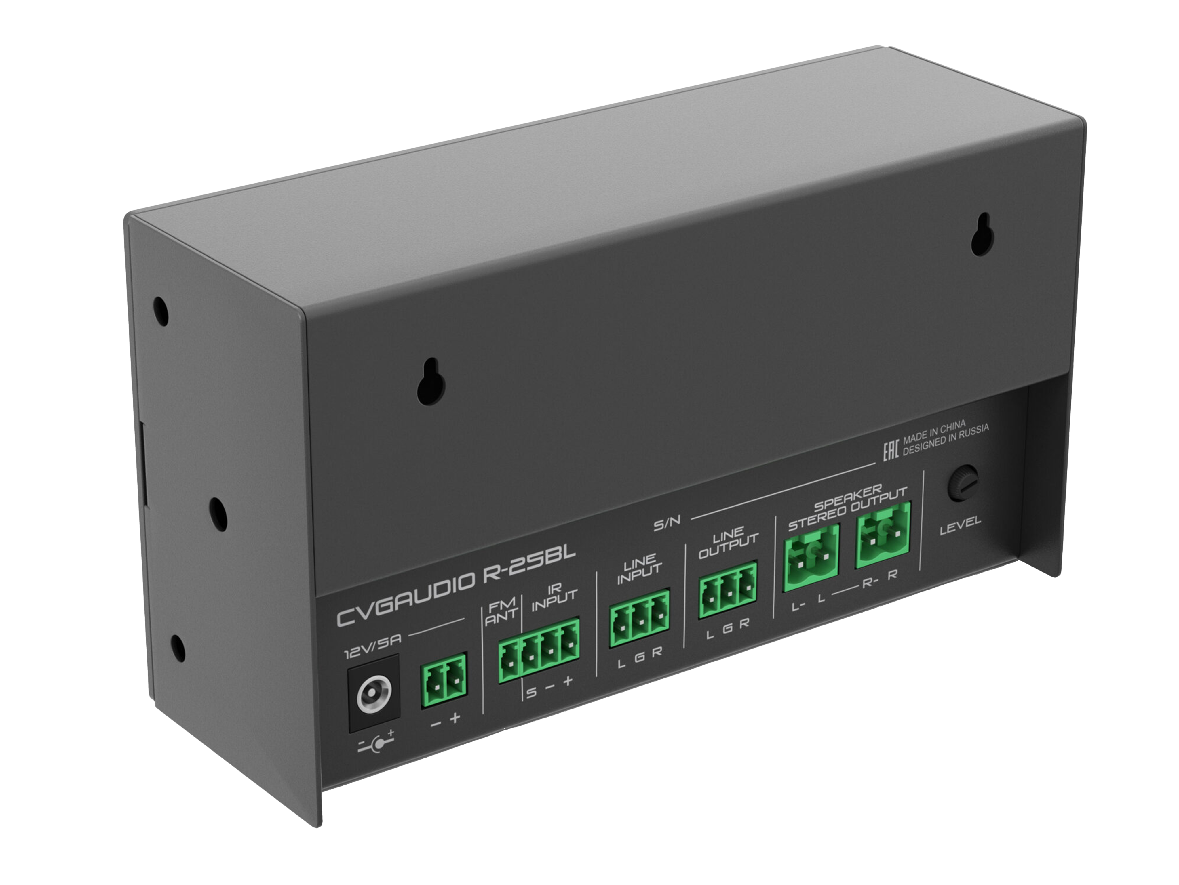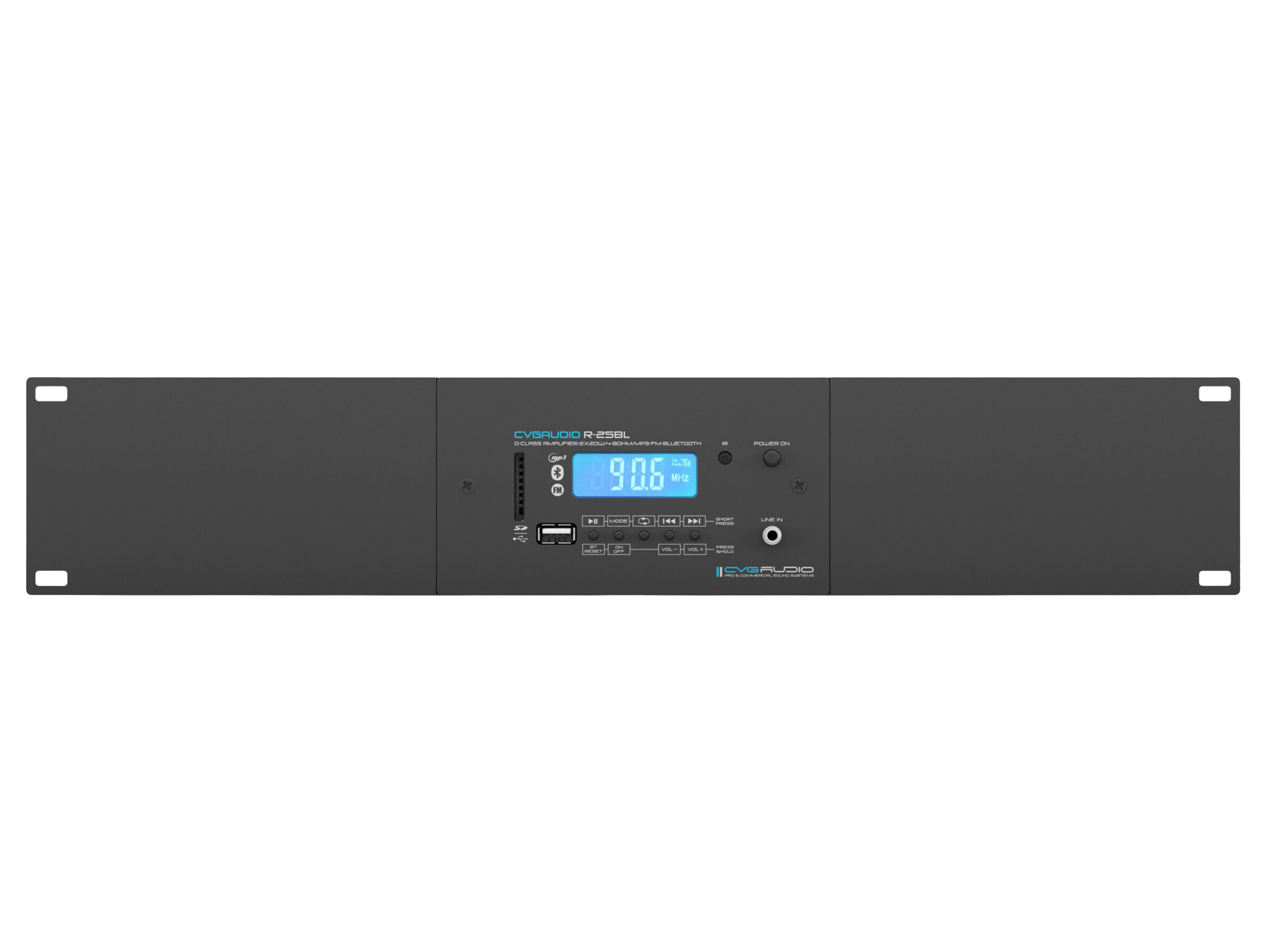 Миниатюрный настенный низкоомный (low-impednce) двухканальный (stereo) микшер-усилитель для бюджетных систем коммерческого фонового звука. Встроенный модуль источника сигнала, состоящий из mp3 плеера с возможность воспроизведения файлов mp3/flac с usd флешь накопителей и SDcard, FM радио с возможностью подключения внешней антенны и модуль Bluetooth. Линейный вход (Aux in), линейный выход (Line out), дистанционный IR пульт управления, металлический корпус черного цвета. Блок питания 12V/5A в стандартном комплекте поставки.
