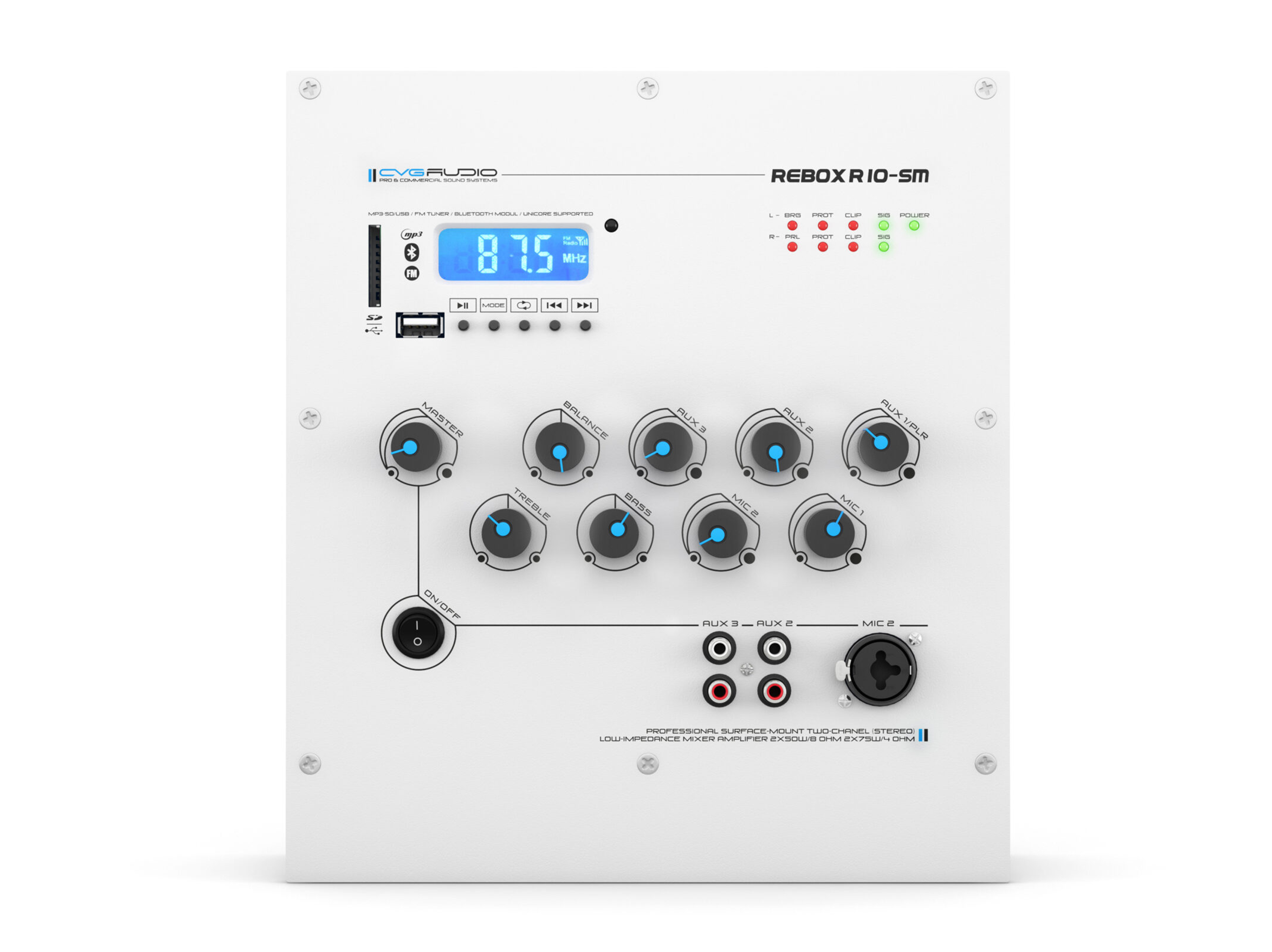 Профессиональный двухканальный стерео Low-impedance микшер-усилитель для настенной установки, встроенный модуль MP3/FM/BLUETOOTH. Мощность — 2х50W (8ohm), 2х75W (4ohm), в режиме Bridge – 140W (8ohm). Корректный диапазон сопротивления нагрузки 4-16ohm. 2 балансных микрофонных входа на разъемах 3pin EUROBLOCK на скрытой панели, XLR/TRS Jack на лицевой панели, ON/OFF активация приоритета и подача фантомного питания 24V, 2х 2RCA линейных входов на лицевой панели и 1x 3 pin EuroBlock на скрытой. Line Output, IR input для внешнего управления модулем плеера. Металлический белый корпус.