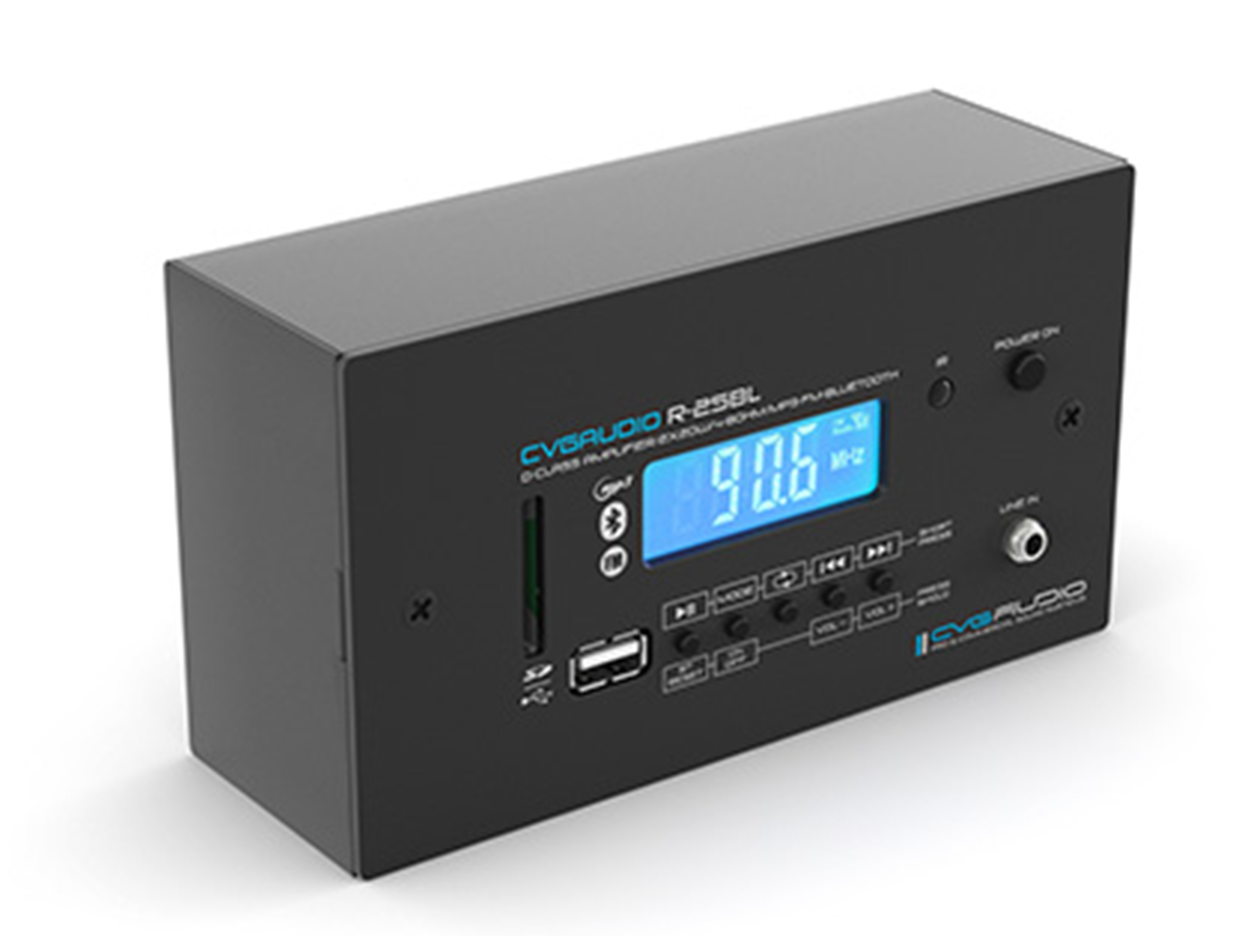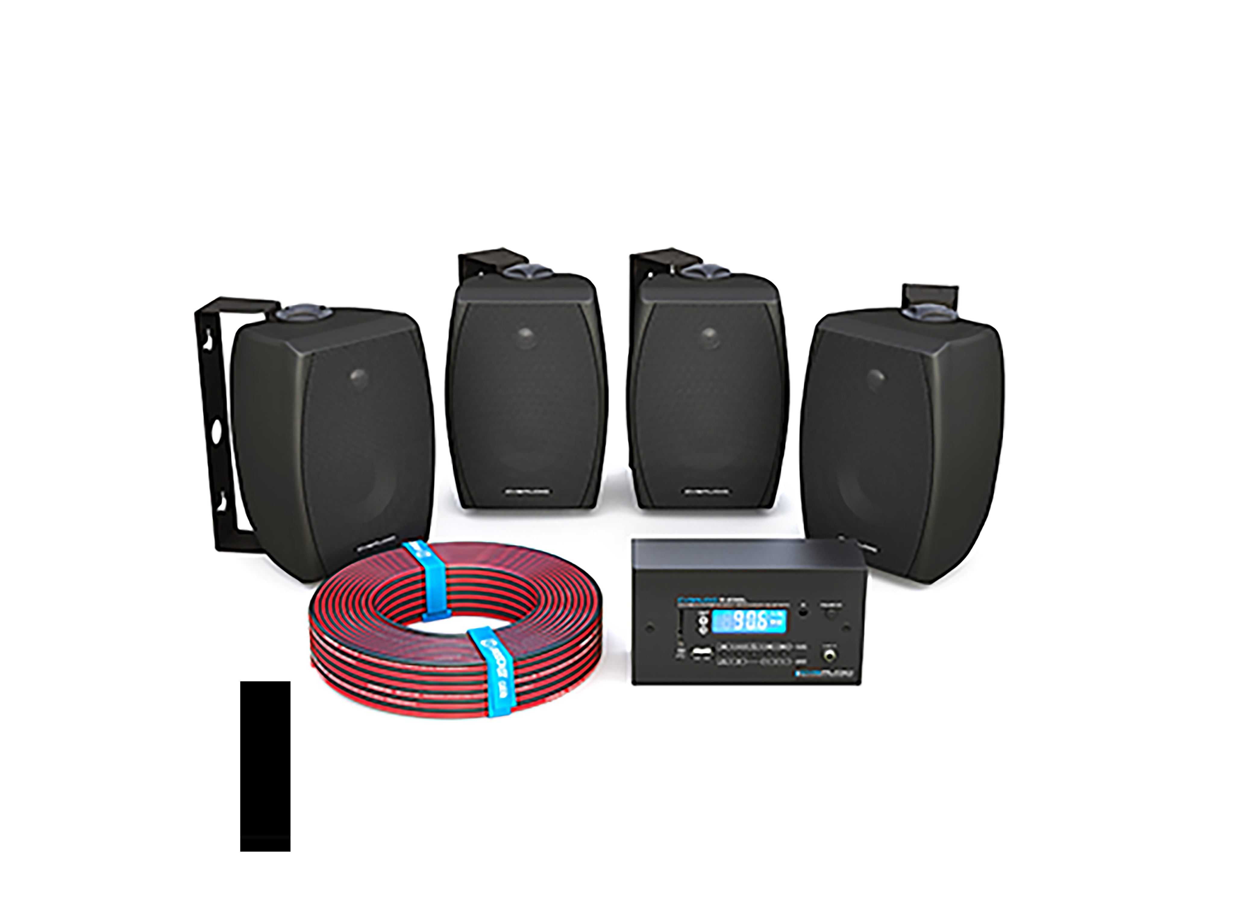 Комплект звукового оборудования и коммутации для системы трансляции фоновой музыки, четыре двухполосные корпусные настенные АС, площадь озвучивания до 80m2. Усилитель 2х25W/4ohm, встроенный модуль плеера MP3-FLAC (USB-SDcard) / FM / Bluetooth, линейный вход для подключения внешних источников сигнала. Цвет акустики — черный.