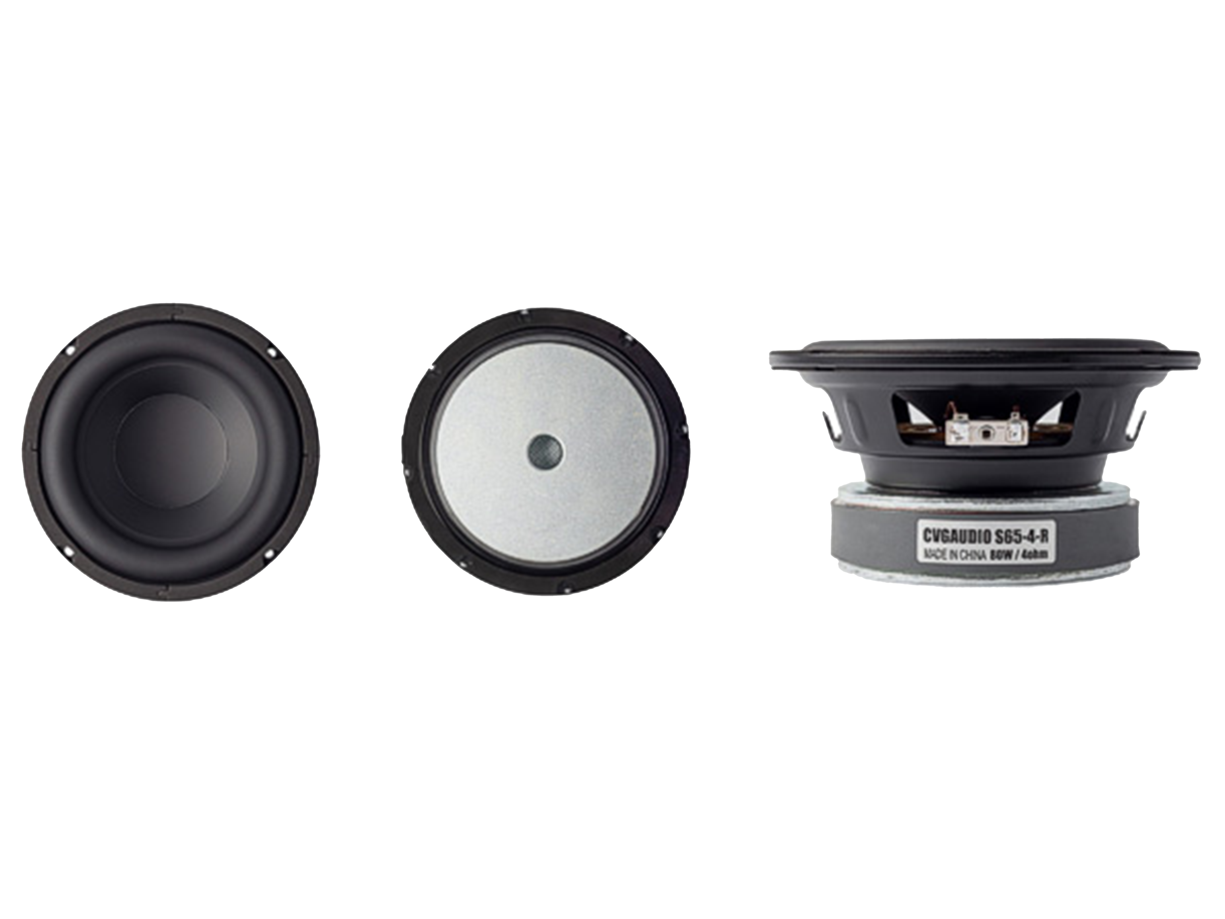 CVGAUDIO S65-4-R - динамическая головка НЧ диапазона (сабвуфер). Номинальная мощность динамической головки – 80W (RMS), максимальная мощность 160 Вт. Размерность диффузора - 6,5” / 165mm. Номинальное сопротивление - 4ohm. Резонансная частота – 60Hz. Диффузор изготавливается из полипропилена высокой плотности, установлен на широкий пластичный резиновый подвес обеспечивающий его большой ход.