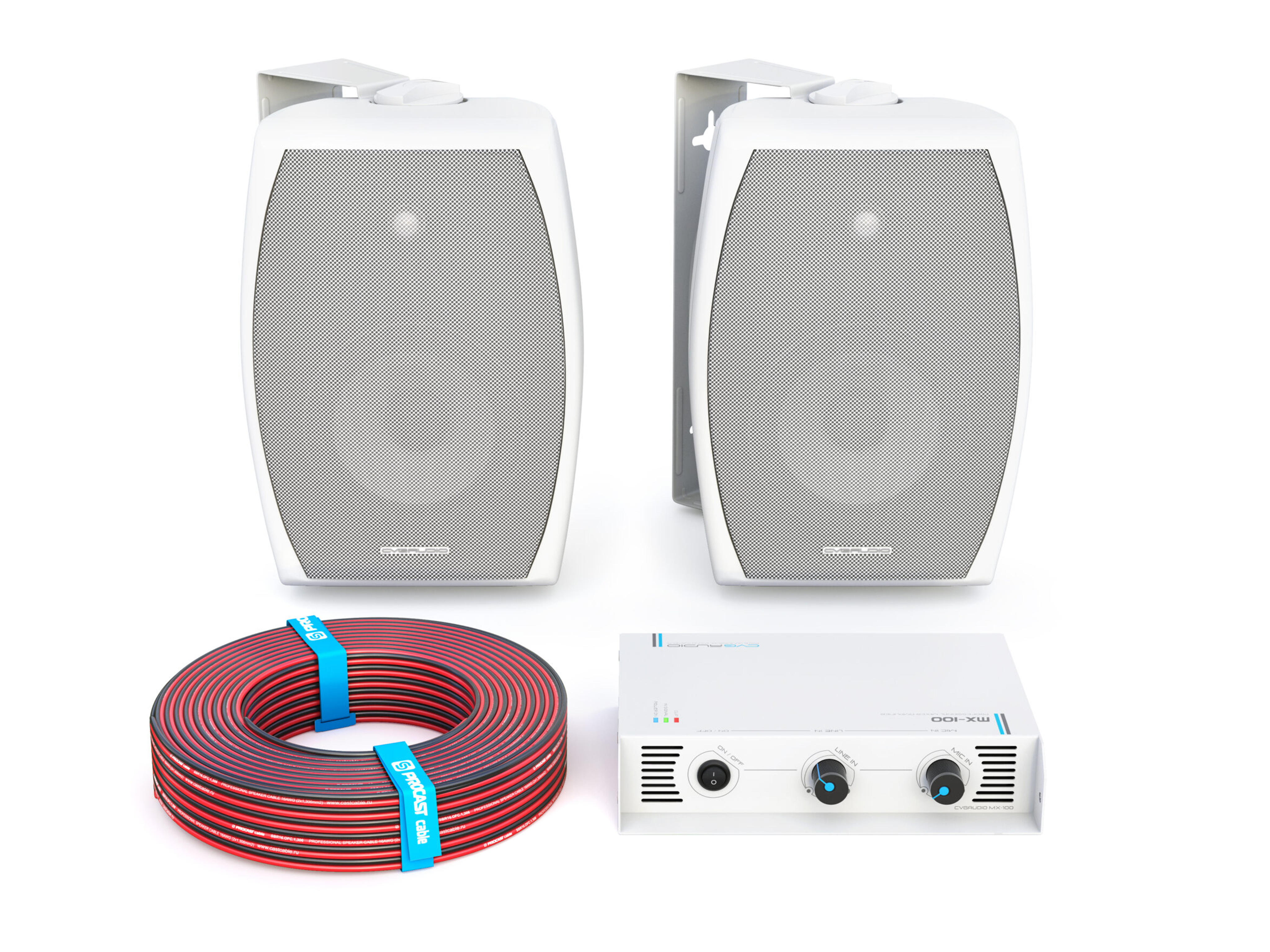 Комплект звукового оборудования и коммутации для систем трансляции фоновой музыки и речи. Комплект оптимален для использования в образовании (учебные классы) и офисных переговорных. Рекомендуется для помещений площадью до 50m2, длина до 8-ми метров. В комплекте две корпусные настенные акустические системы. Усилитель имеет один линейный вход LINE IN и один микрофонный MIC IN, мощность 2х50W/4ohm, предусмотрена возможность фиксации на стене. Блок питания в комплекте. Цвет акустики – белый.