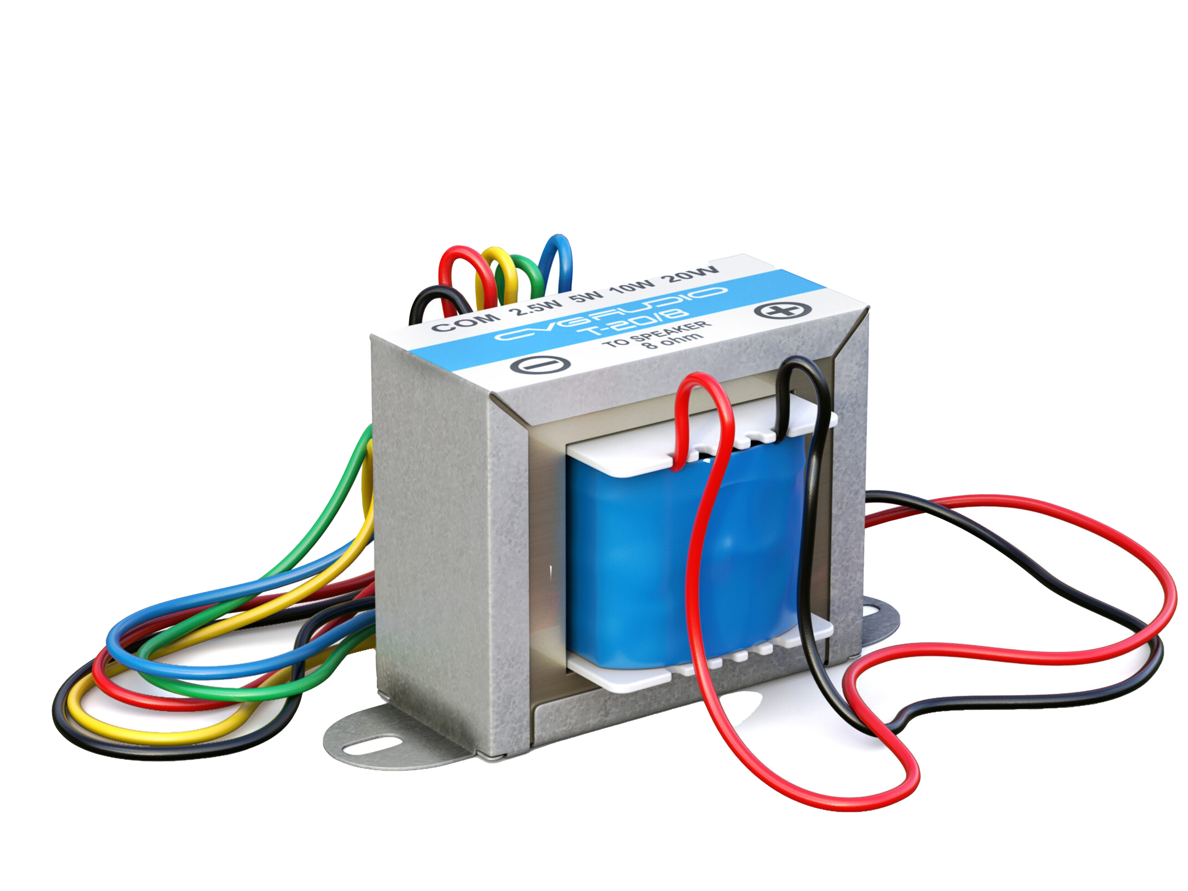 CVGAUDIO T-20/8 - трансформатор понижающий для подключения 8ohm акустических систем к 100V трансляционной линии, мощность 20/10/5/2,5W — 100V. Габаритный размер — 76mm x 45mm x 42mm, посадочные отверстия (диаметр) 4mm, расстояние между отверстиями – 63mm, вес – 350g