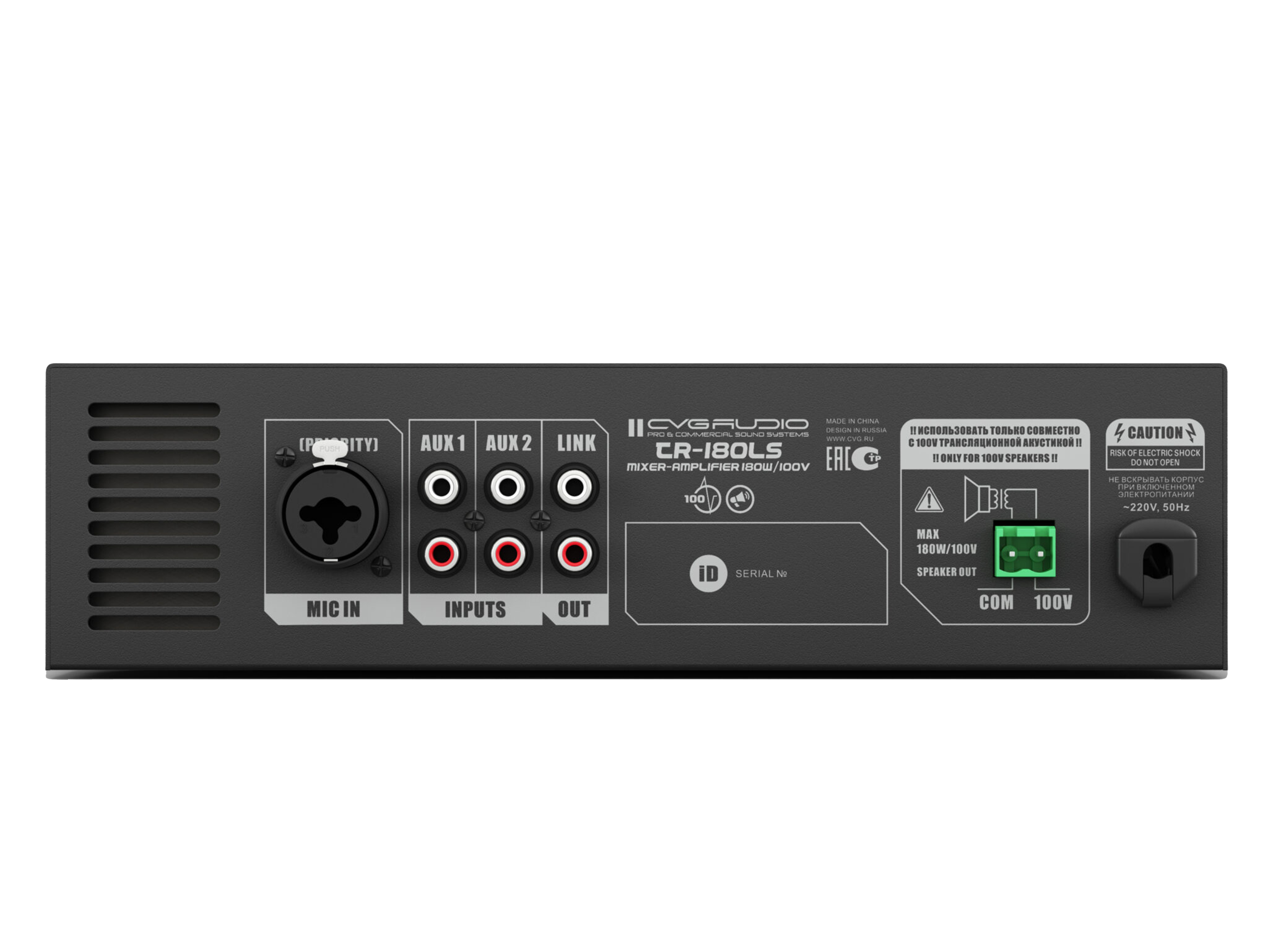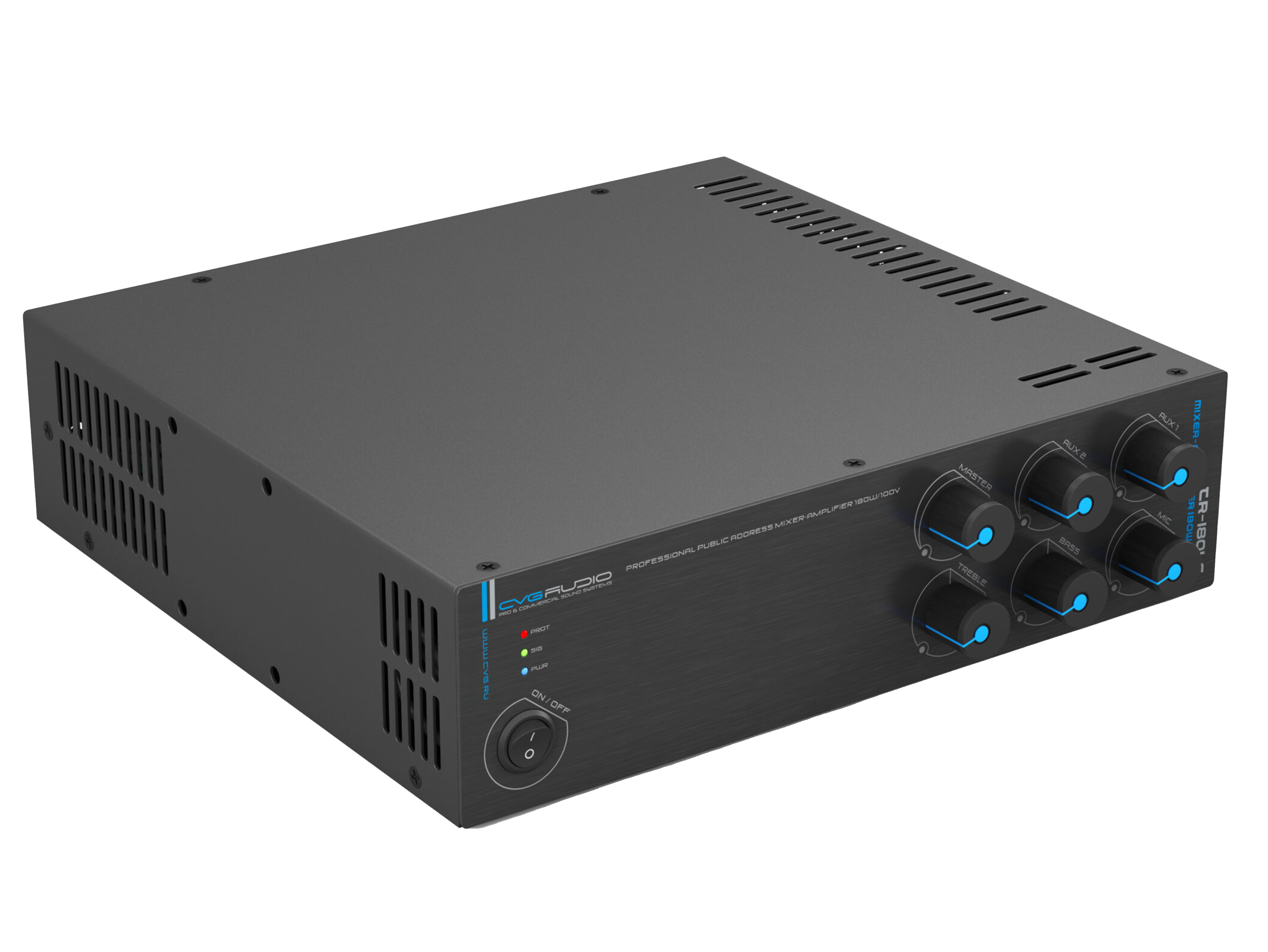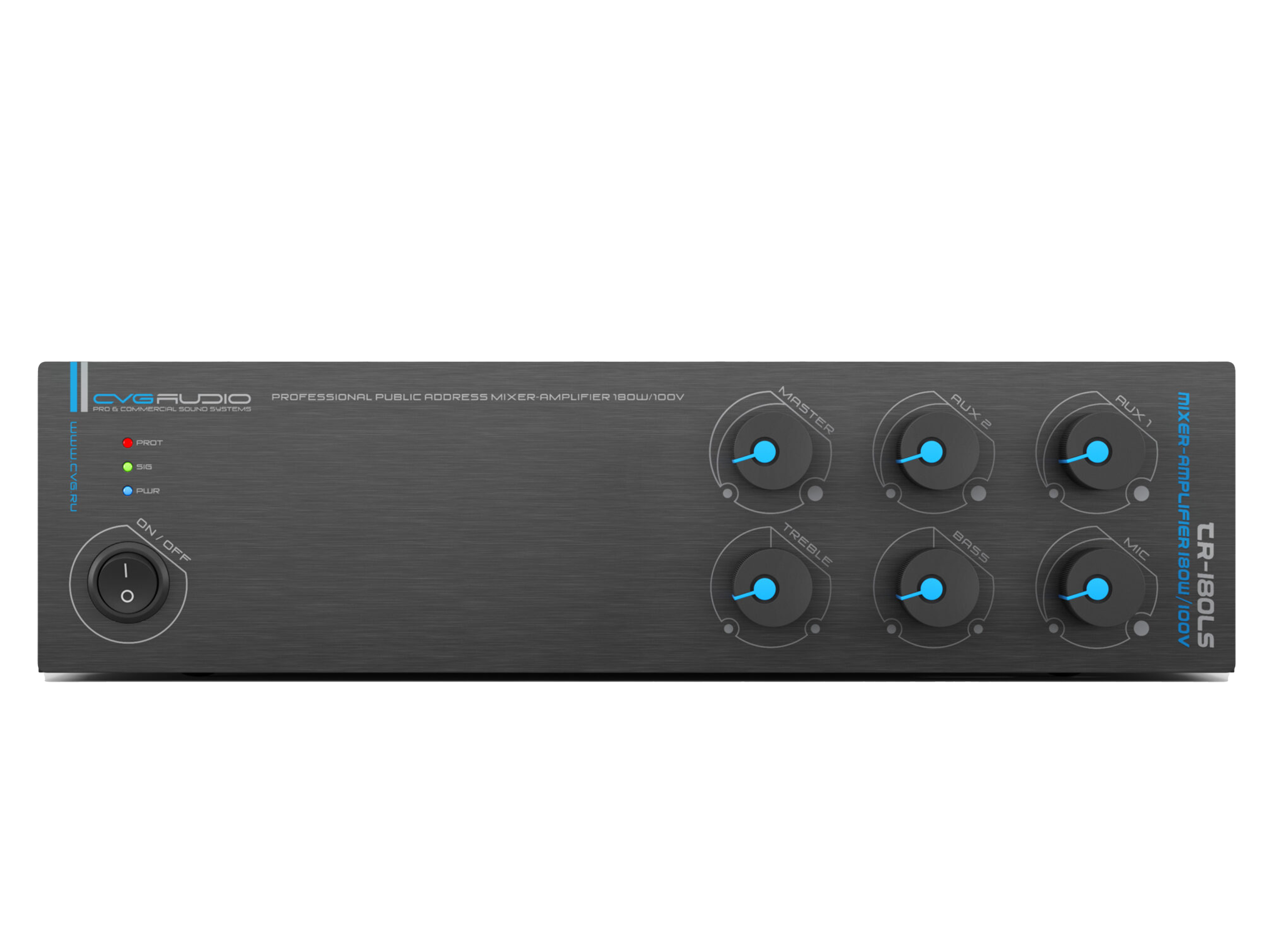 Миниатюрный настольный / настенный Public Address микшер — усилитель 180W/100V Два линейных входа (Aux In) – 2 х 2RCA, один микрофонный вход – XLR/TSR 6,35mm (Mic In), микрофонный вход имеет приоритет над линейными входами. Регуляторы уровня высоких и низких частот, регулировка уровня линейных и микрофонного входов, громкость Master на лицевой панеле. Габаритные размеры: 250mm х 65mm х 200mm.