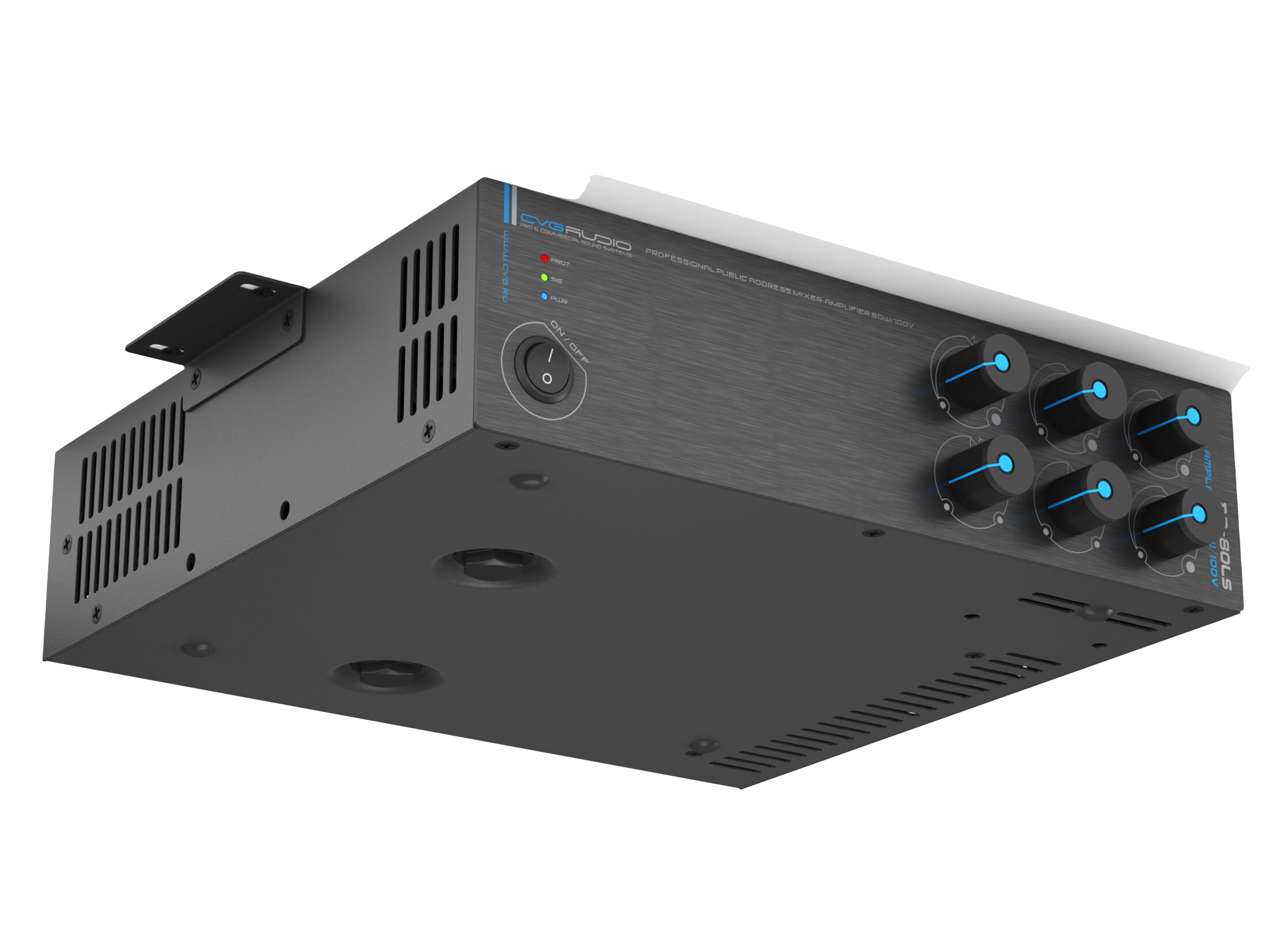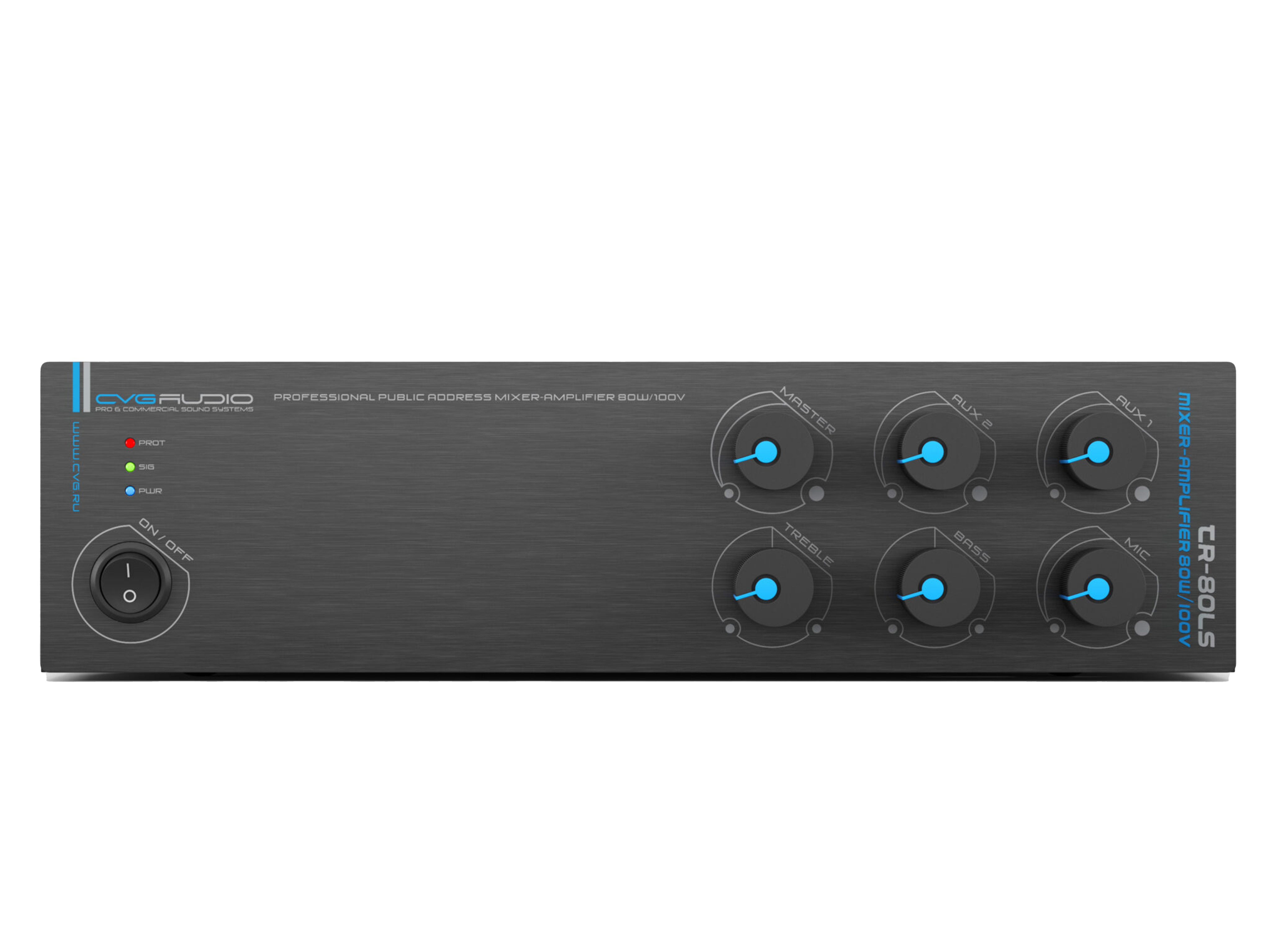 Миниатюрный настольный/настенный Public Address микшер — усилитель 80W/100V Два линейных входа (Aux In) – 2 х 2RCA, один микрофонный вход – XLR/TSR 6,35mm (Mic In), микрофонный вход имеет приоритет над линейными входами. Регуляторы уровня высоких и низких частот, регулировка уровня линейных и микрофонного входов, громкость Master на лицевой панеле. Габаритные размеры: 250mm х 65mm х 200mm.
