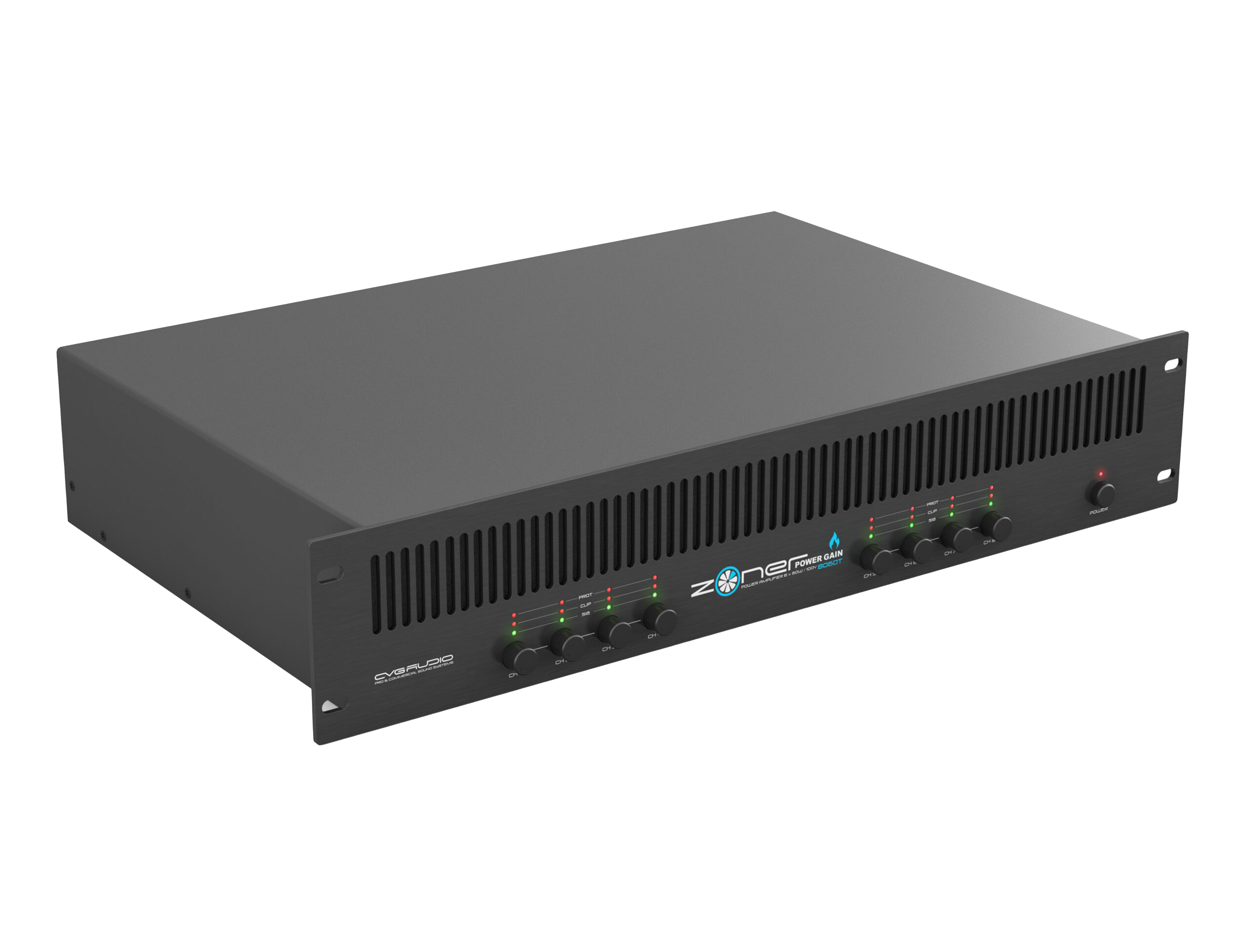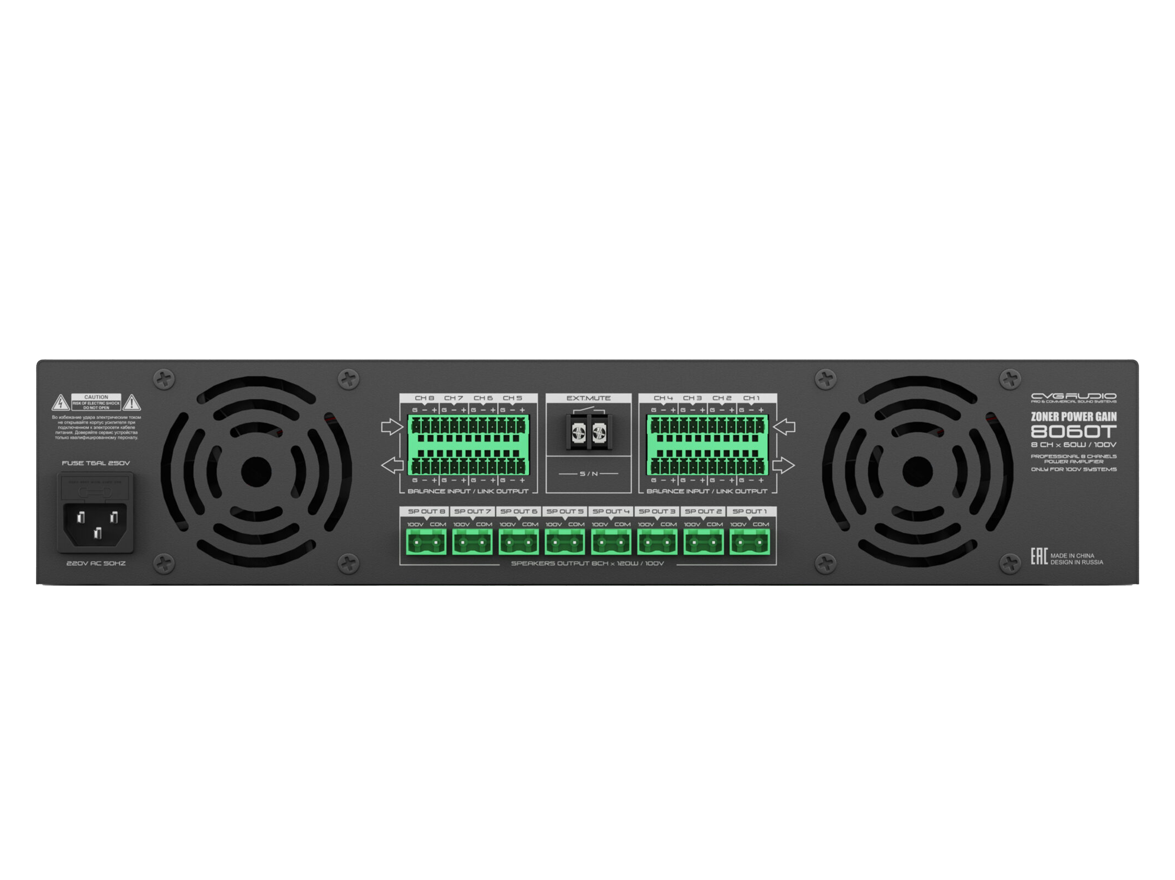 8-ми канальный трансляционный усилитель мощности. Предназначен только для работы в составе 100V трансляционных систем. Мощность 8x60W/100V. Работает в D-class. Балансный вход и сквозной балансный выход на 3-pin разъемах EURO-BLOCK, аварийные контакты управления — EXT.MUTE, 2U
