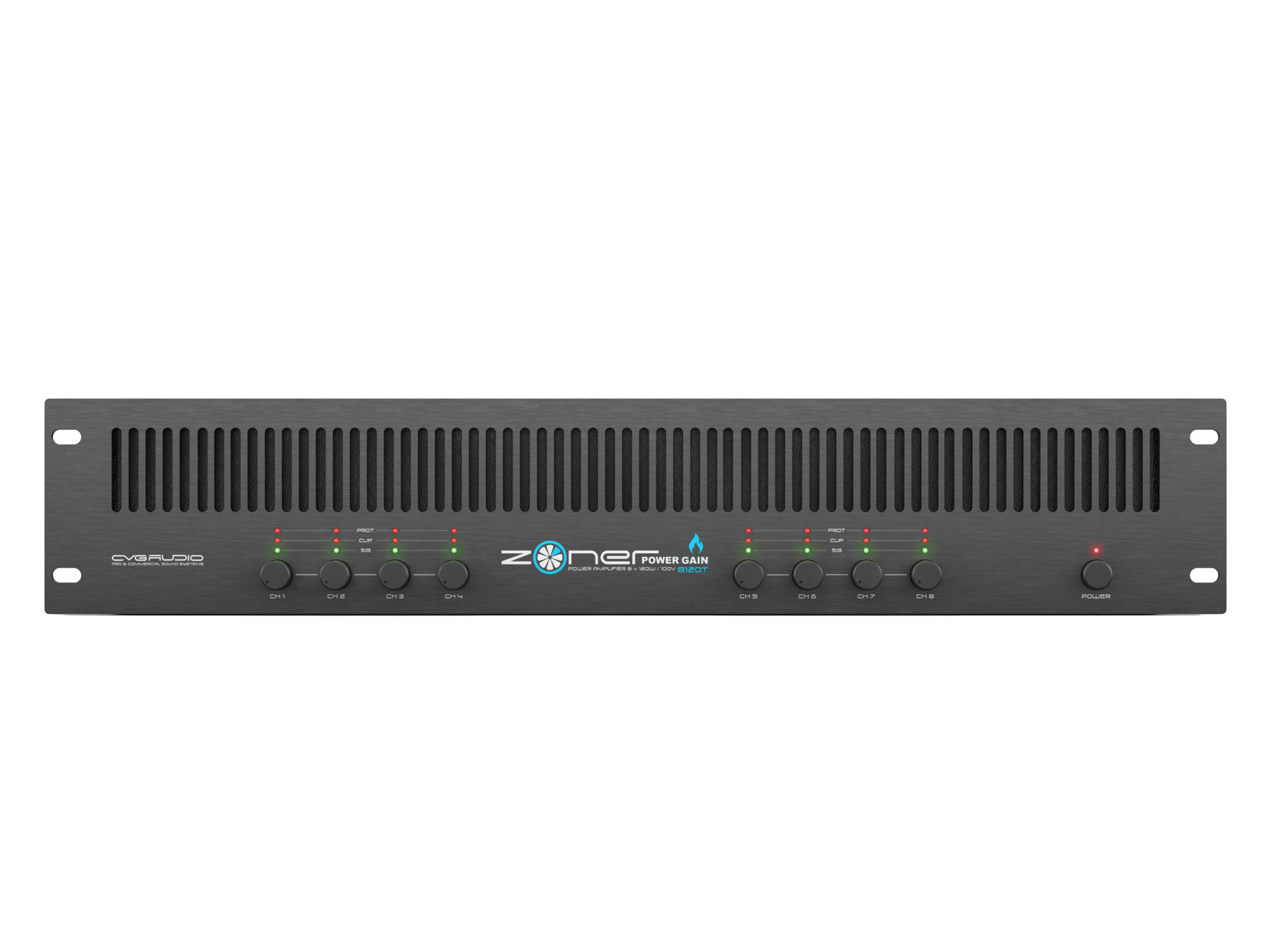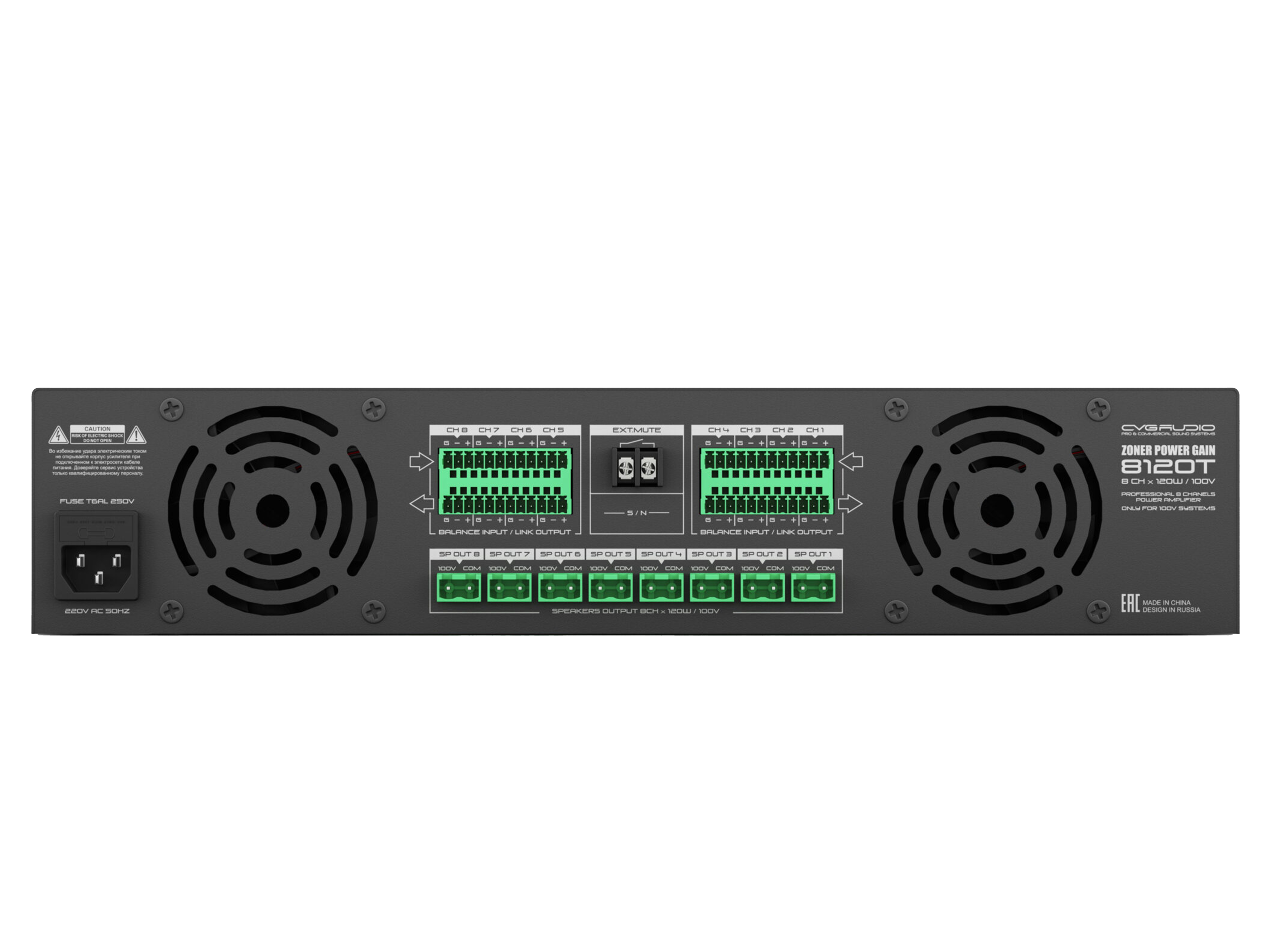 8-ми канальный трансляционный усилитель мощности. Предназначен только для работы в составе 100V трансляционных систем. Мощность 8x120W/100V. Работает в D-class. Балансный вход и сквозной балансный выход на 3-pin разъемах EURO-BLOCK, аварийные контакты управления — EXT.MUTE, 2U