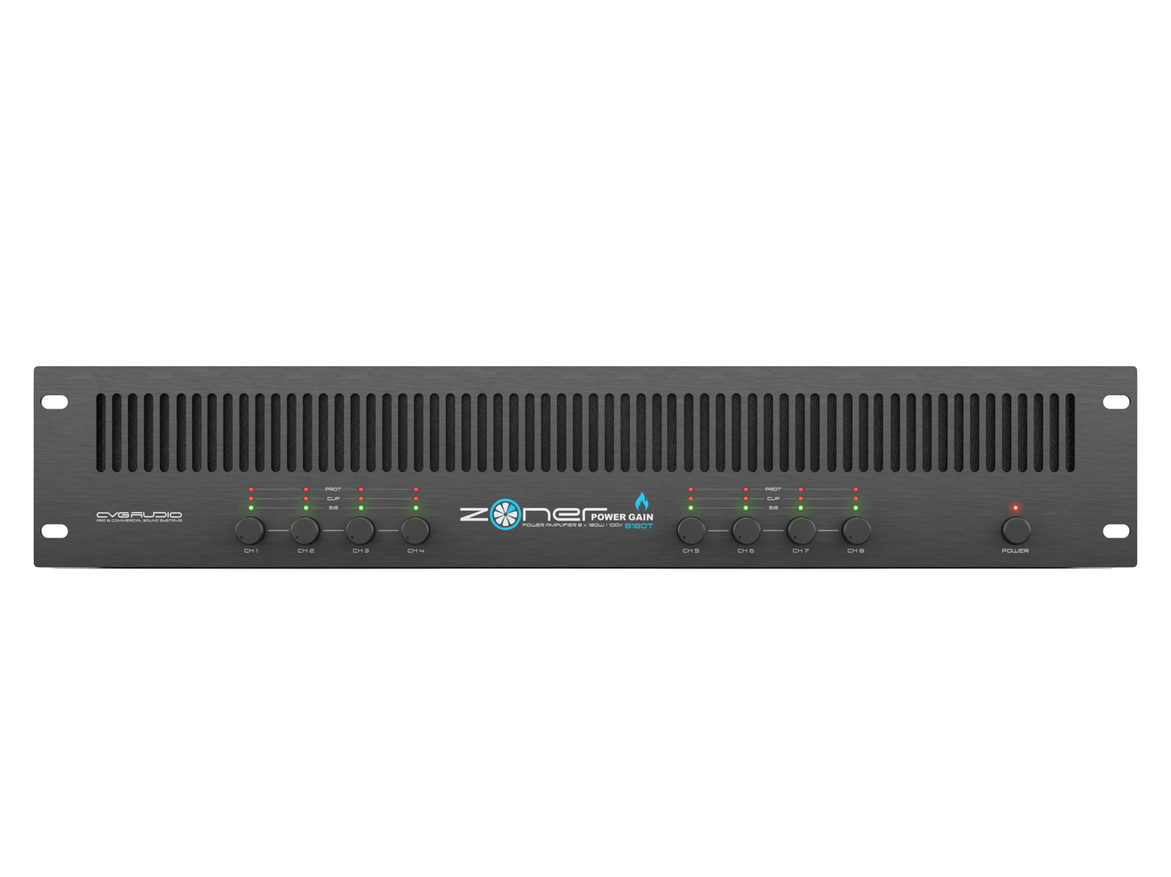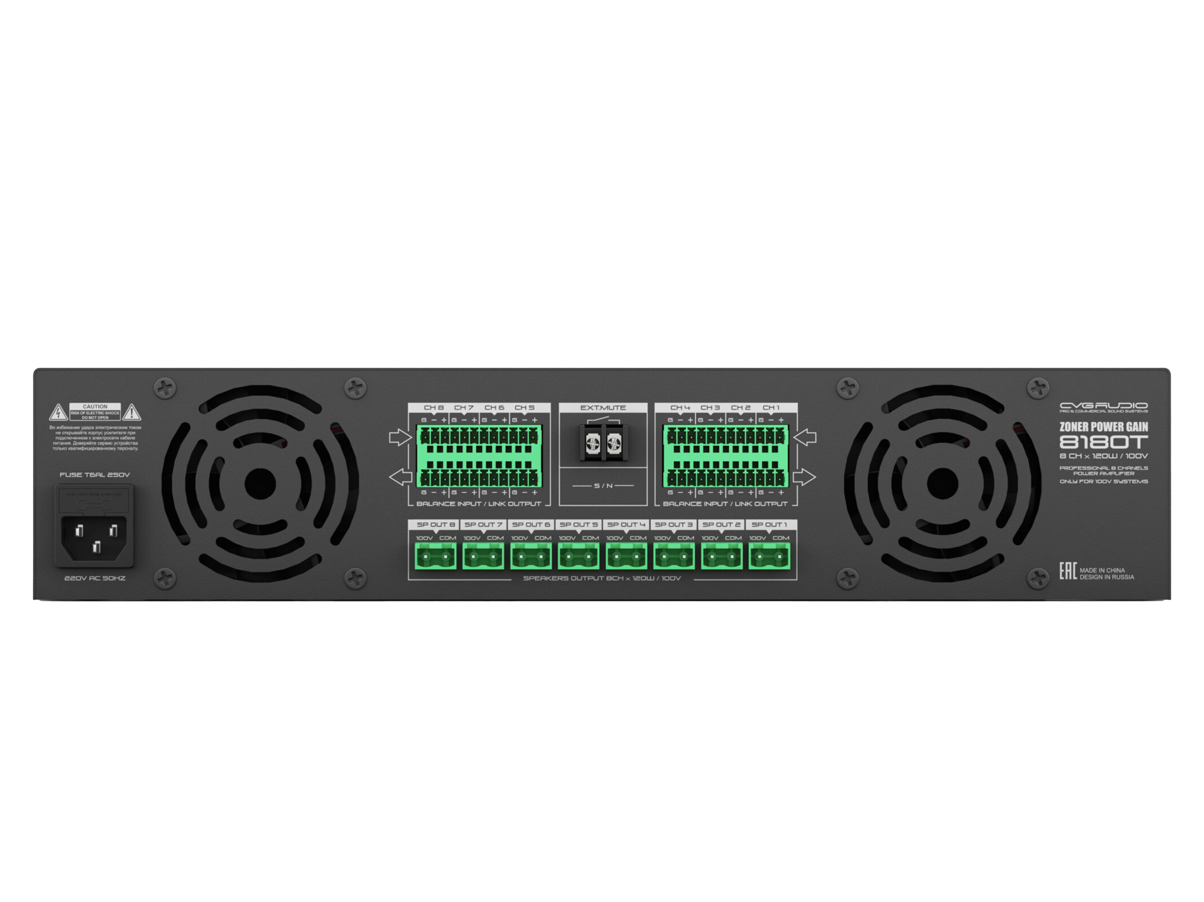 8-ми канальный трансляционный усилитель мощности. Предназначен только для работы в составе 100V трансляционных систем. Мощность 8x180W/100V. Работает в D-class. Балансный вход и сквозной балансный выход на 3-pin разъемах EURO-BLOCK, аварийные контакты управления — EXT.MUTE, 2U