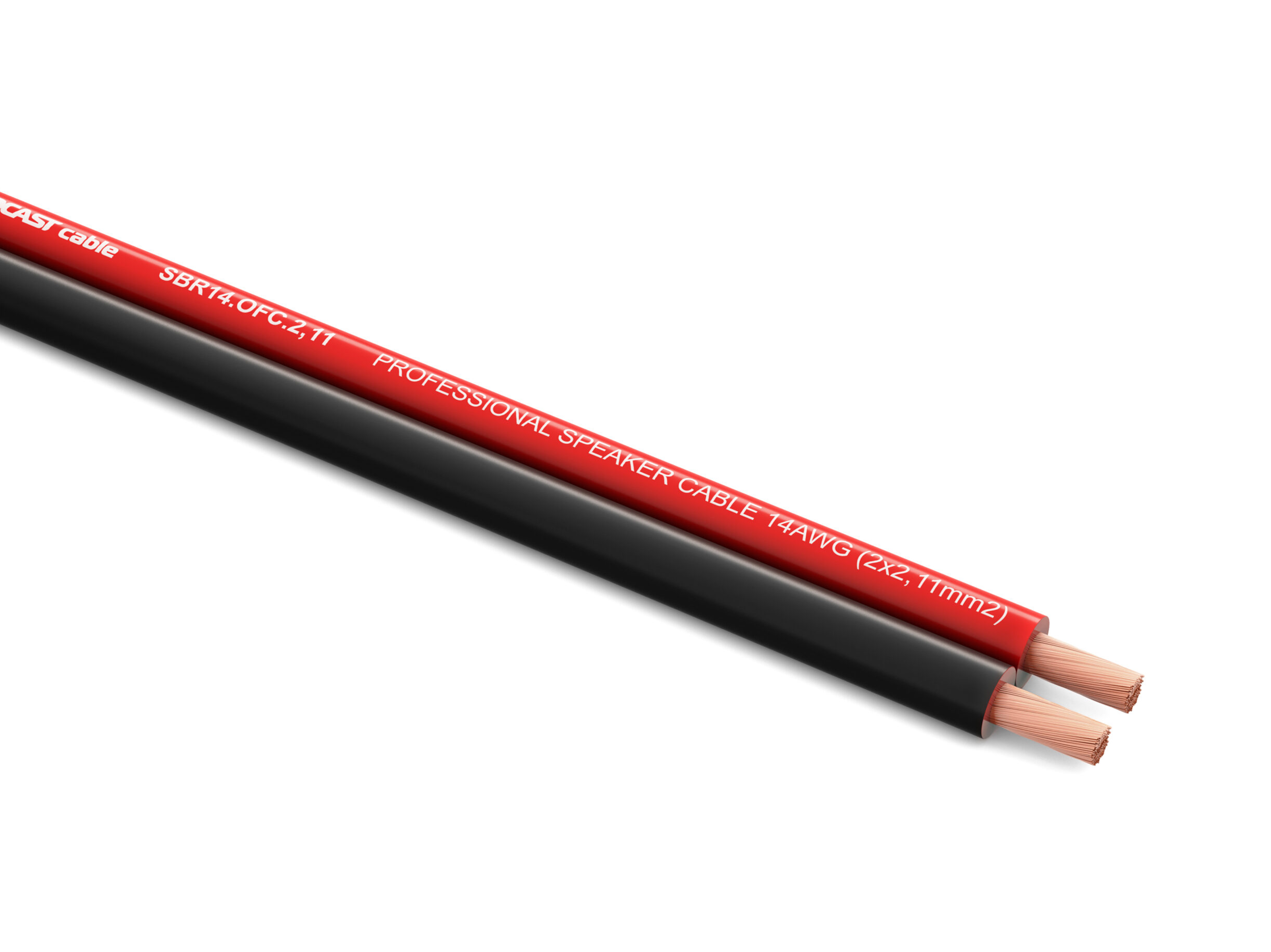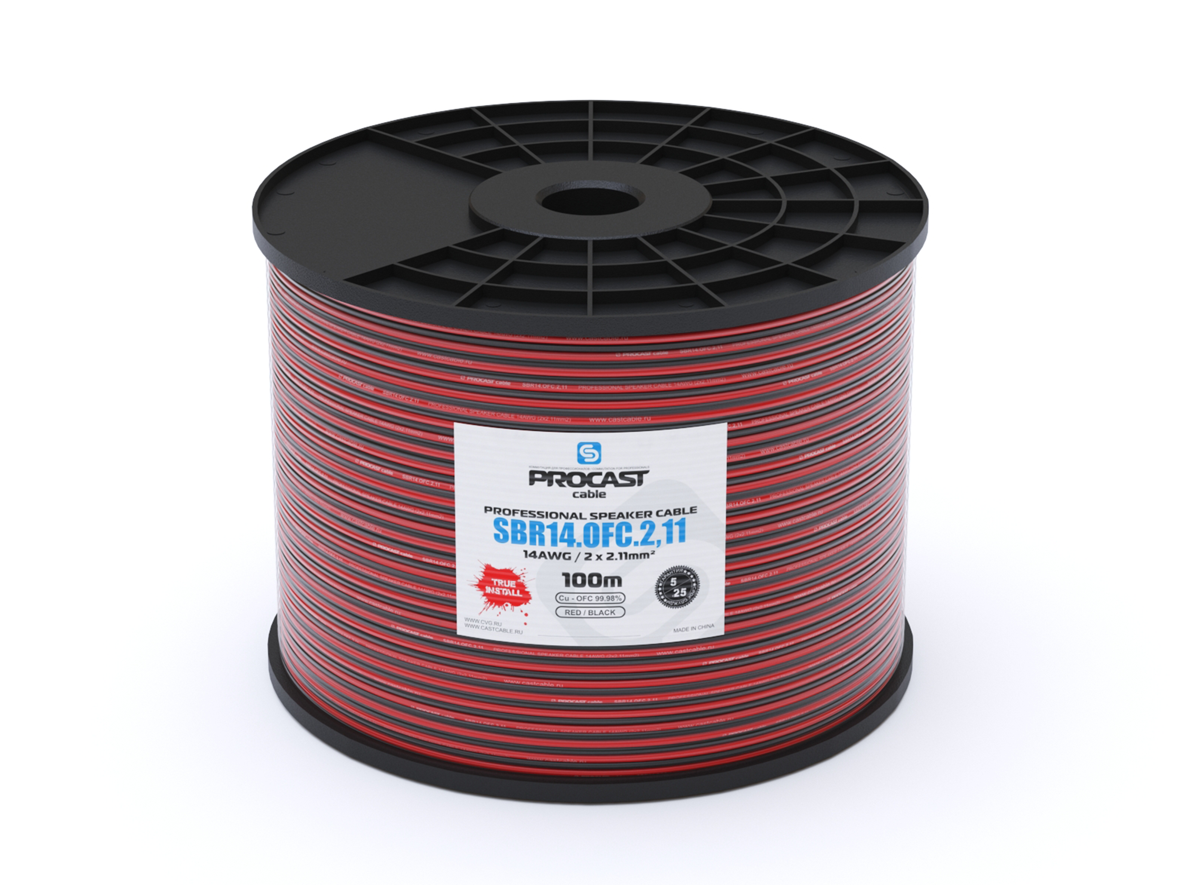 Профессиональный инсталляционный спикерный (акустический) кабель, 14AWG(2×2,11mm2), красно-черная PVC изоляция, безкислородная медь 7*15/0,16mm OFC (99,97%), бухта 100m