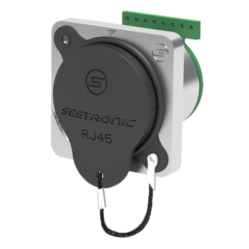 SE8FD05-23-22 – панельный разъем etherCON RJ45 CAT5e (розетка). Корпус с защитой класса IP65. Устанавливается на заднюю сторону панели, задняя часть разъема — печатная плата для пайки. Контакты покрыты золотом. Цвет корпуса серебро.