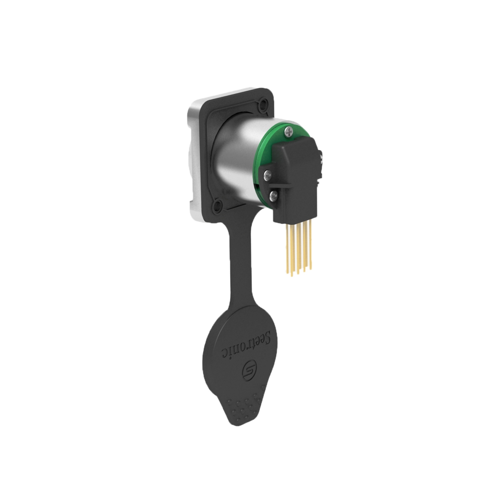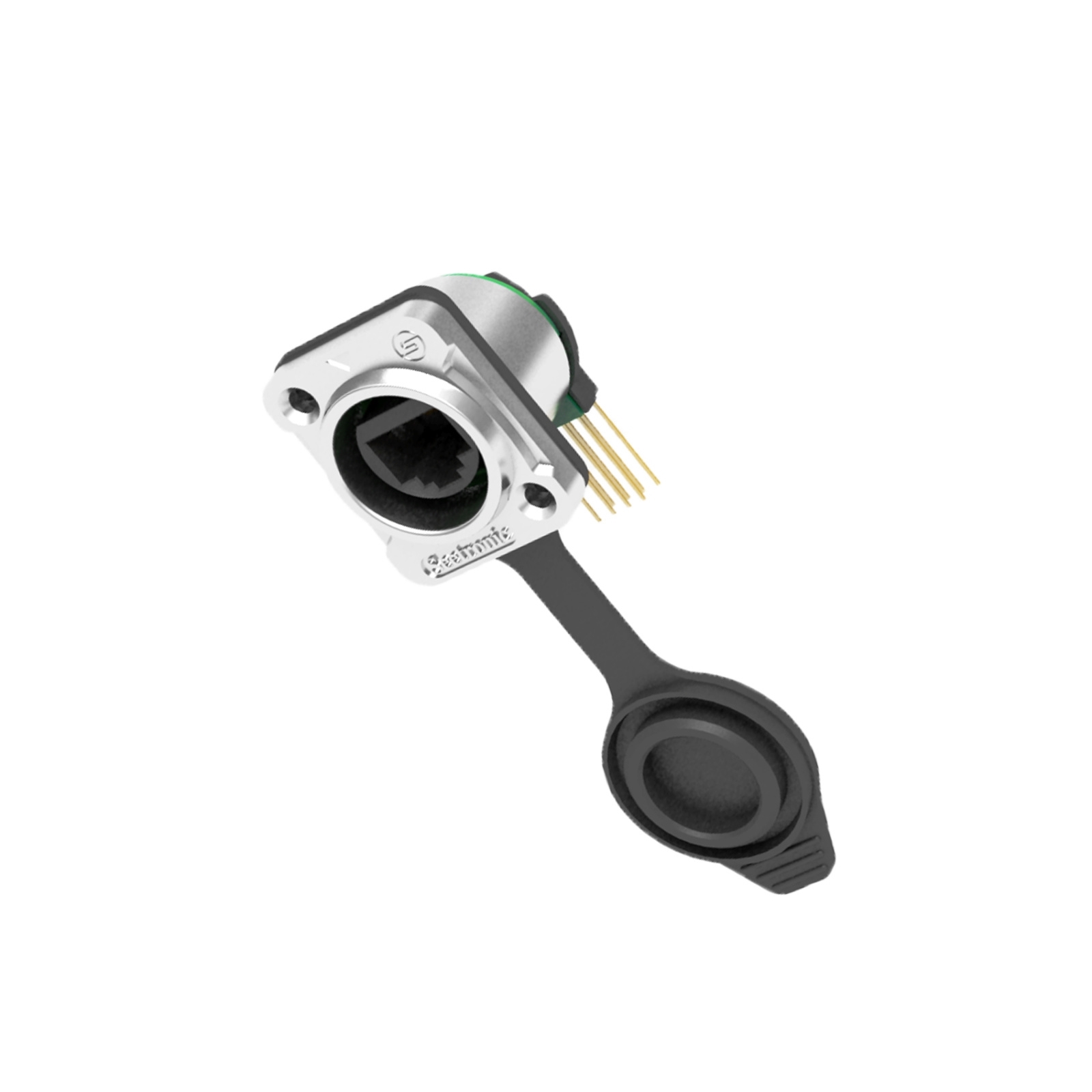 SE8FD05-30 – панельный разъем etherCON RJ45 CAT5e (розетка) с фланцем типа D. Корпус с защитой класса IP65. Устанавливается на переднюю сторону панели, задняя часть разъема — печатная плата для пайки с настройкой длины иглы. Контакты покрыты золотом. Цвет корпуса серебро.