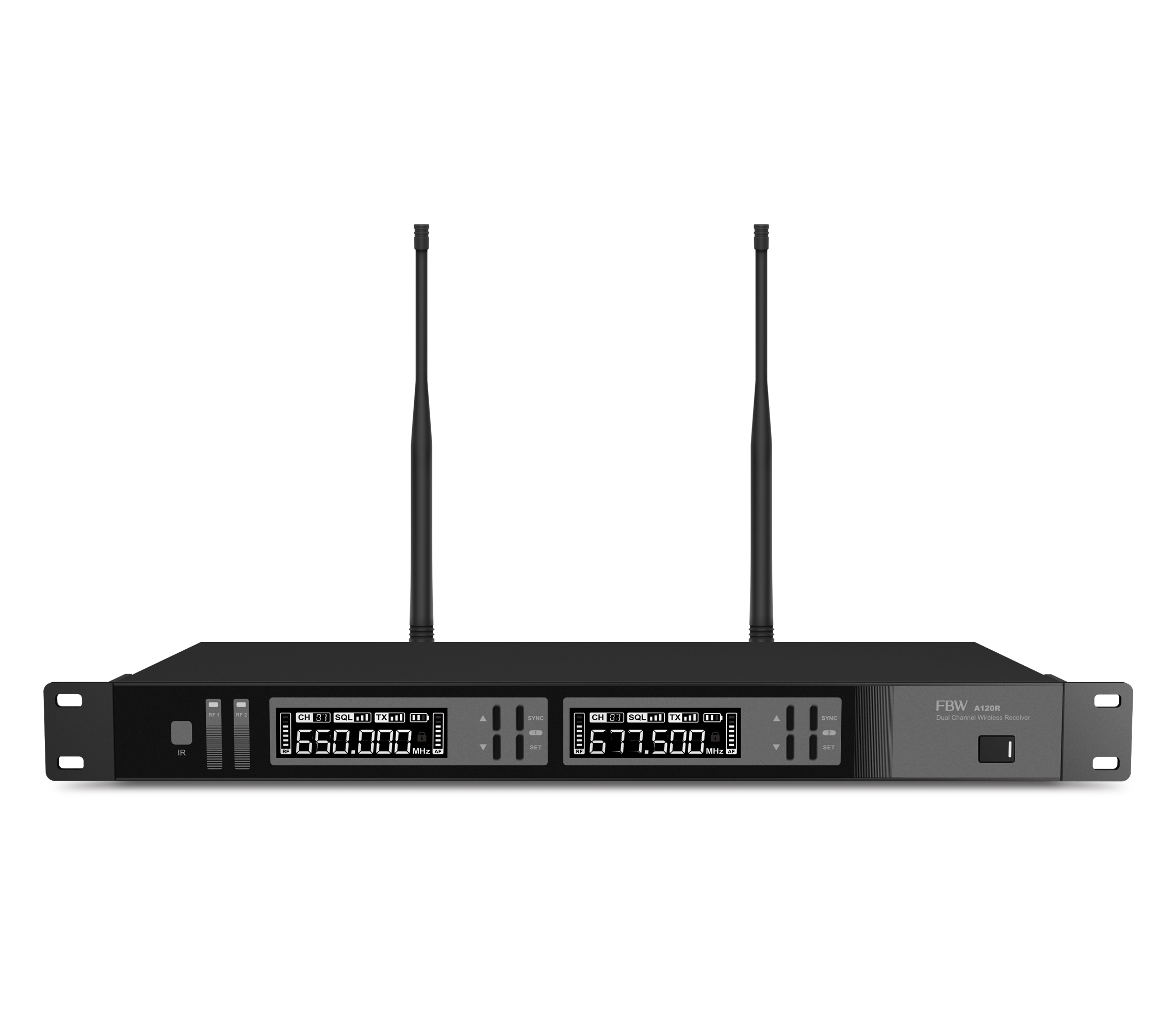 FBW A120R двухканальный приёмник, 512-562МГц, FM-модуляция,регулируемый Squelch, индикация разряда батареи передатчика, 50Гц-15кГц.