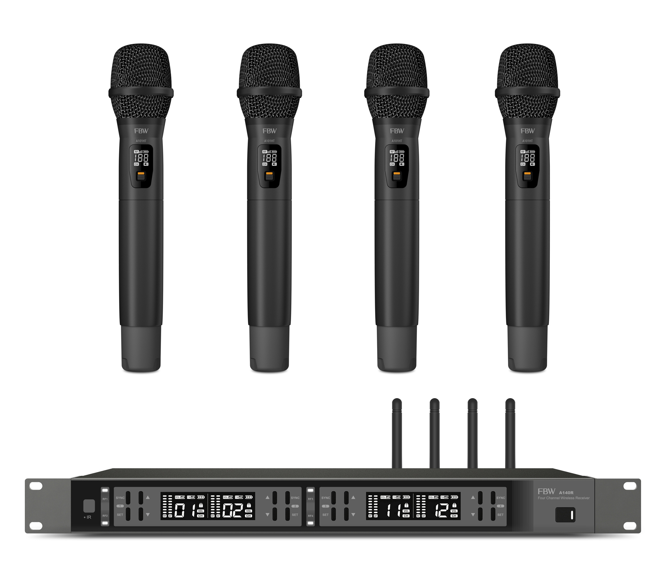 Представленная радиосистема представляет собой четырехканальную установку, сочетающую высококачественный приемник A140R и четыре передатчика A101HT, оснащенных всеми необходимыми функциями для профессионального использования.